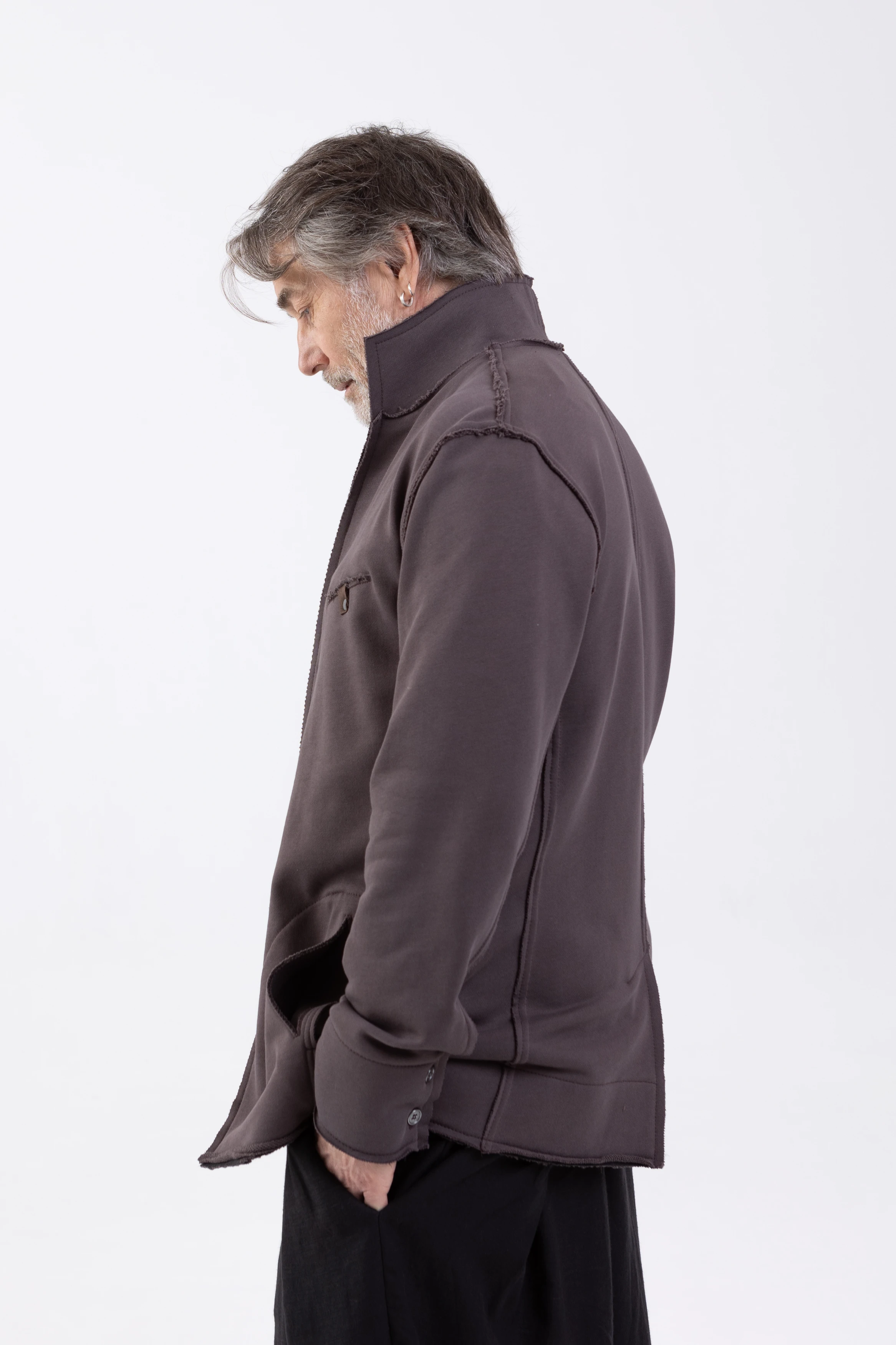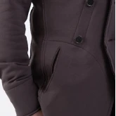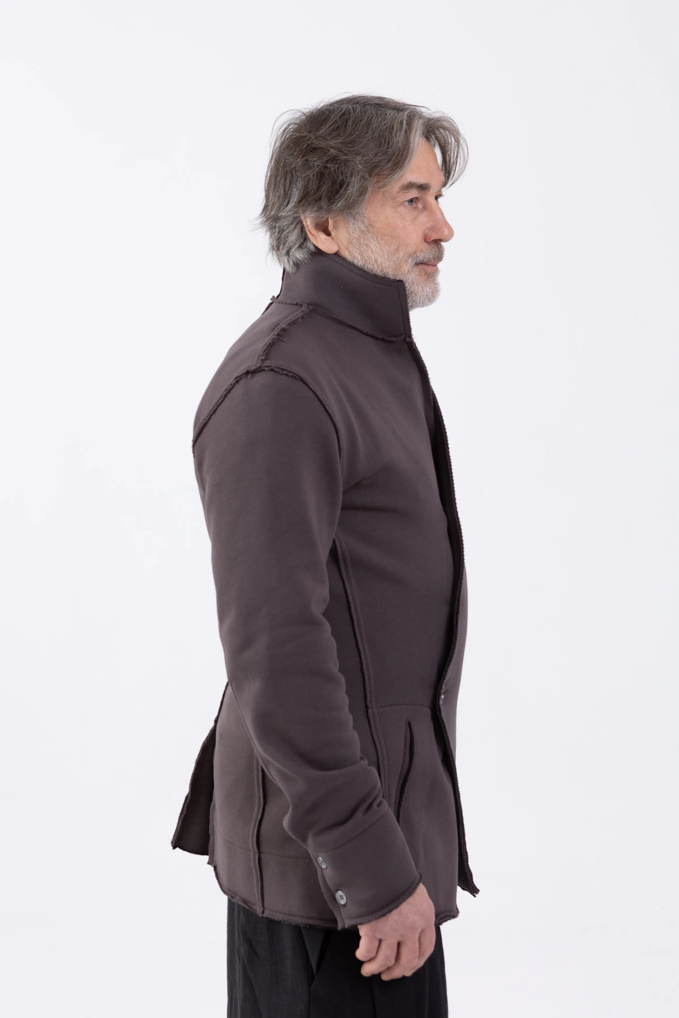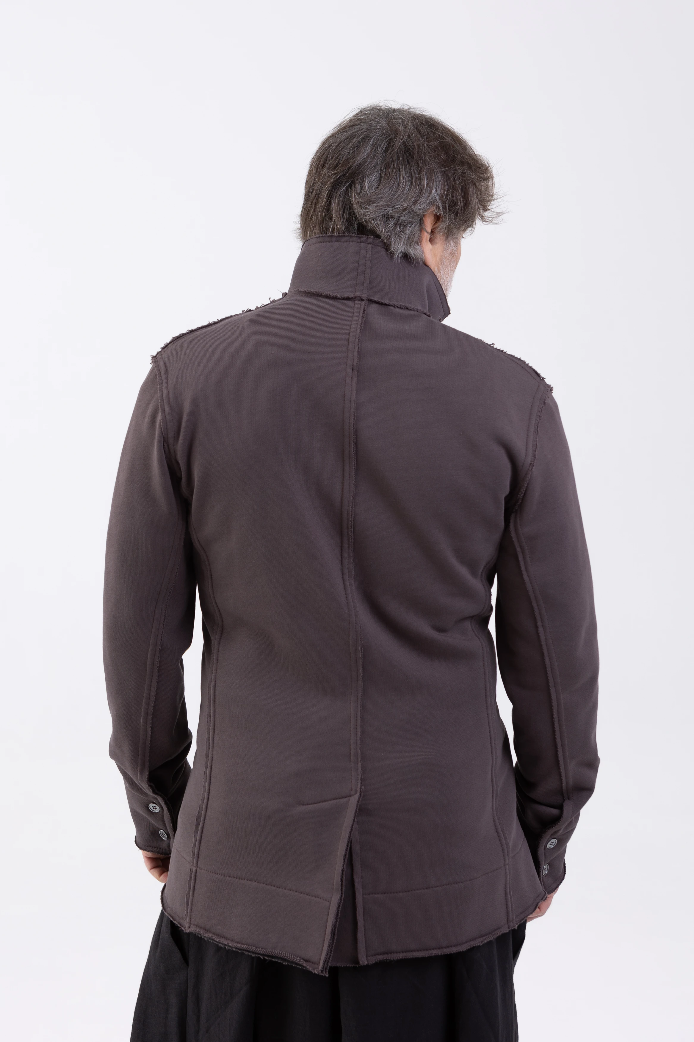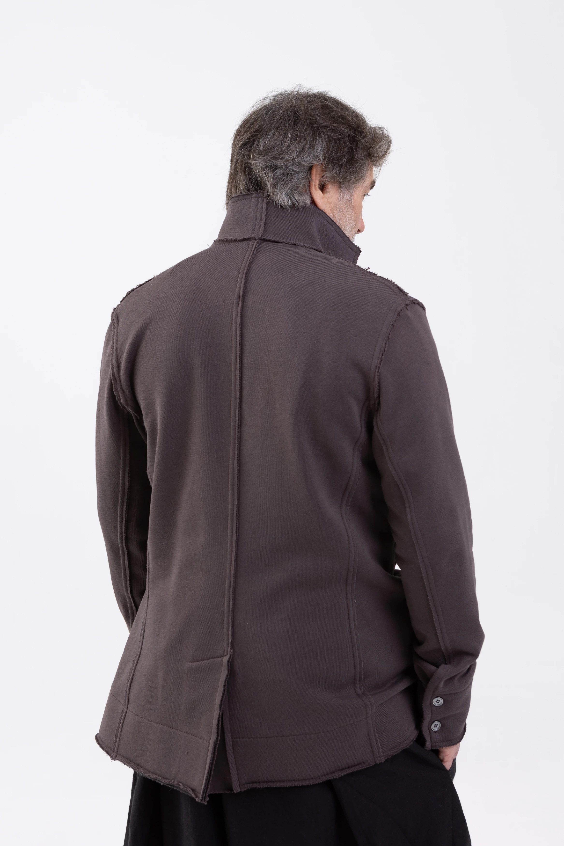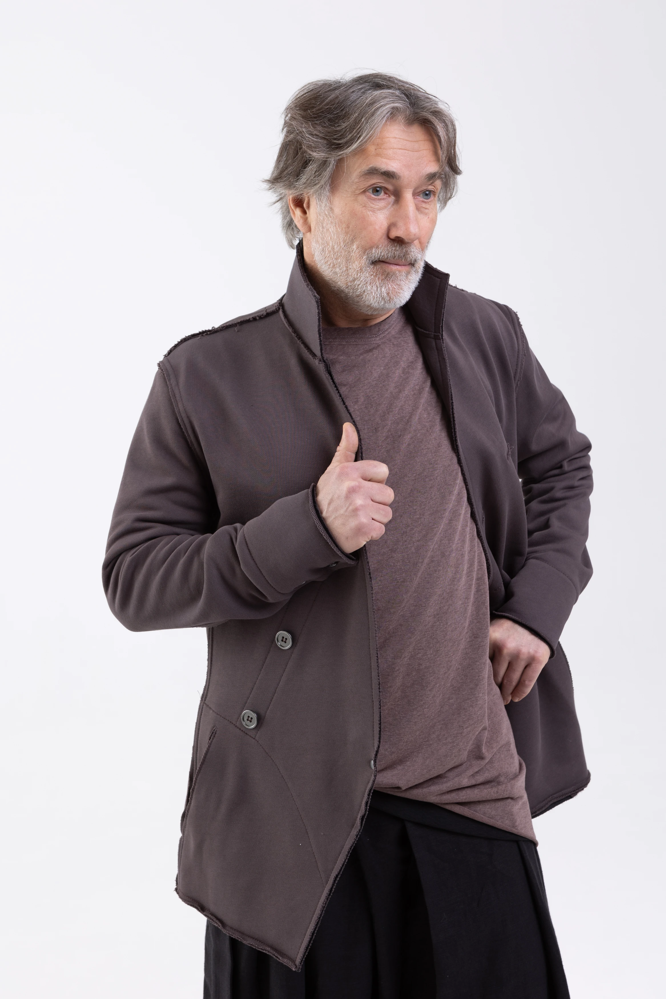 Жакет из плотного трикотажа приталенный, полуприлегающего силуэта. Двубортный, с диагональной застёжкой на пуговицах и дополнительной фиксацией внутреннего борта на маленькую кнопку.