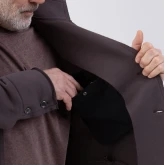 Два внешних прорезных кармана в передней части. В верхней части полочки — имитация нагрудного кармана, под которым скрывается внутренний карман.