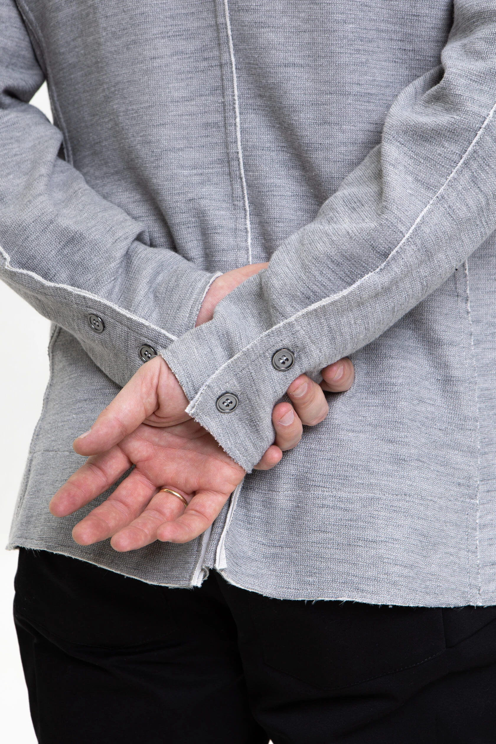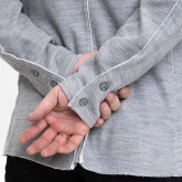 Воротник-стойка отрезной. Рукав втачной, с одним локтевым швом и цельнокроёным манжетом на пуговицах.