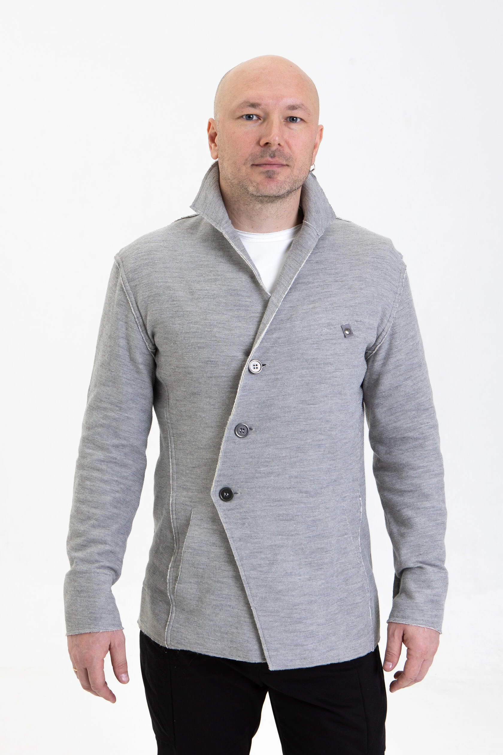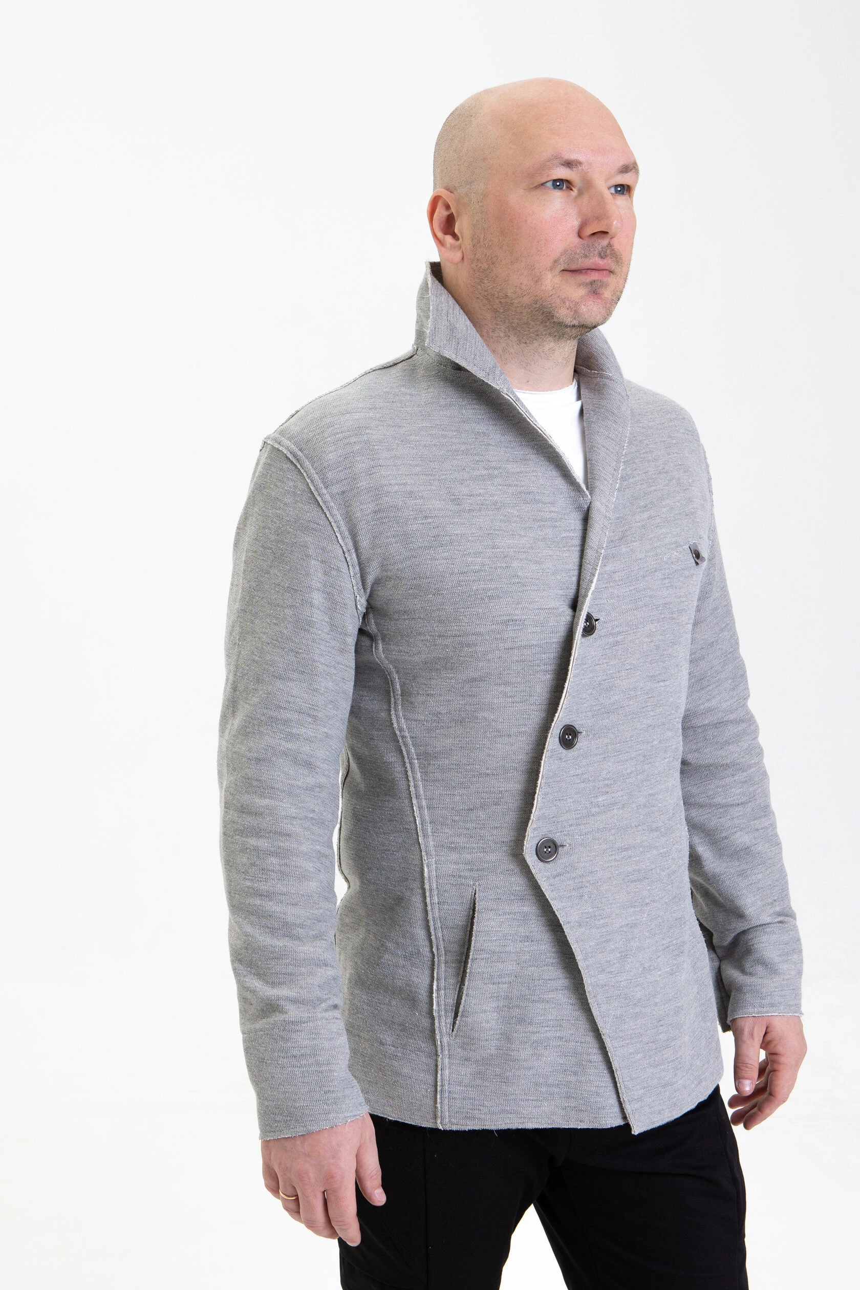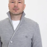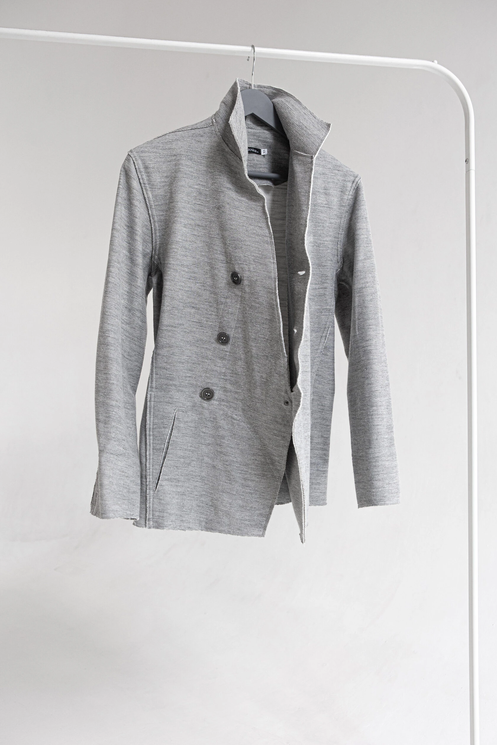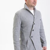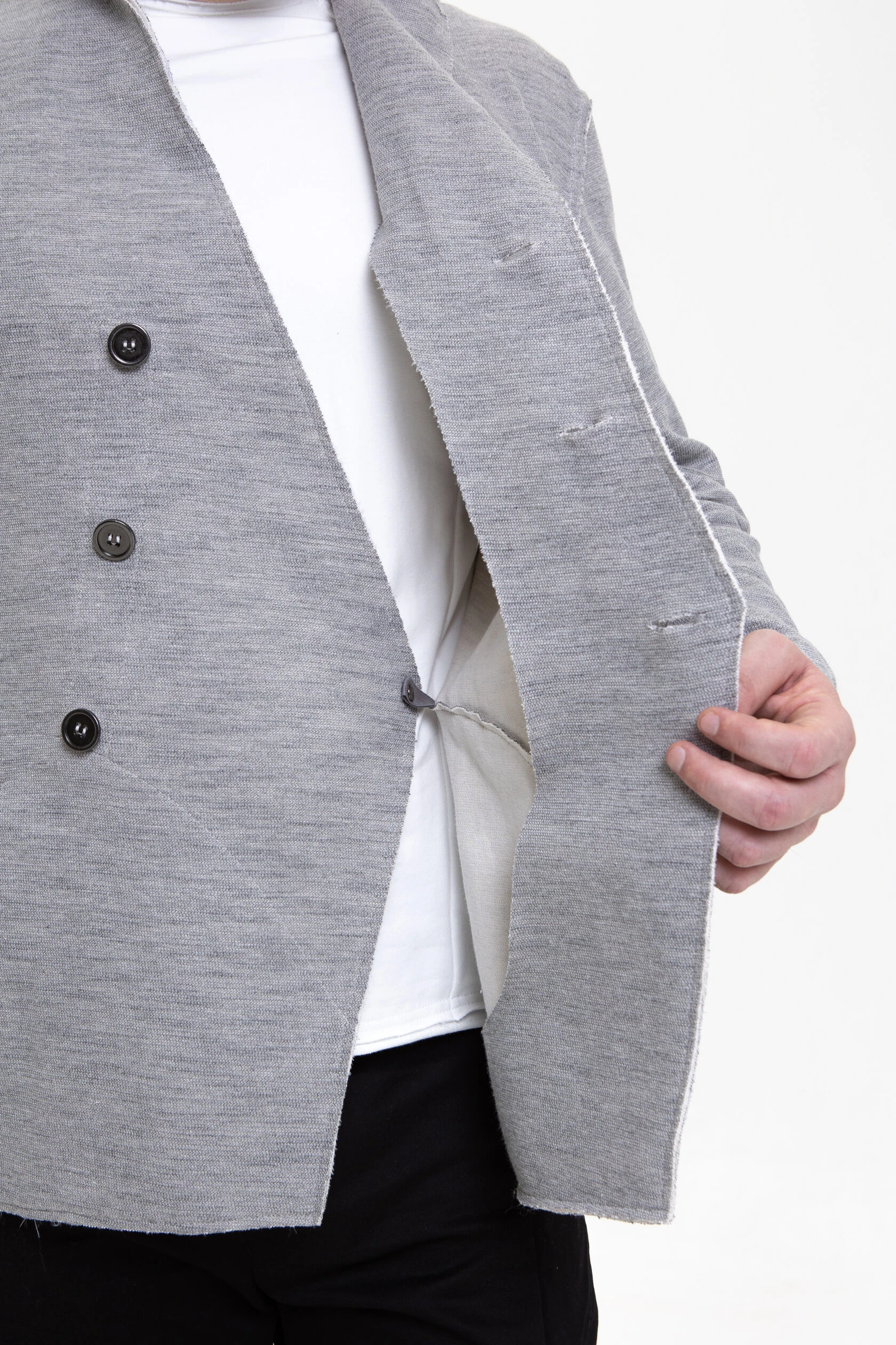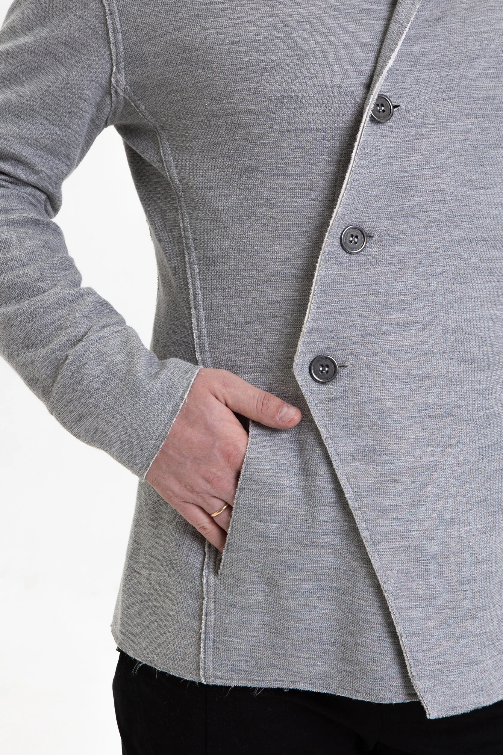 Жакет из плотного трикотажа, приталенный, полуприлегающего силуэта, двубортный, с диагональной застёжкой на пуговицах и дополнительной фиксацией внутреннего борта на маленькую кнопку.