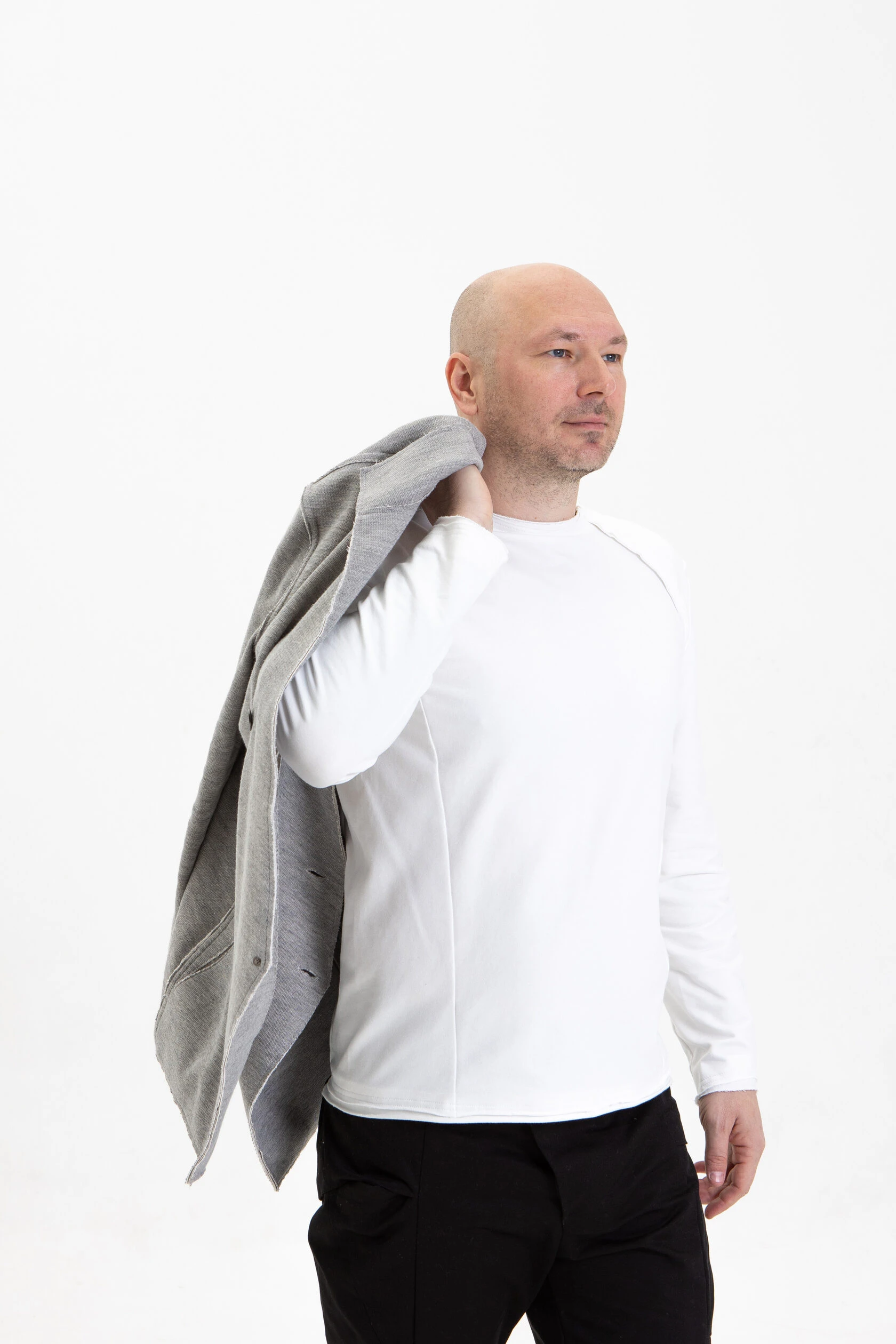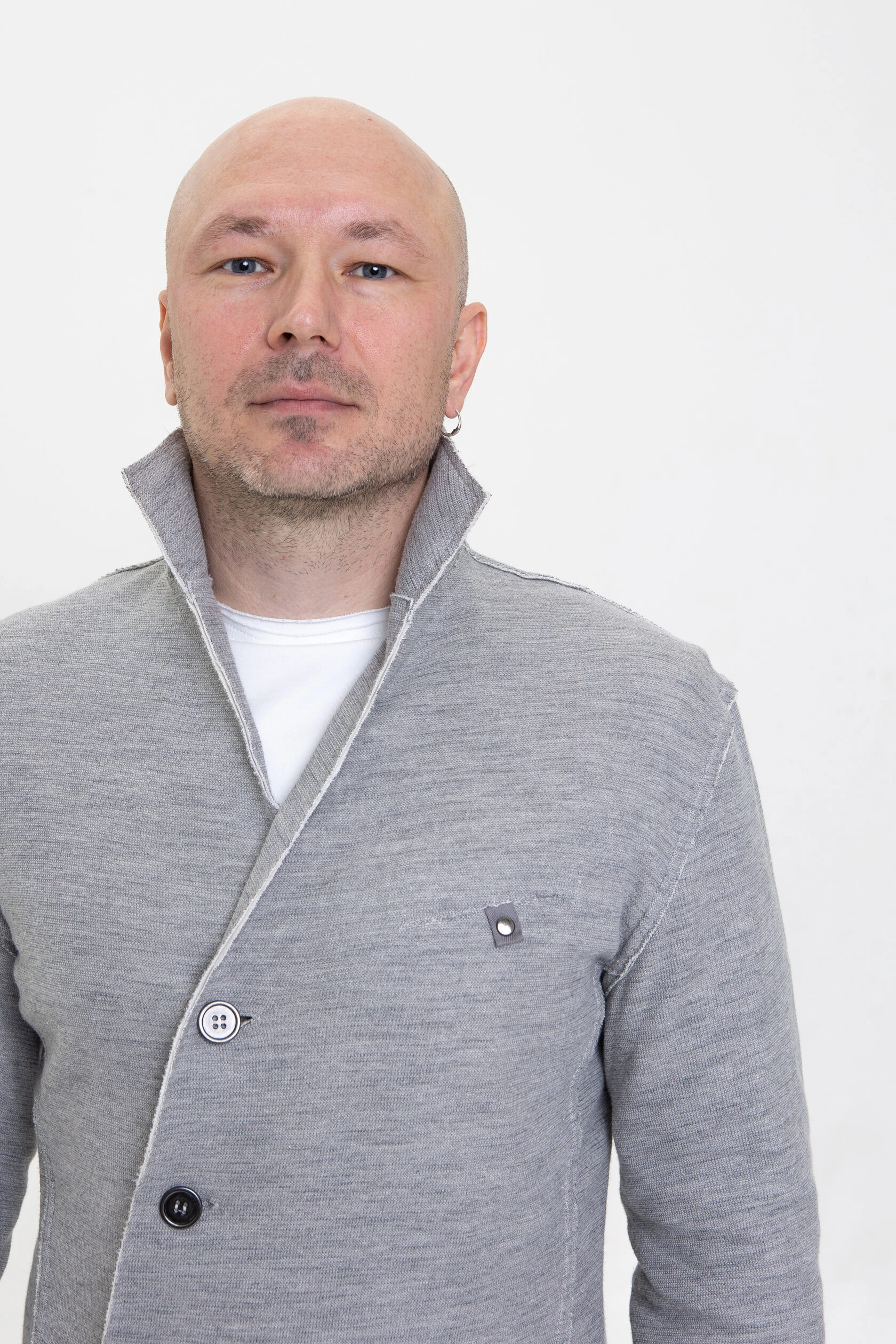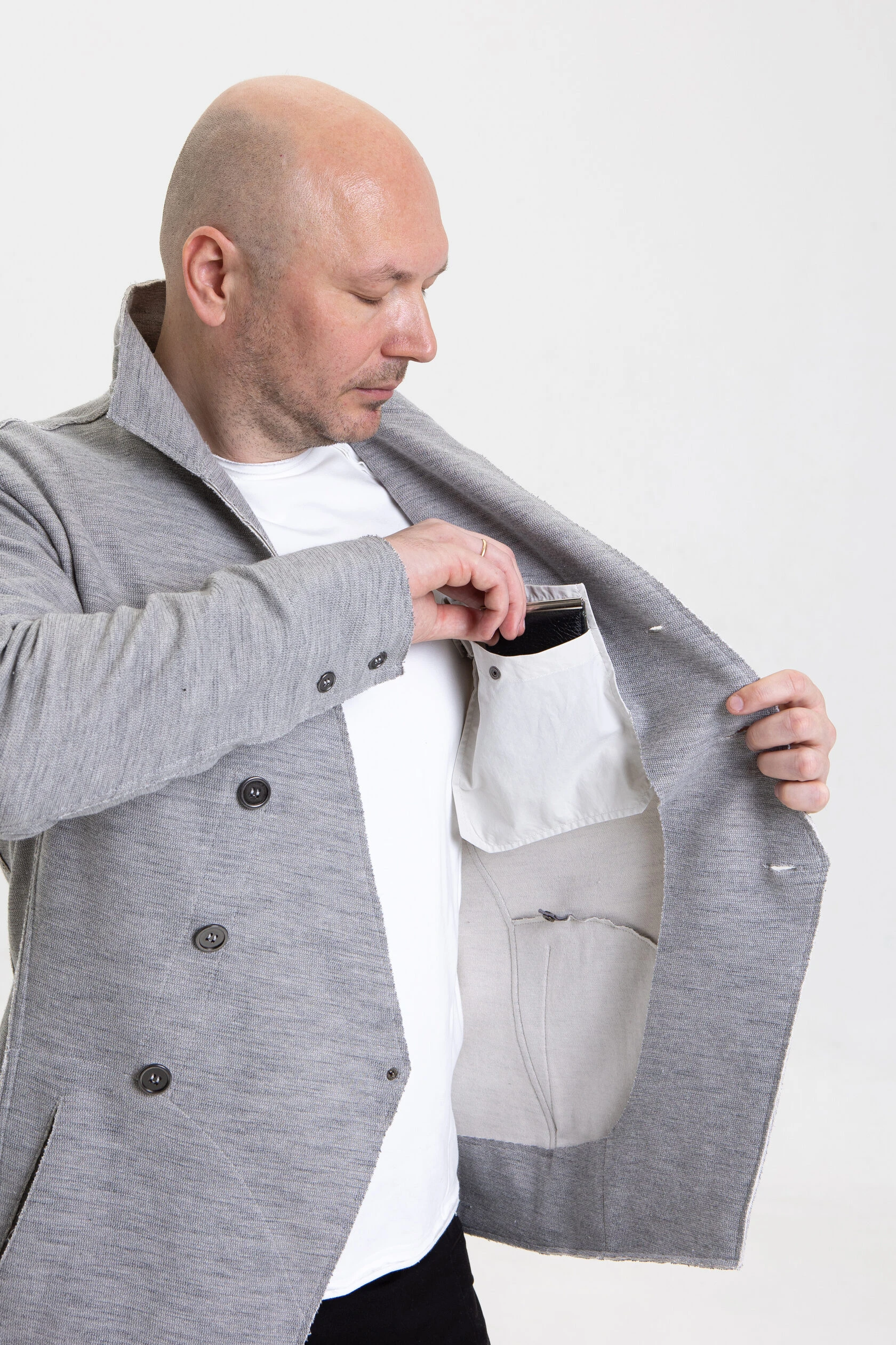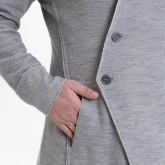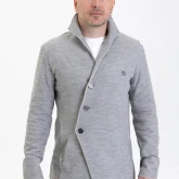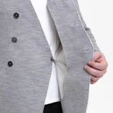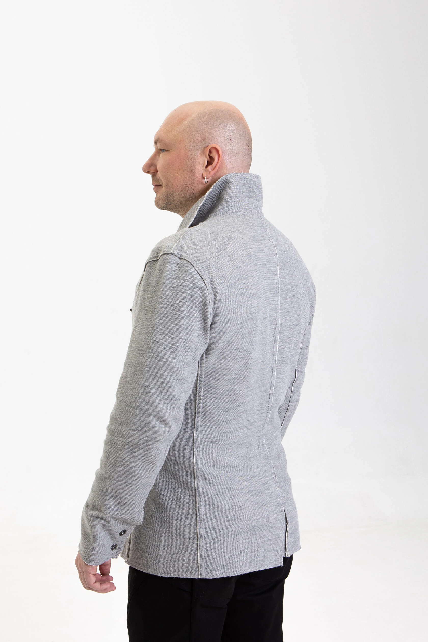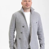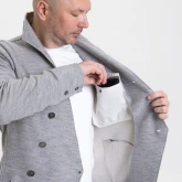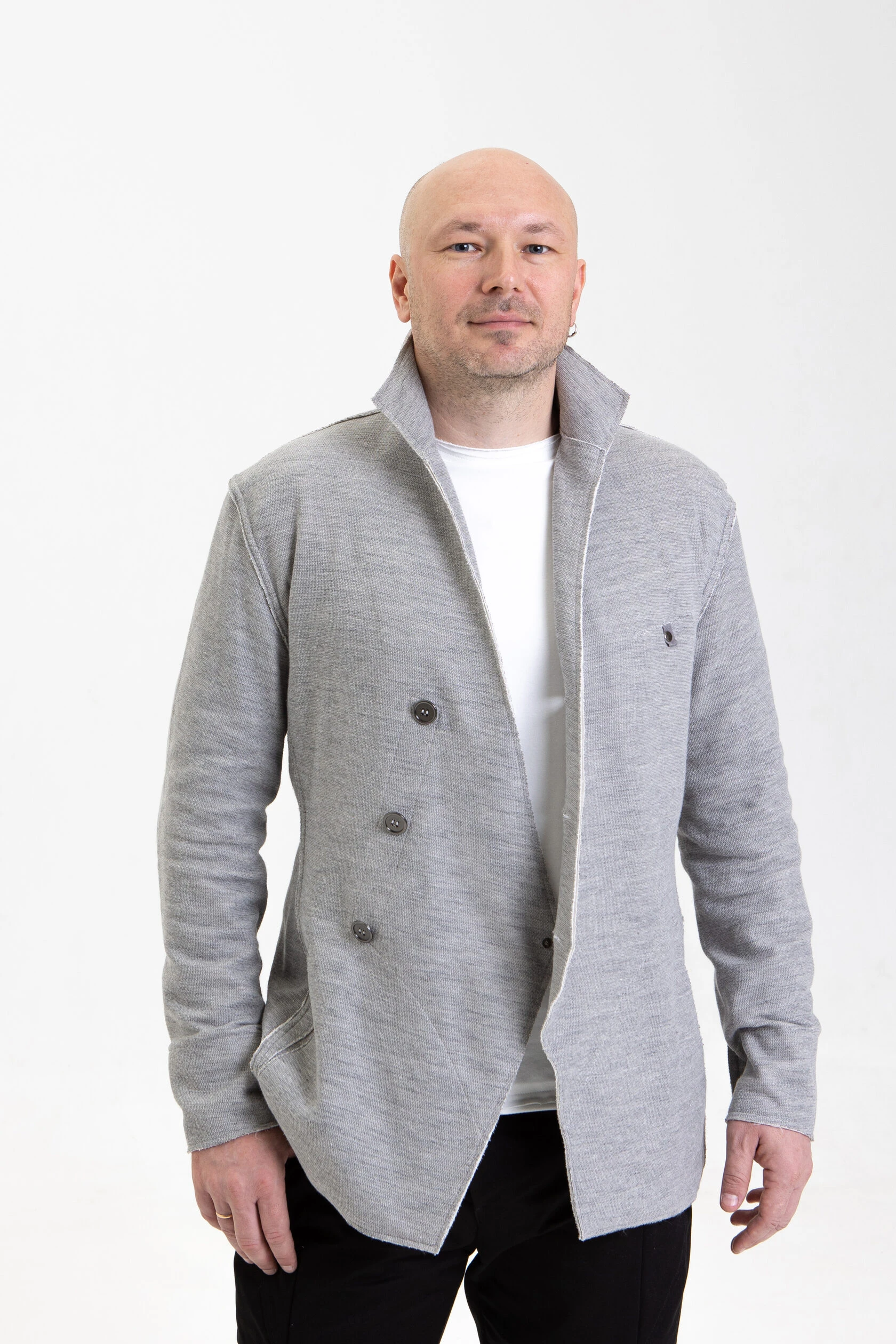 Жакет из плотного трикотажа, приталенный, полуприлегающего силуэта, двубортный, с диагональной застёжкой на пуговицах и дополнительной фиксацией внутреннего борта на маленькую кнопку.