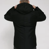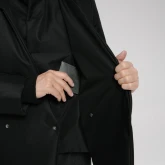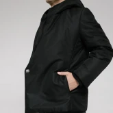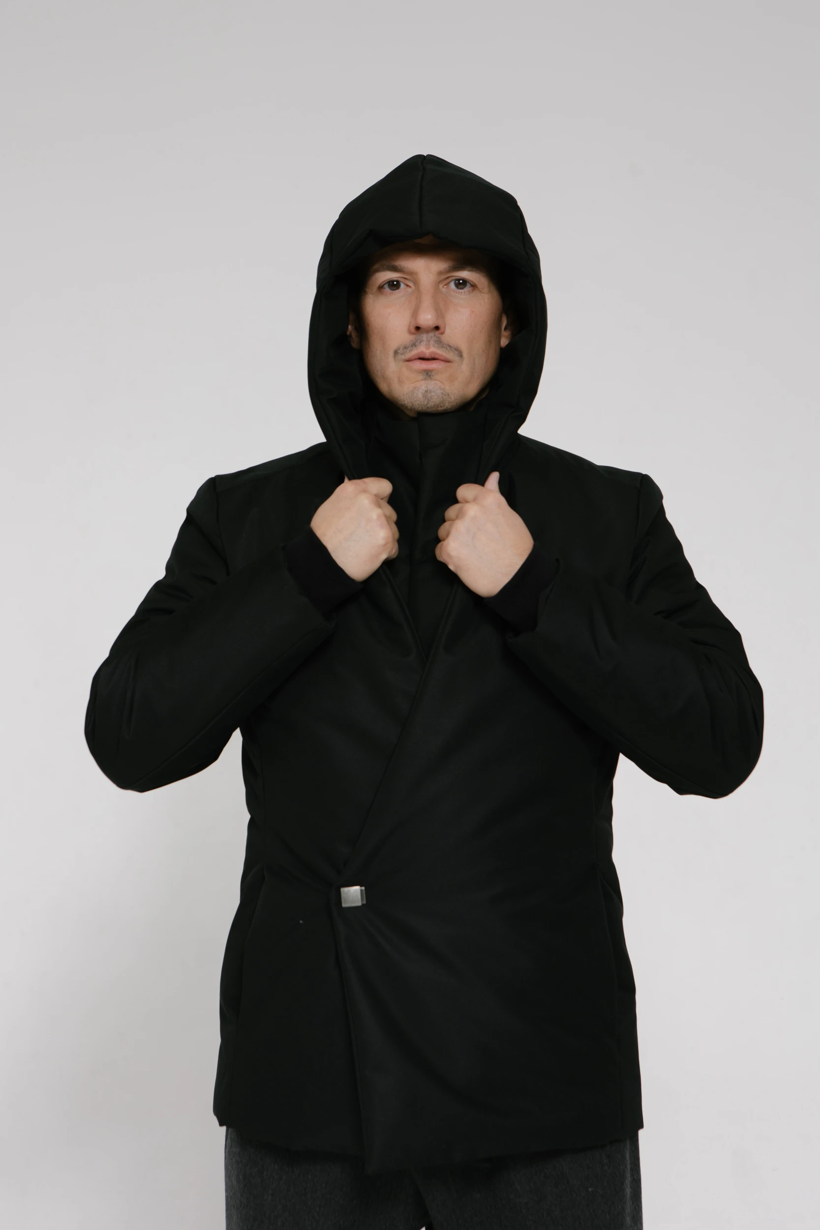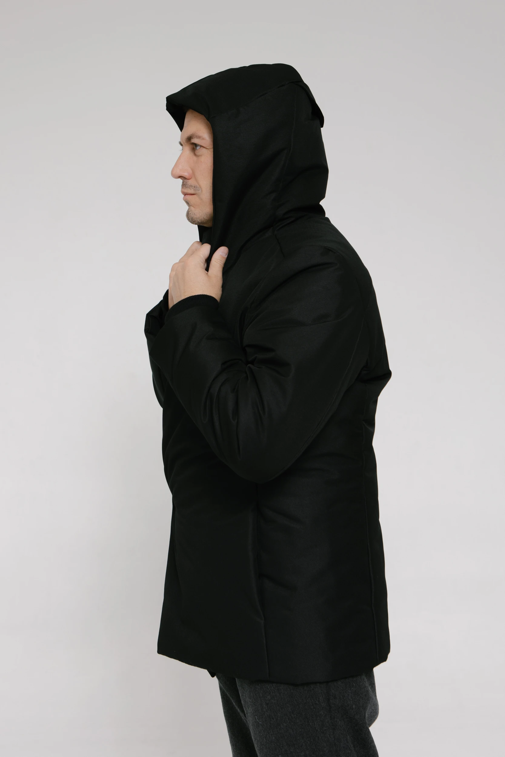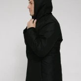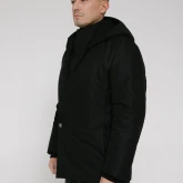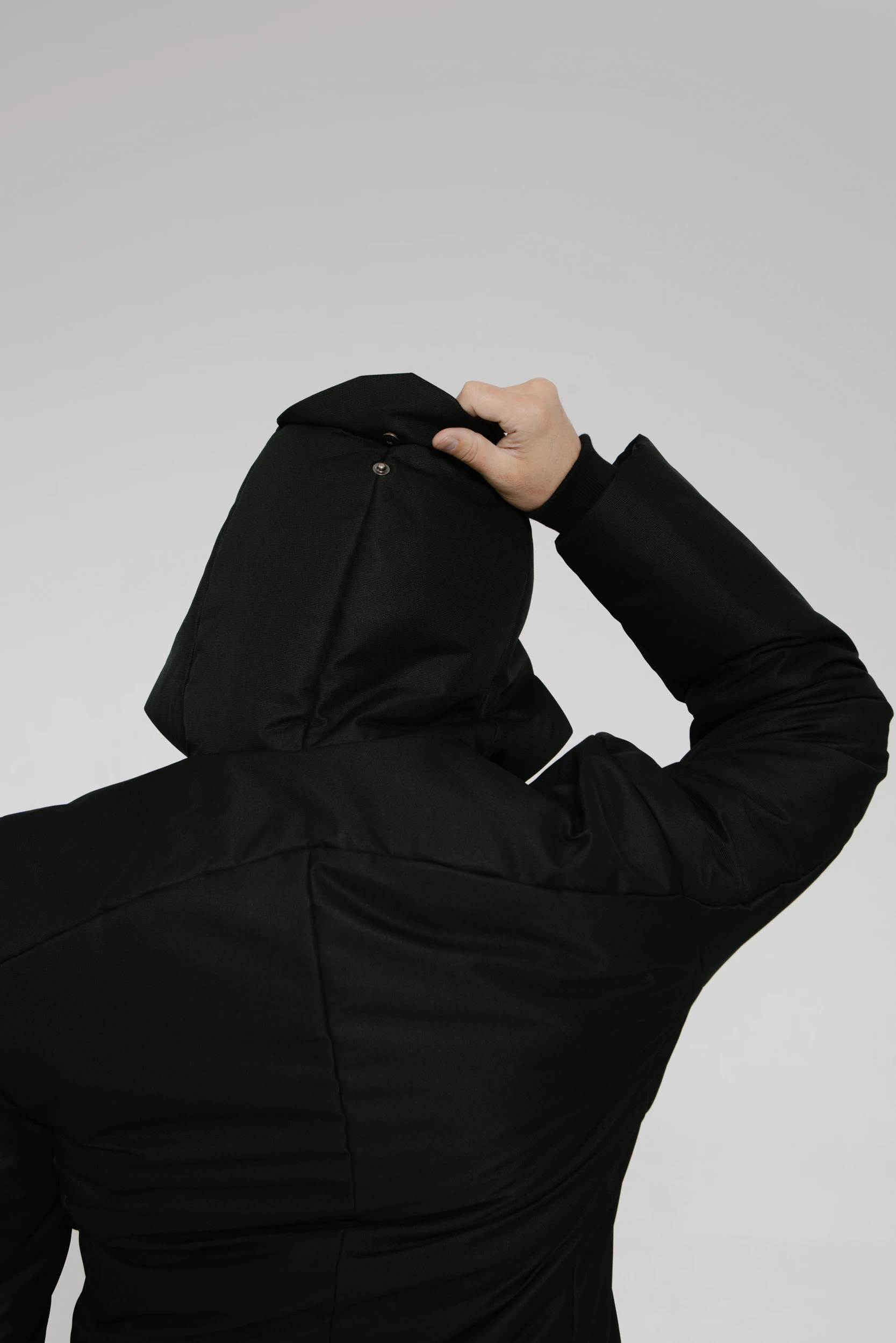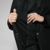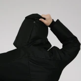 - Капюшон высокий, но не объёмный. Укрывает от ветра, снега и дождя, но не ограничивает поле зрения. Регулируется по высоте. Одним движением руки снимается с головы и аккуратно ложится на плечи.