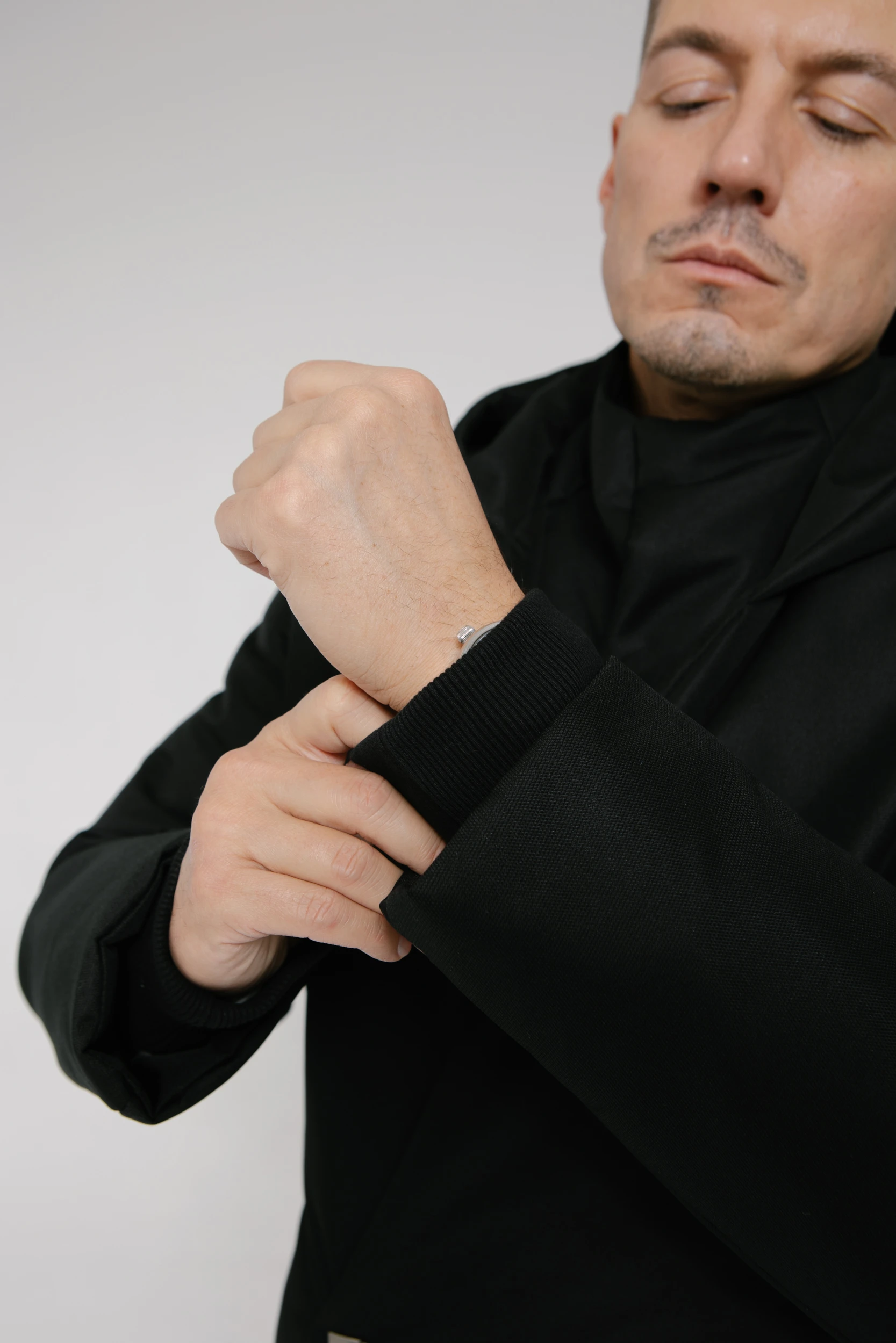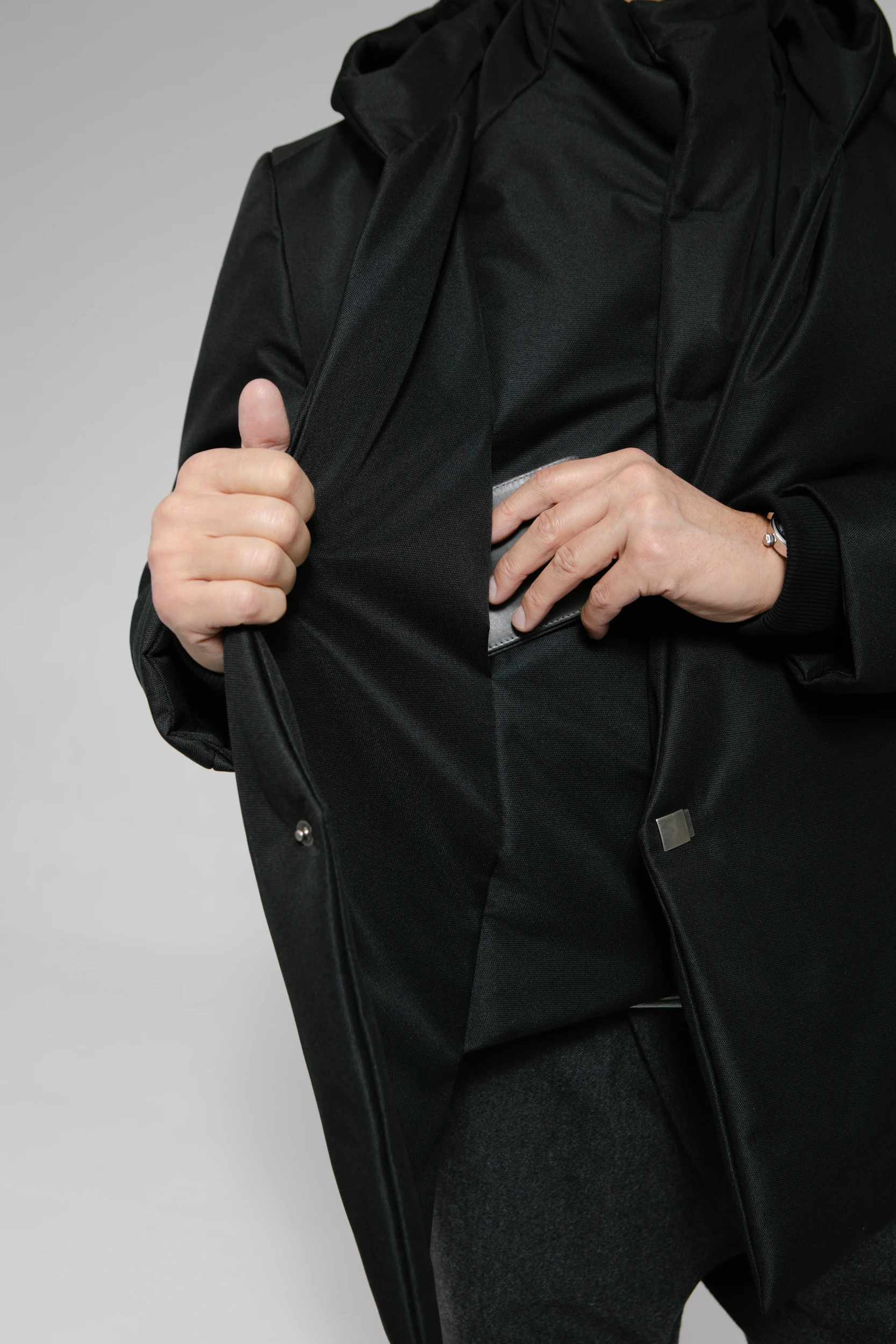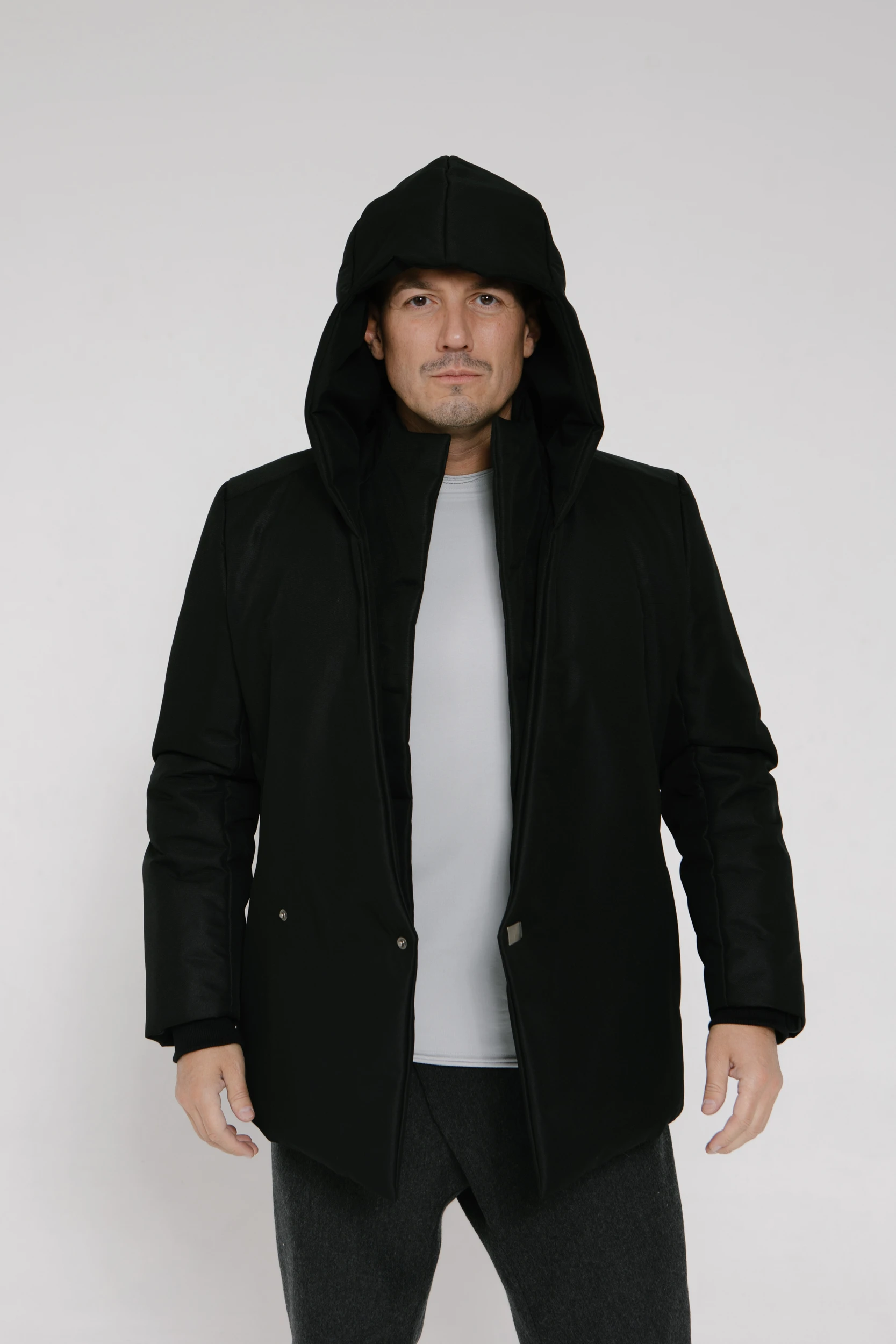 - Внутренний слой — как жилет с воротником-стойкой. Он вшит в переднюю часть куртки, застёгивается на неодимовые магниты и прилегает к телу, защищая от ветра и холода. Этот жилет особенно оценят водители. Когда выпрыгиваешь из машины, магниты сами застёгиваются. Больше никаких «выбегал — не застегнулся — простыл».