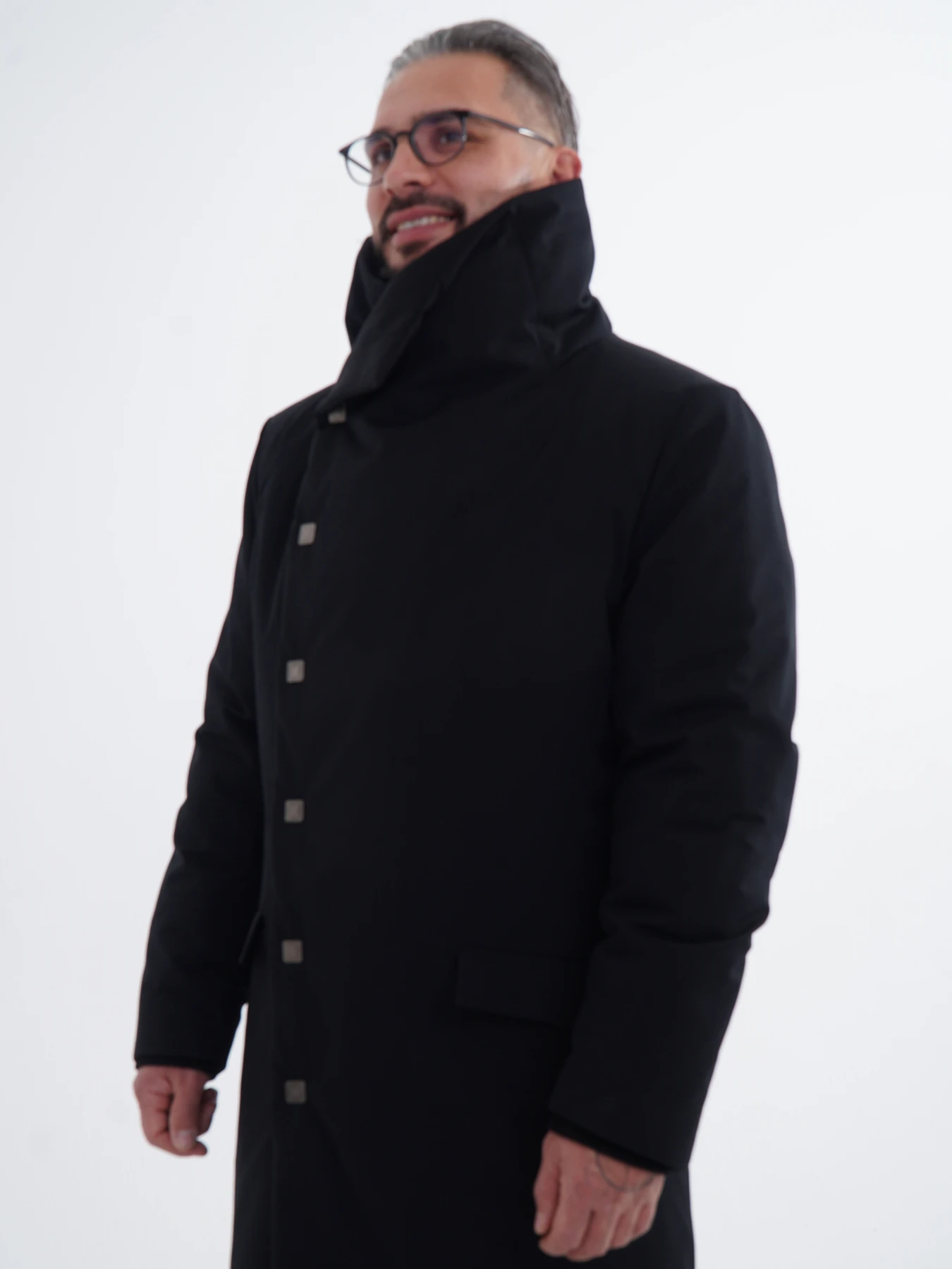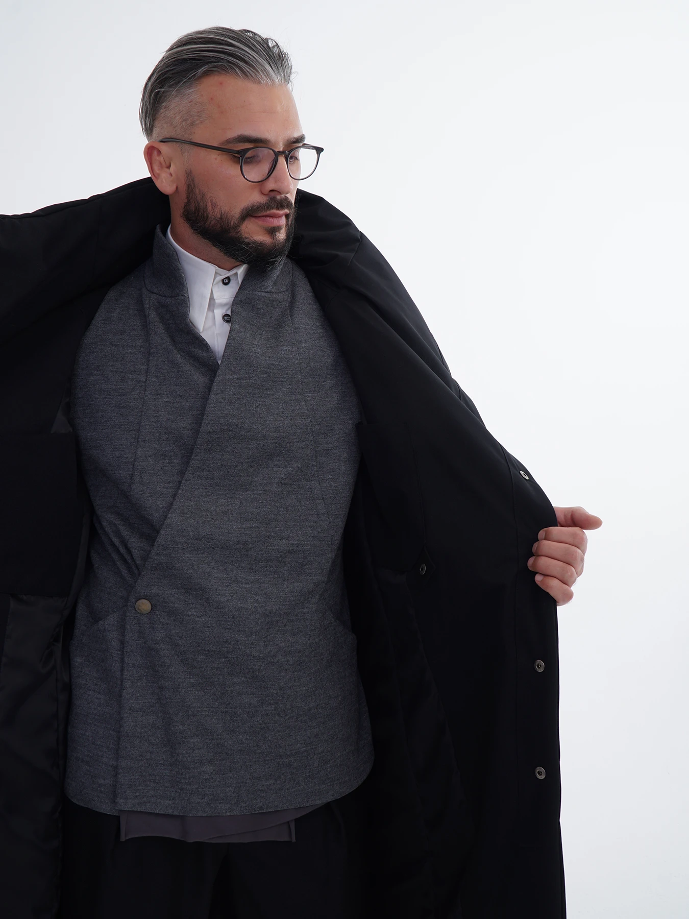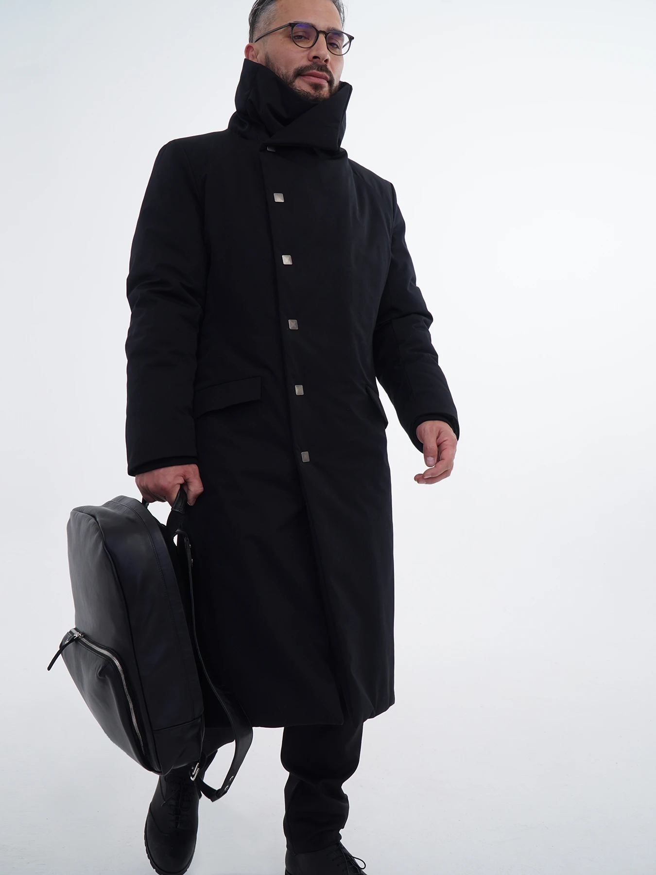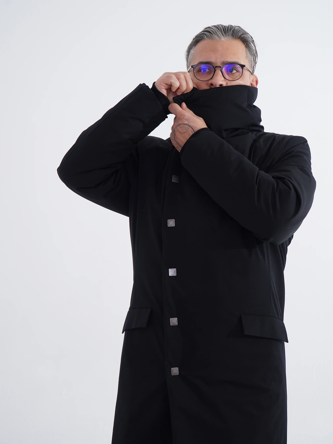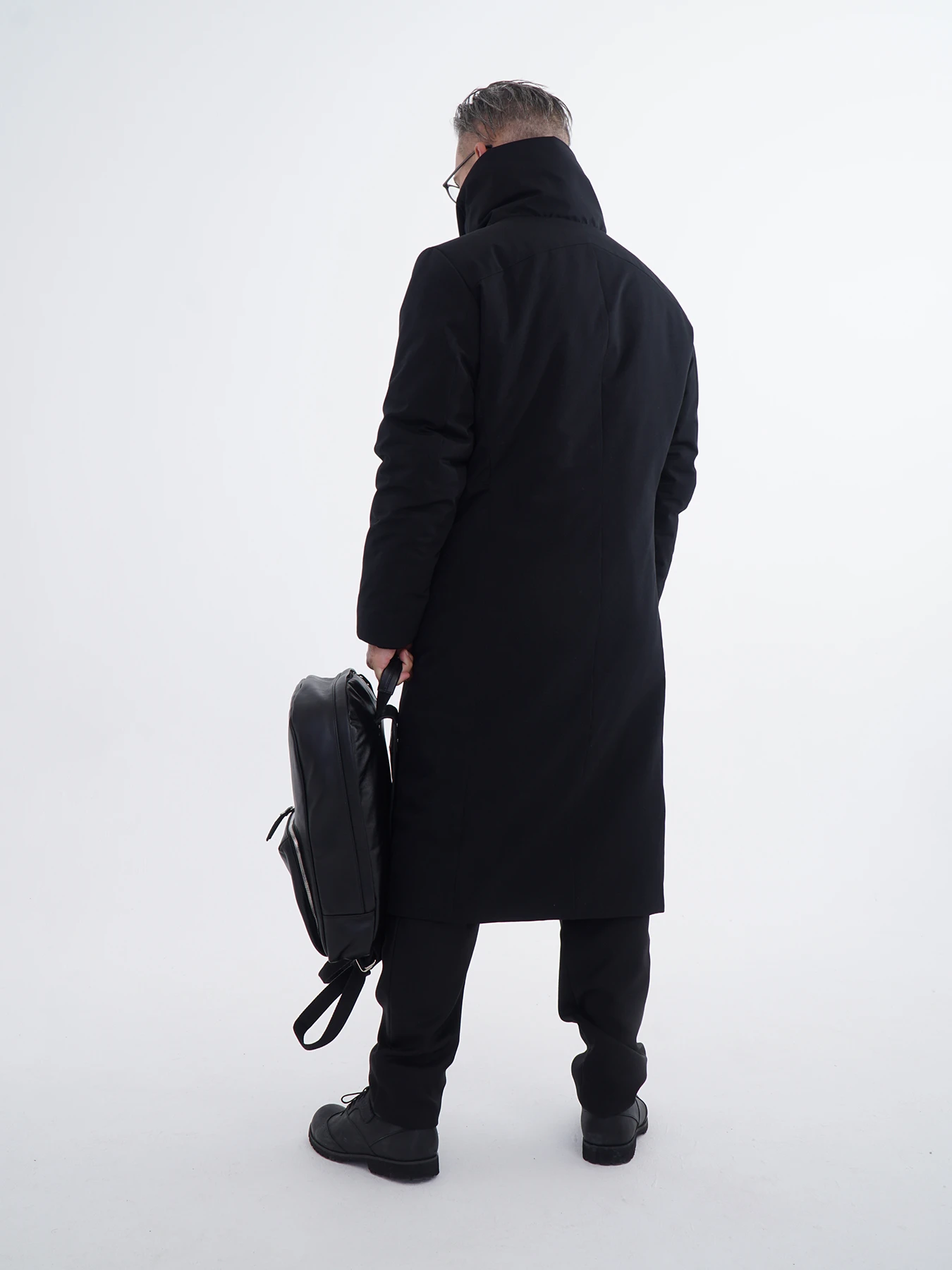 Длинное пальто приталенного силуэта. Минималистичный дизайн, два внешних и два внутренних кармана, борта с глубоким заносом застёгиваются на кнопки. Высокий воротник завершает силуэт и защищает от пронизывающего ветра. Рукав дополнен трикотажным манжетом.