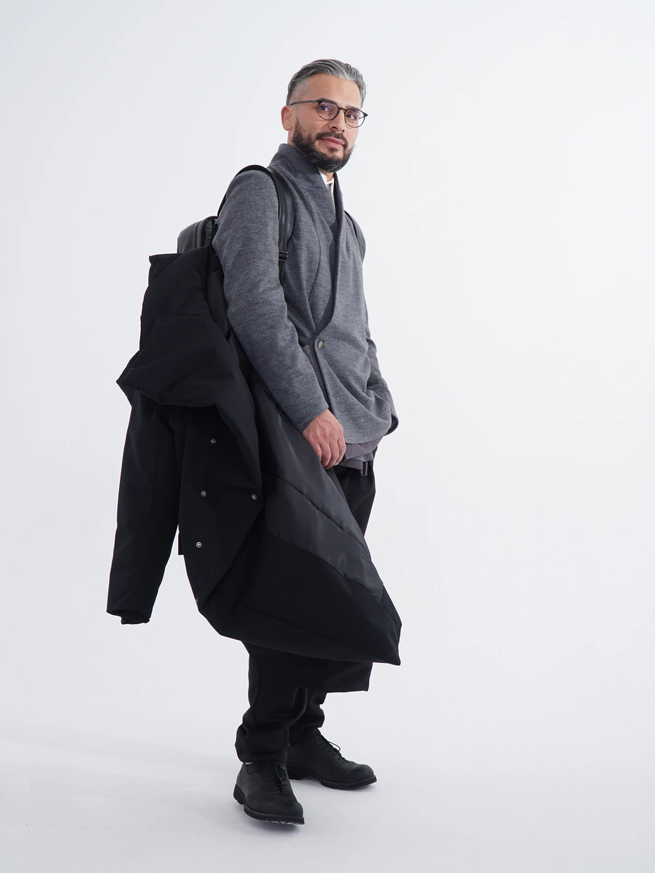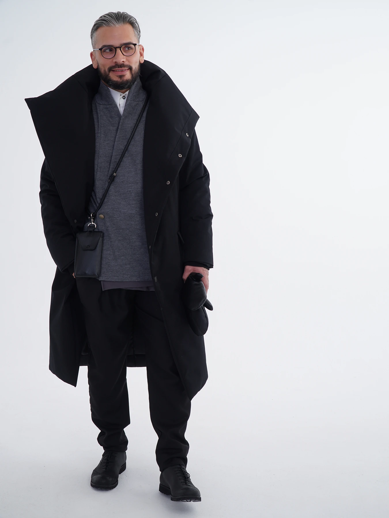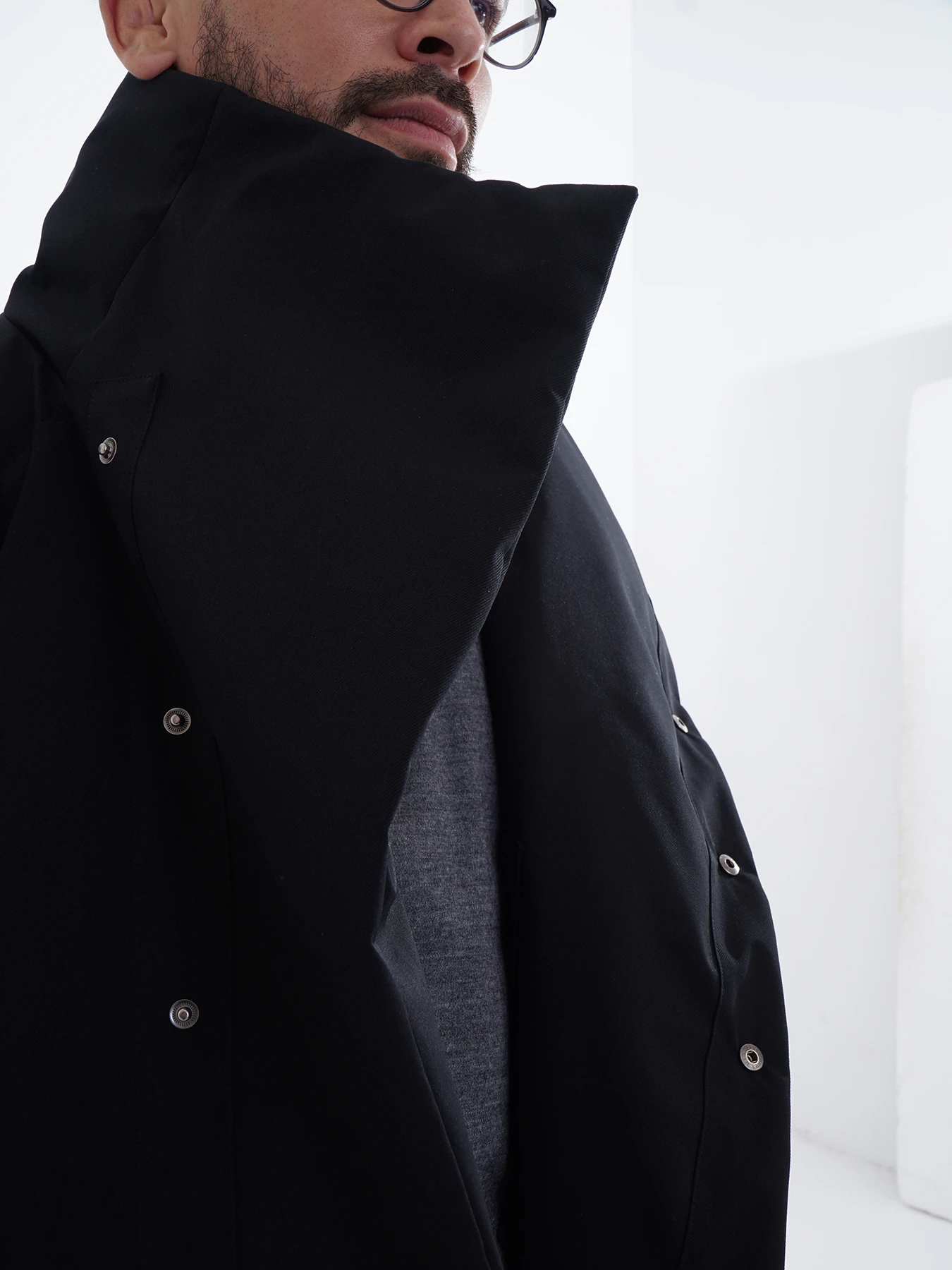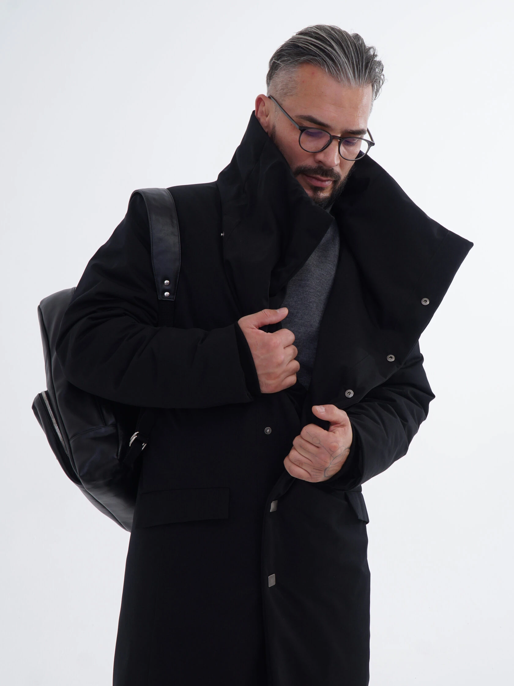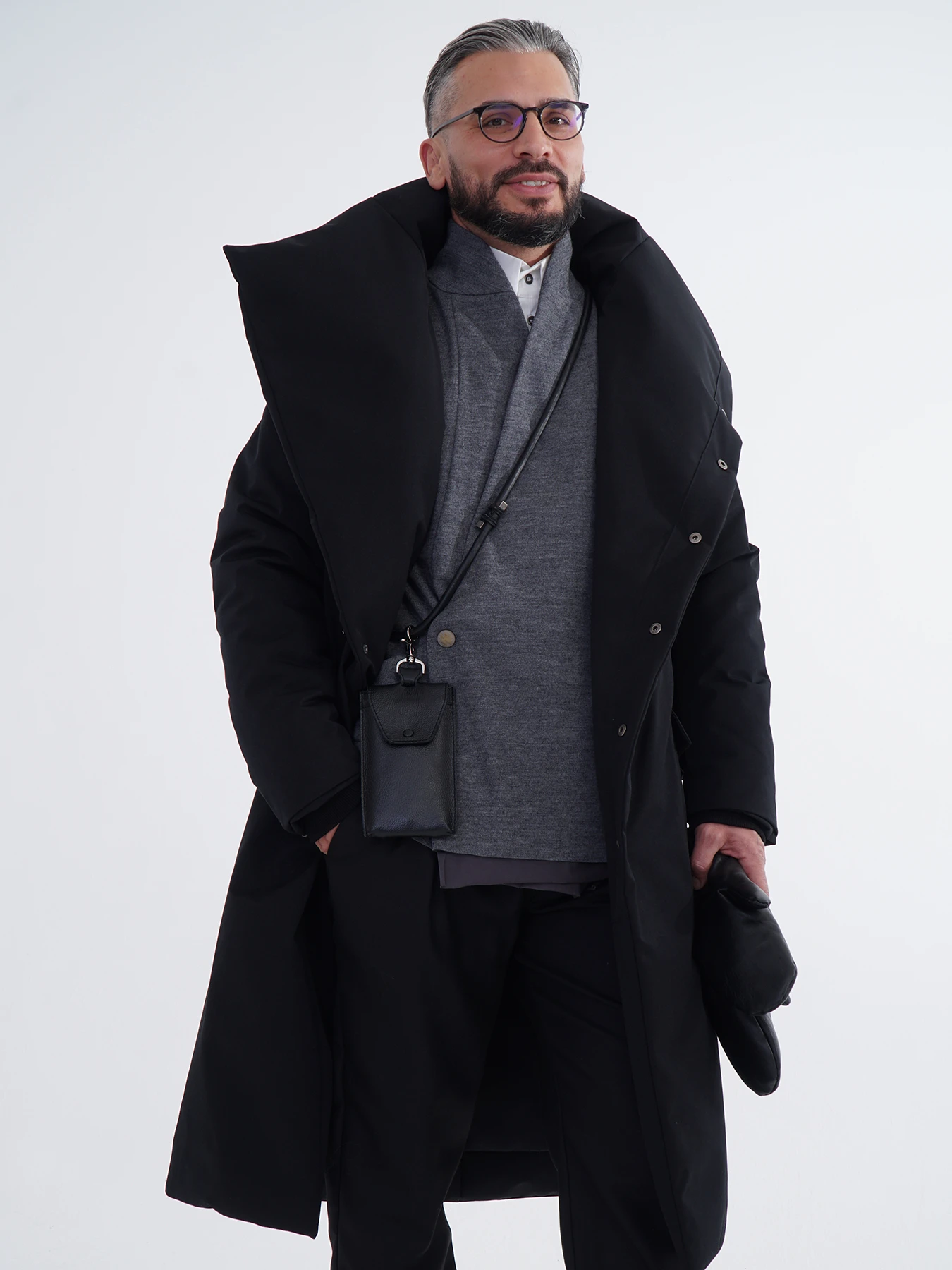 Длинное пальто приталенного силуэта. Минималистичный дизайн, два внешних и два внутренних кармана, борта с глубоким заносом застёгиваются на кнопки. Высокий воротник завершает силуэт и защищает от пронизывающего ветра. Рукав дополнен трикотажным манжетом.