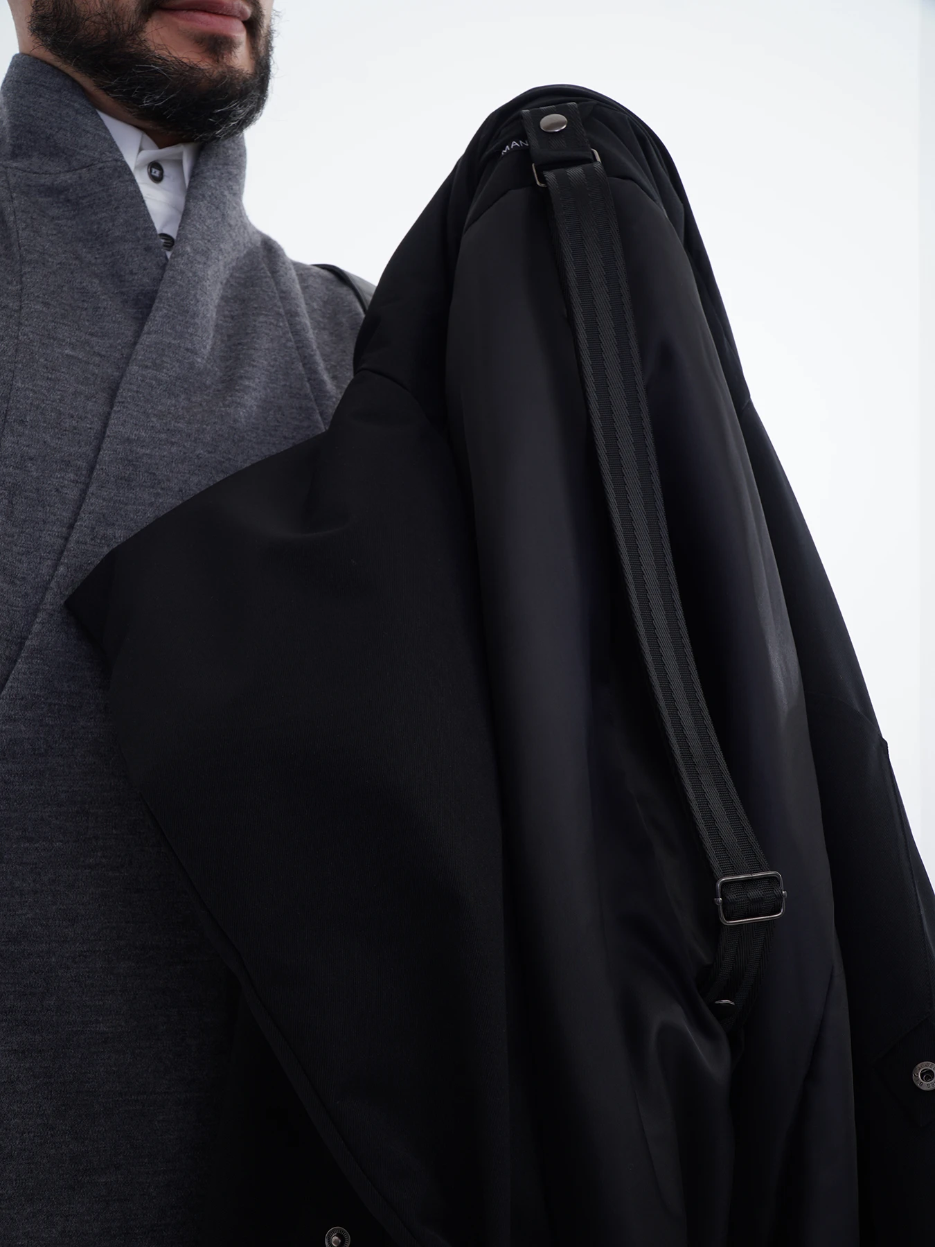 В это пальто мы добавили опциональную лямку для ношения на плече / через плечо: лямка из синтетической стропы фиксируется кнопками через петлю-вешалку и дополнительную петлю внутри в области талии.