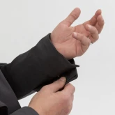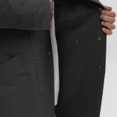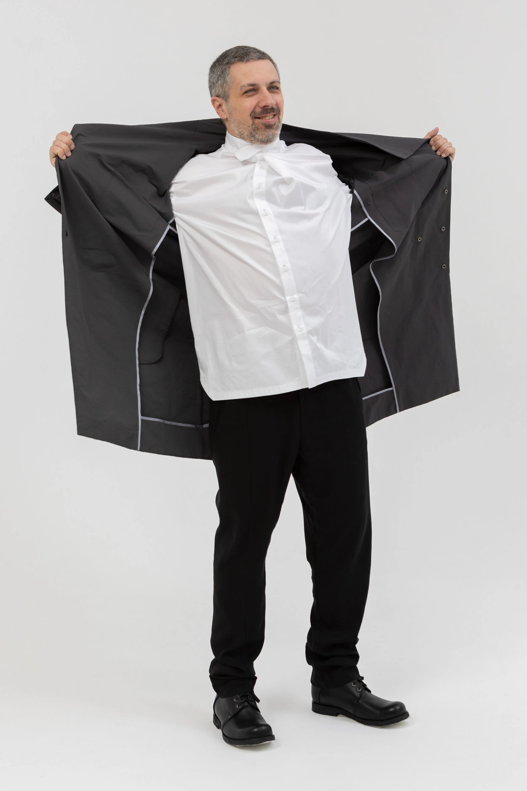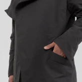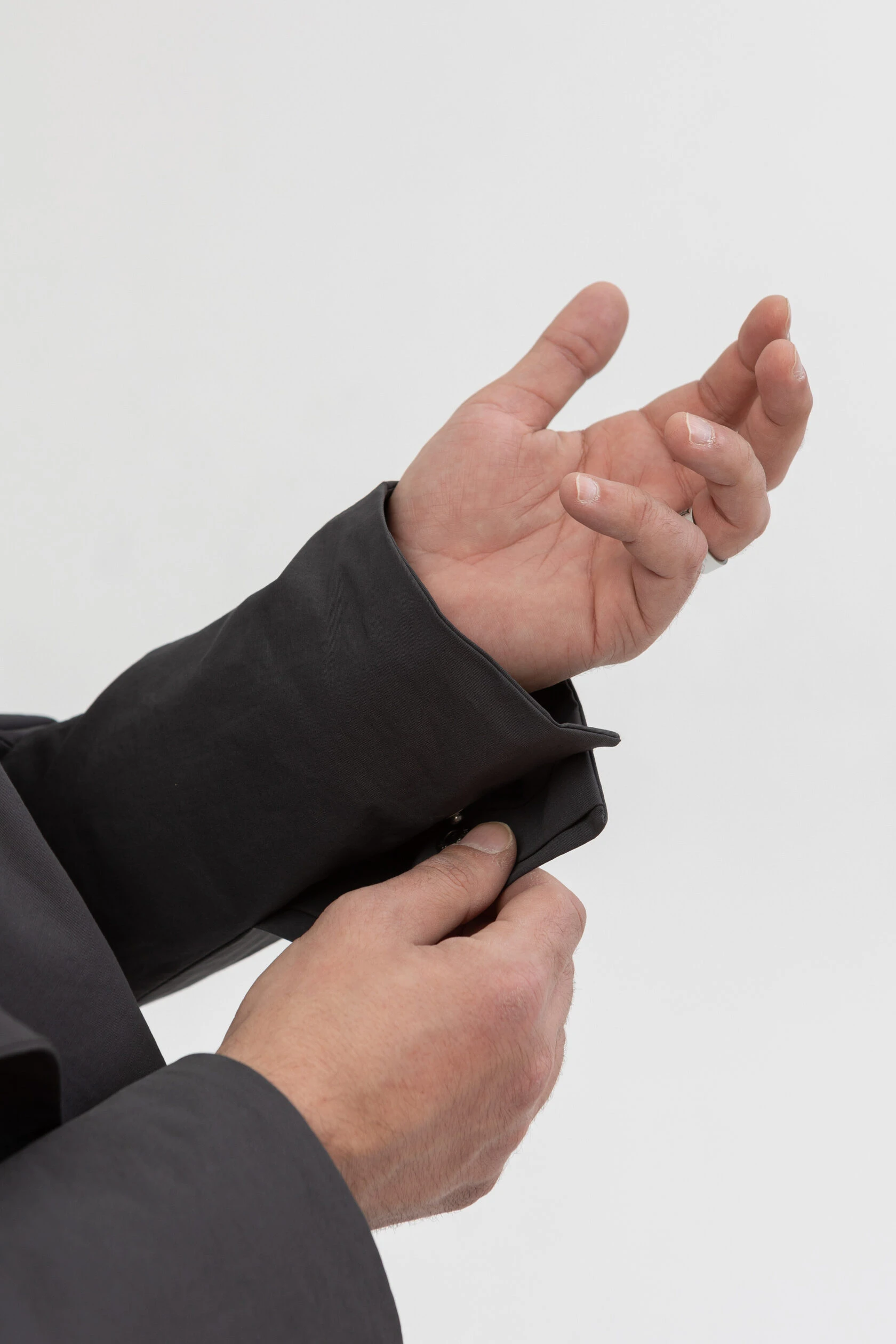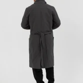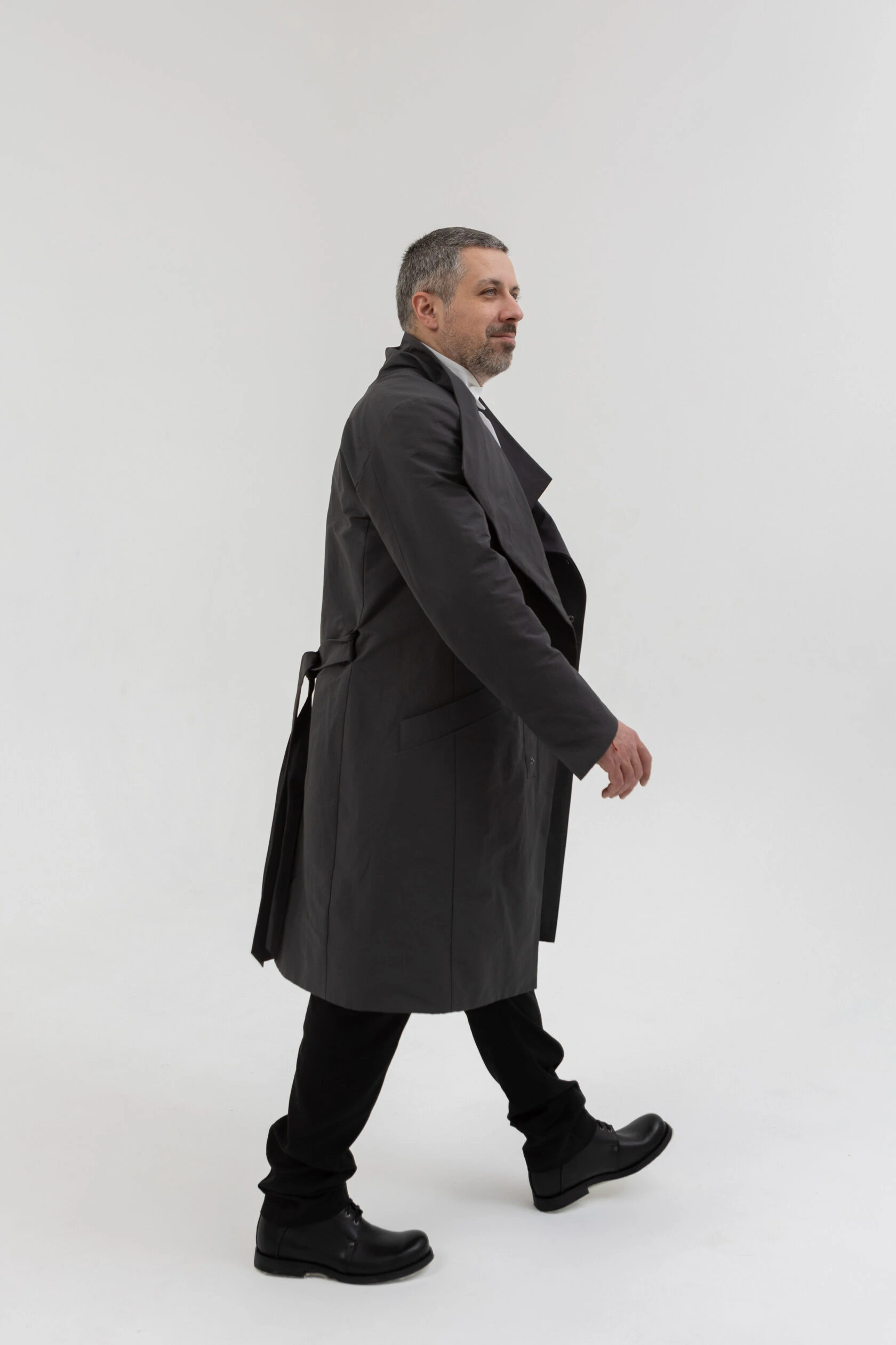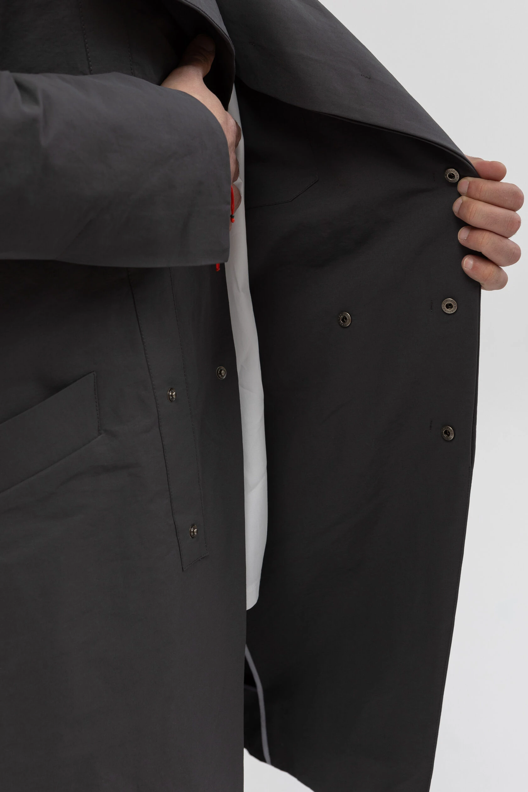 Застёжка — скрытые кнопки спереди и на шлицах рукавов. Плюс наш любимый «опциональный» пояс, который проходит не через привычные шлёвки, а через внутренний тоннель и выходит через прорези в боковых швах. Если вы не носите пояс, его концы можно спрятать внутрь через эти прорези. Или вовсе убрать пояс, и на плаще не останется никаких одиноких шлёвок.