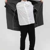 Воротник высокий, близкий к шее, на спине выше, чем спереди: так он не утыкается в бороду и кадык, но сзади закрывает шею до затылка. В закрытом состоянии полностью прикрывает шею, а в раскрытом образует большие красивые отвороты.