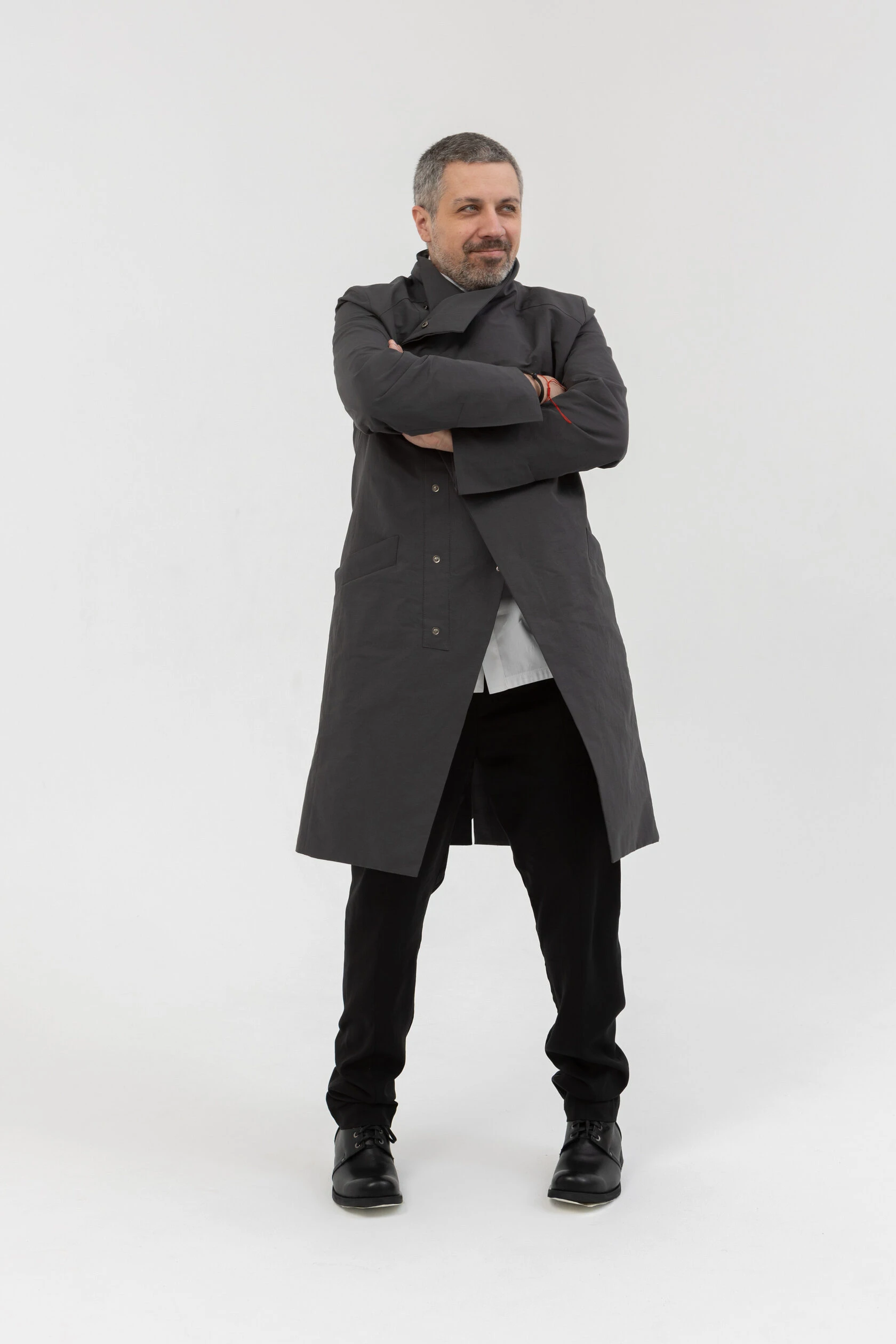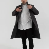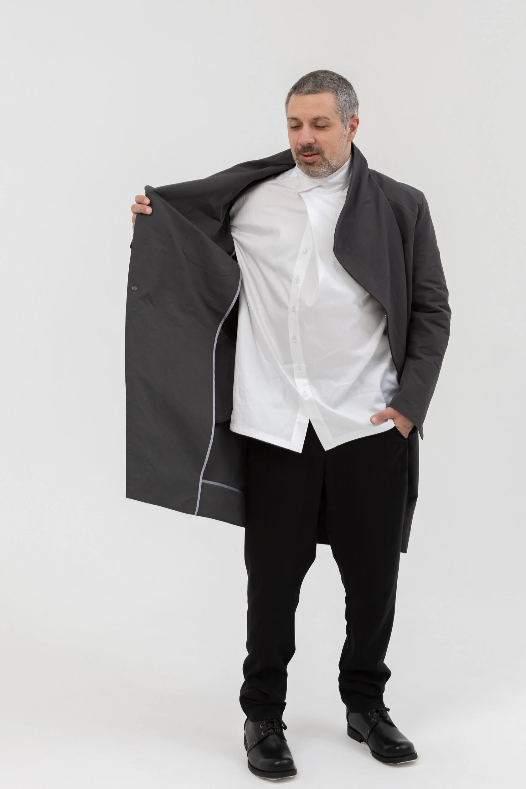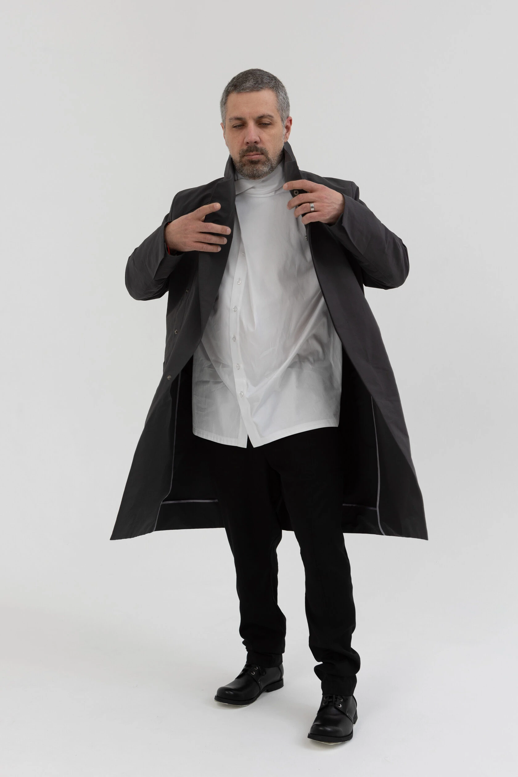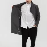 Лёгкий плащ свободного, полуприлегающего, слегка приталенного силуэта. Достаточно просторный, чтобы носить его поверх толстовки, свитера или пиджака.