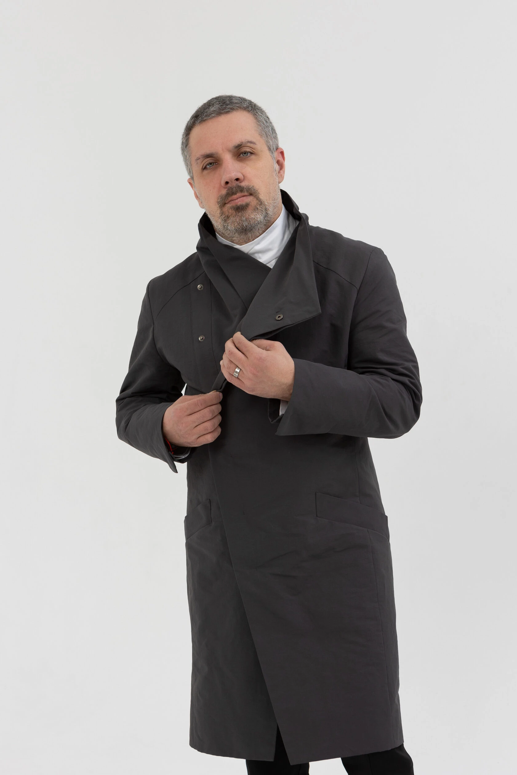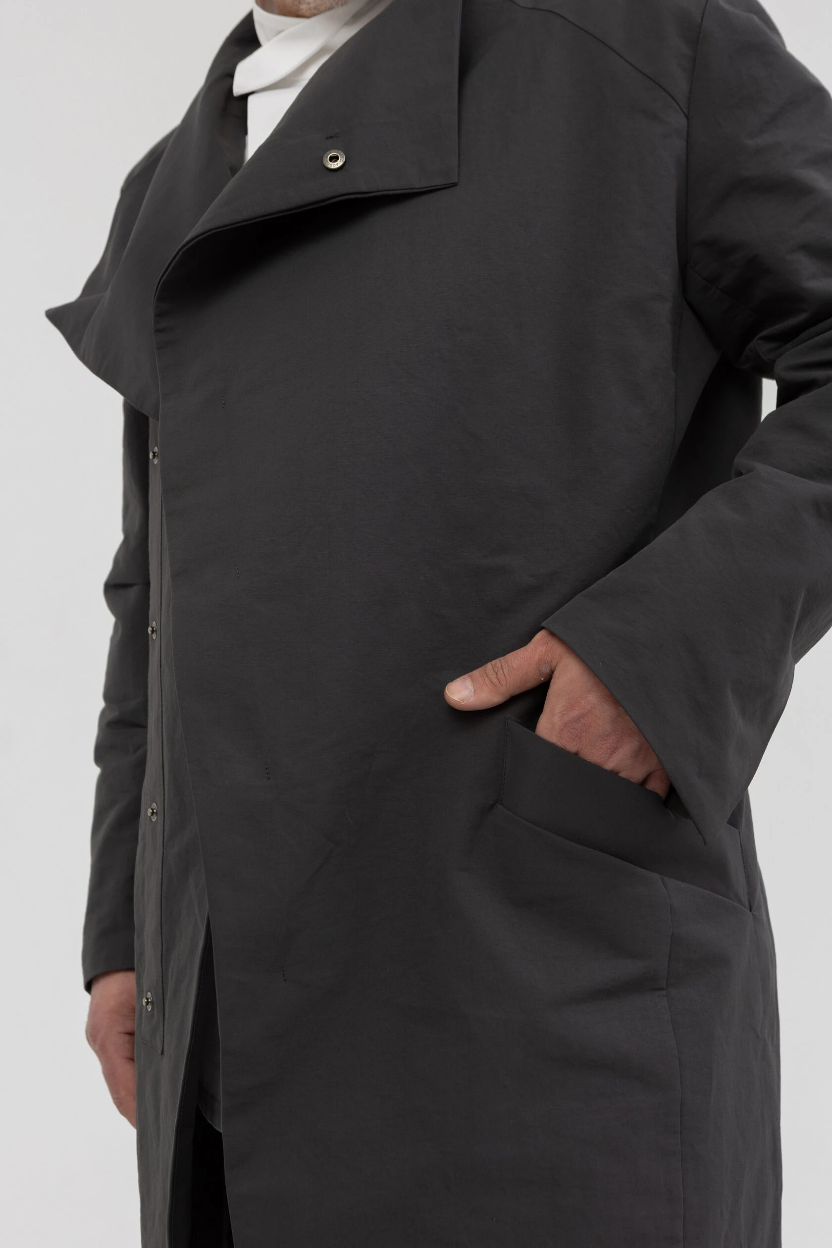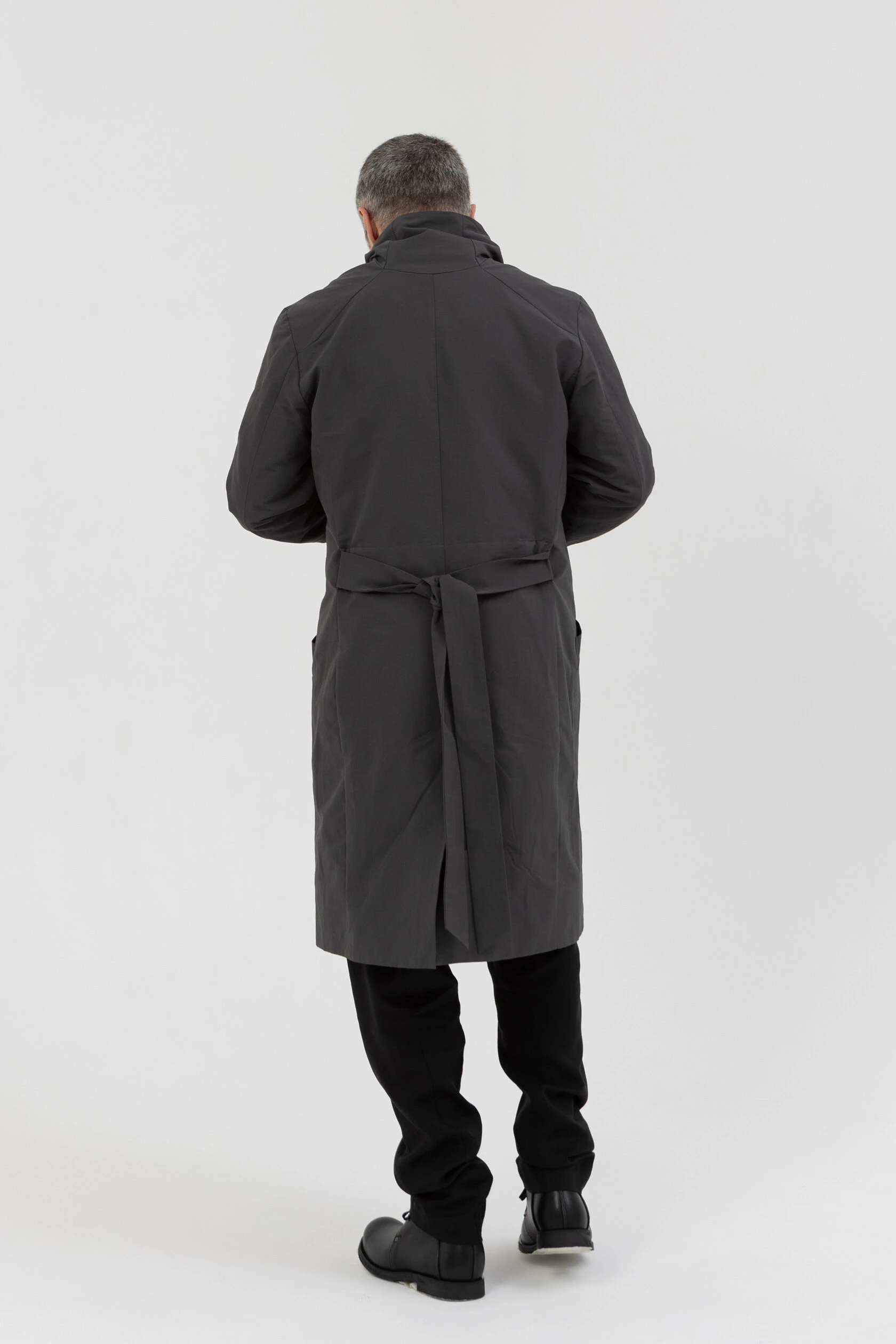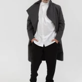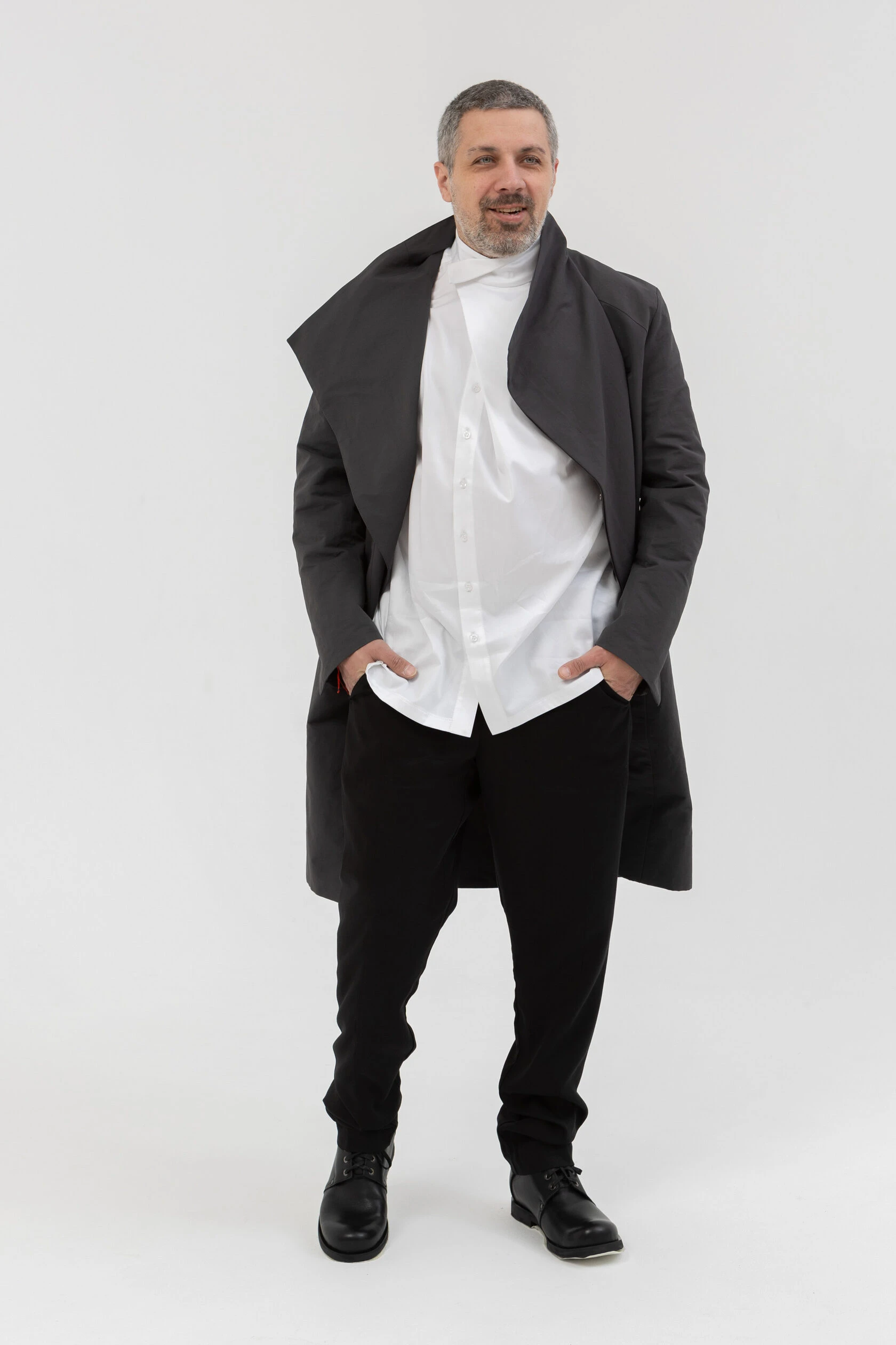 Лёгкий плащ свободного, полуприлегающего, слегка приталенного силуэта. Достаточно просторный, чтобы носить его поверх толстовки, свитера или пиджака.