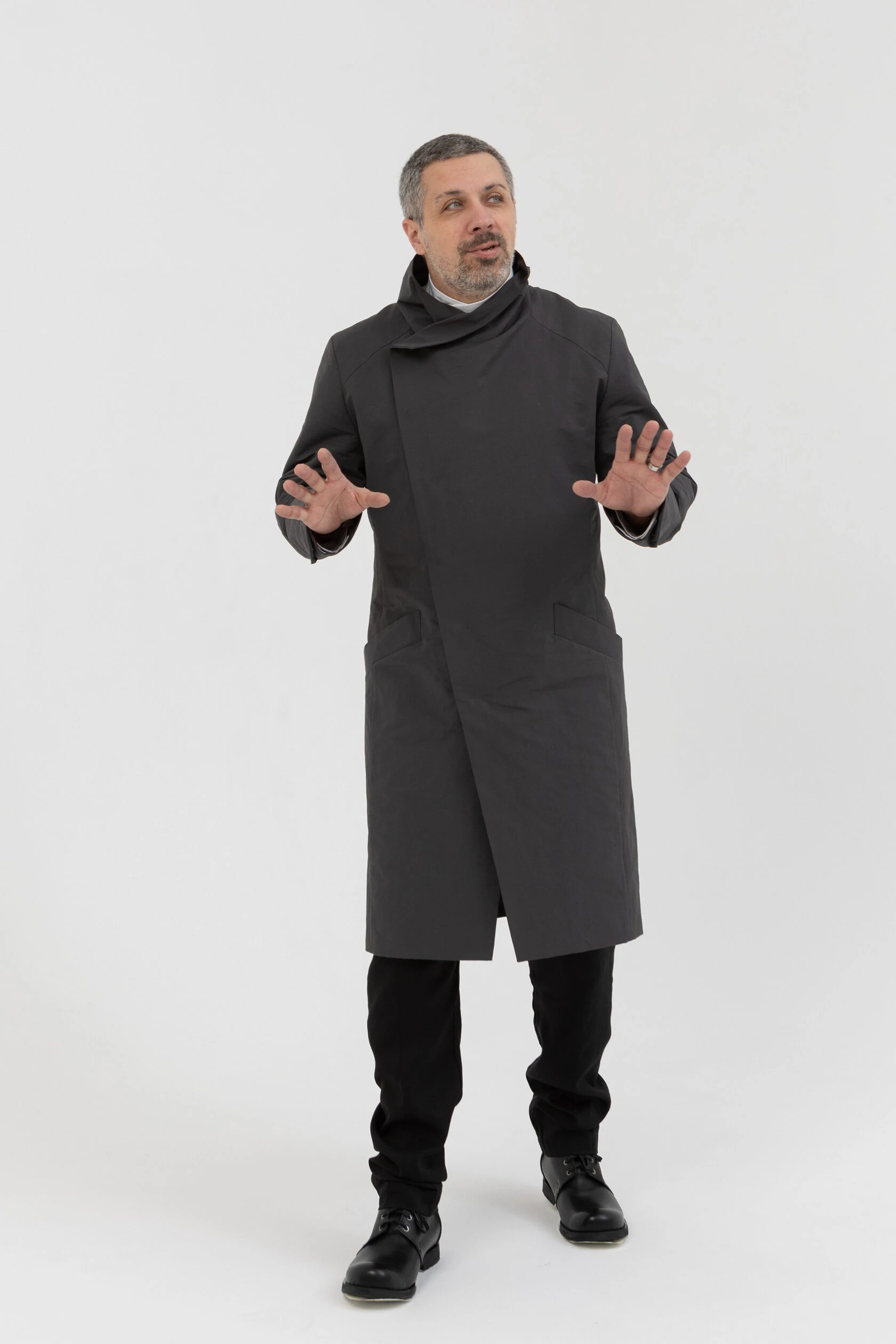 Хочется сказать, что плащ бесподкладочный, но на самом деле он частично с подкладом — мы сделали его в верхней части и в рукавах, чтобы было удобно надевать поверх других вещей.