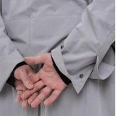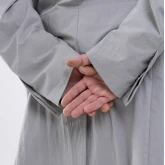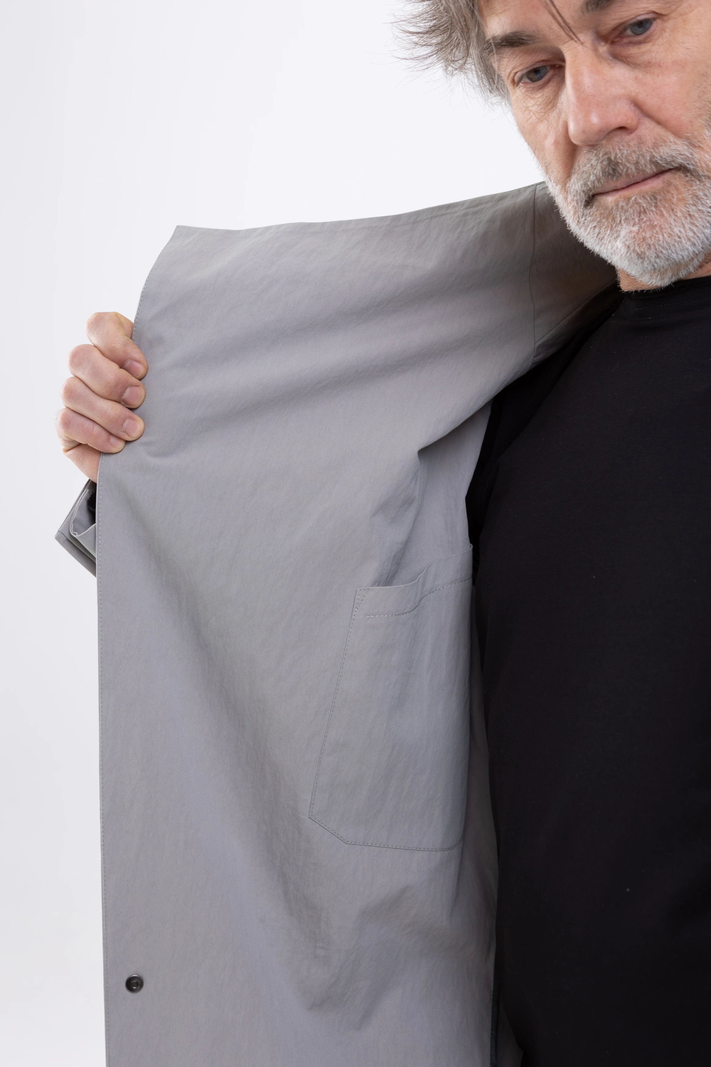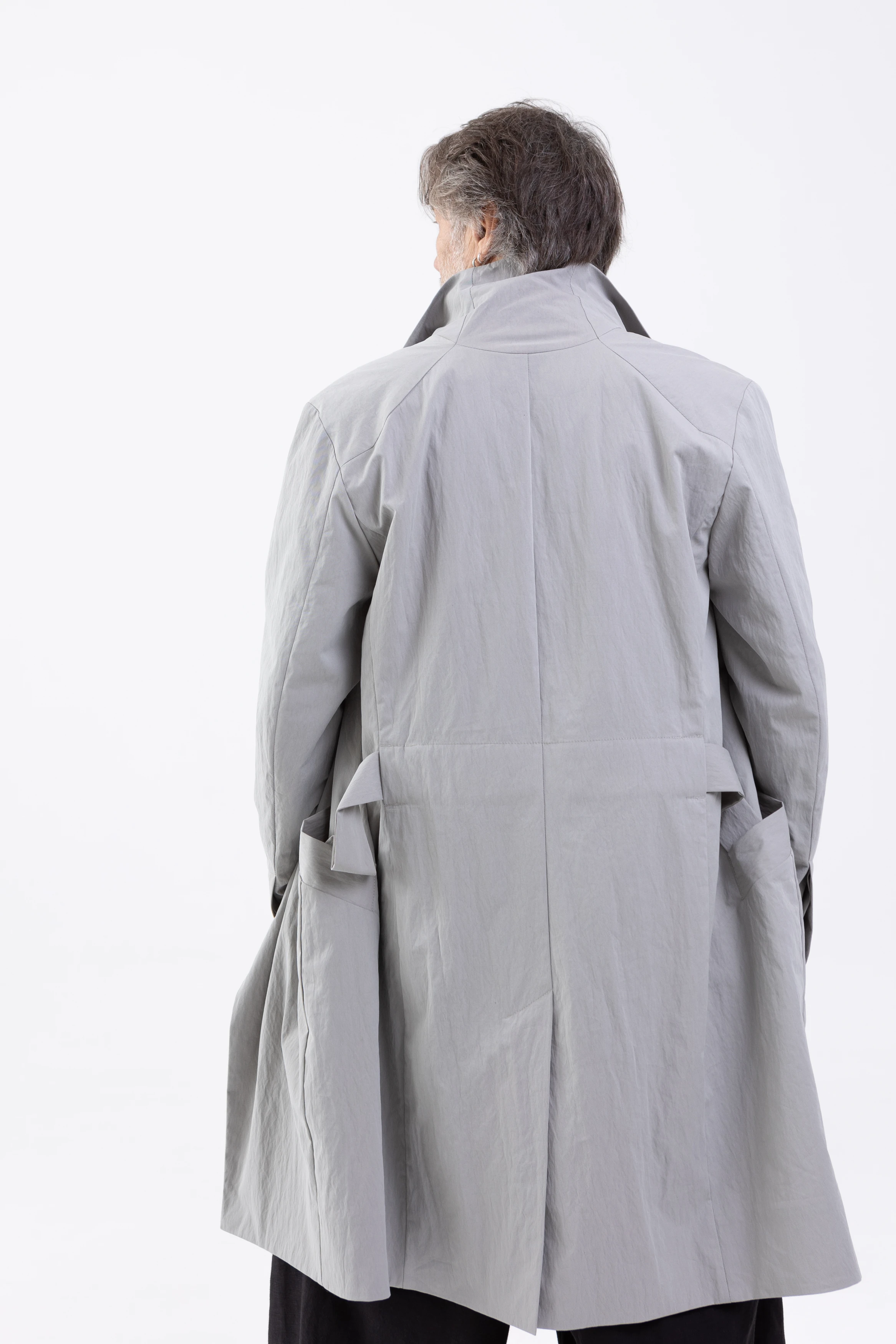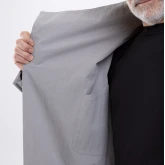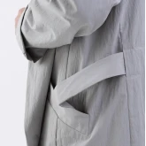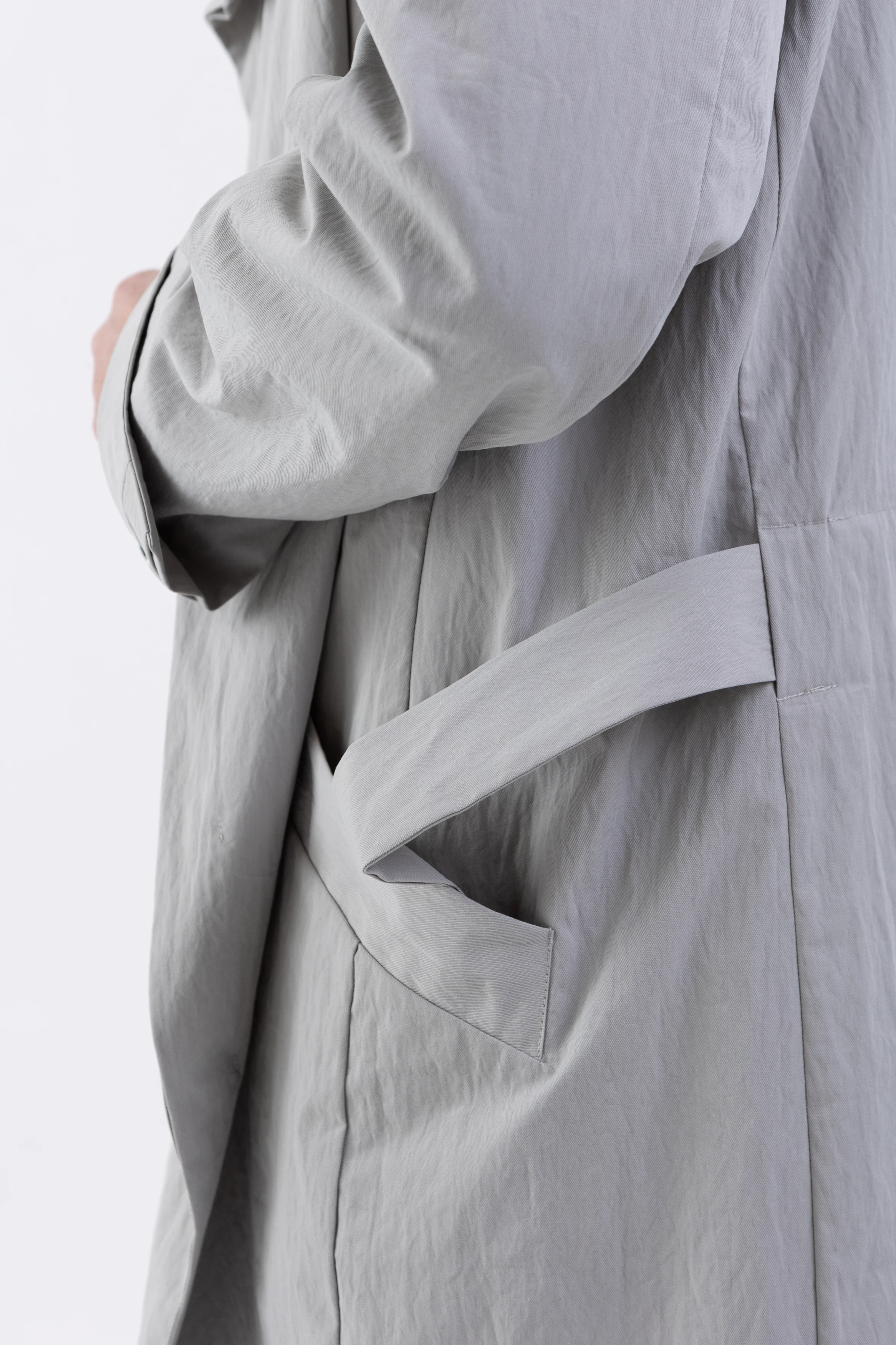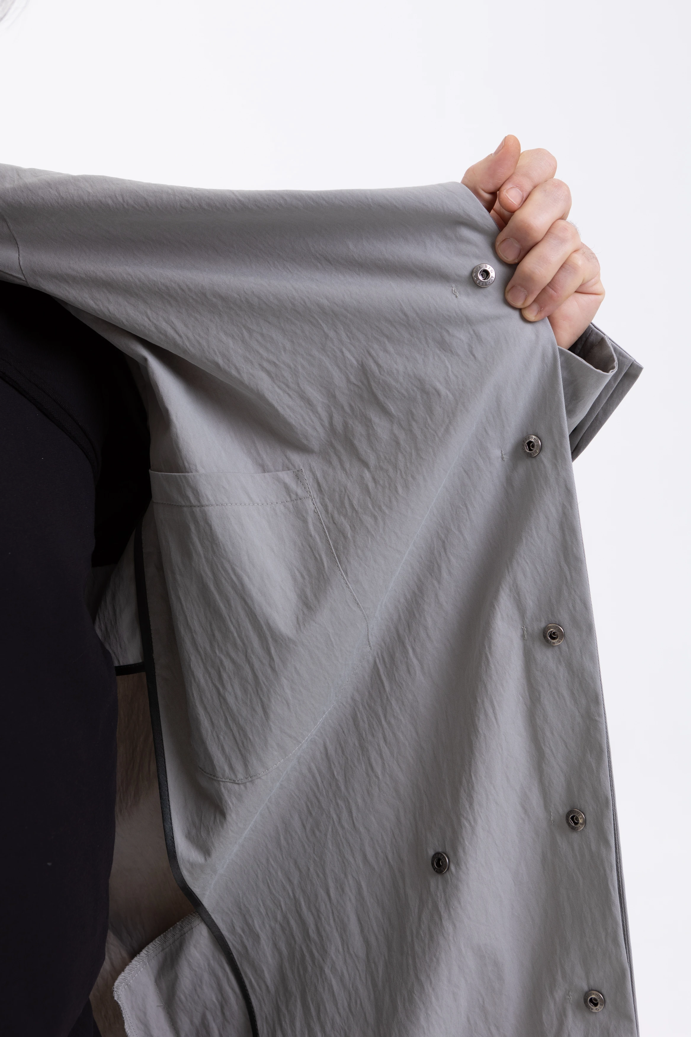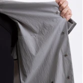 Застёжка — скрытые кнопки спереди и на шлицах рукавов. Плюс наш любимый «опциональный» пояс, который проходит не через привычные шлёвки, а через внутренний тоннель и выходит через прорези в боковых швах. Если вы не носите пояс, его концы можно спрятать внутрь через эти прорези. Или вовсе убрать пояс, и на плаще не останется никаких одиноких шлёвок.