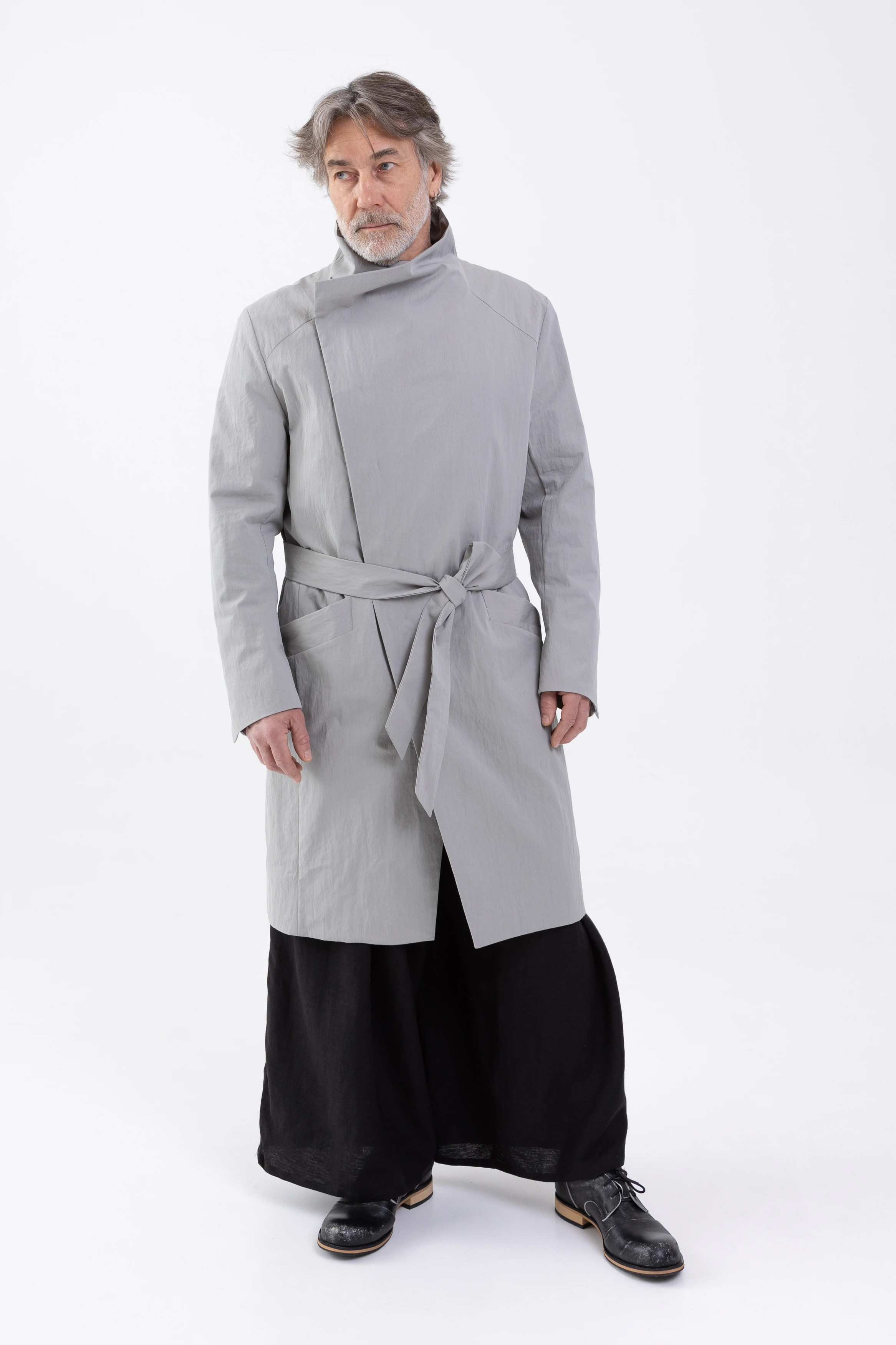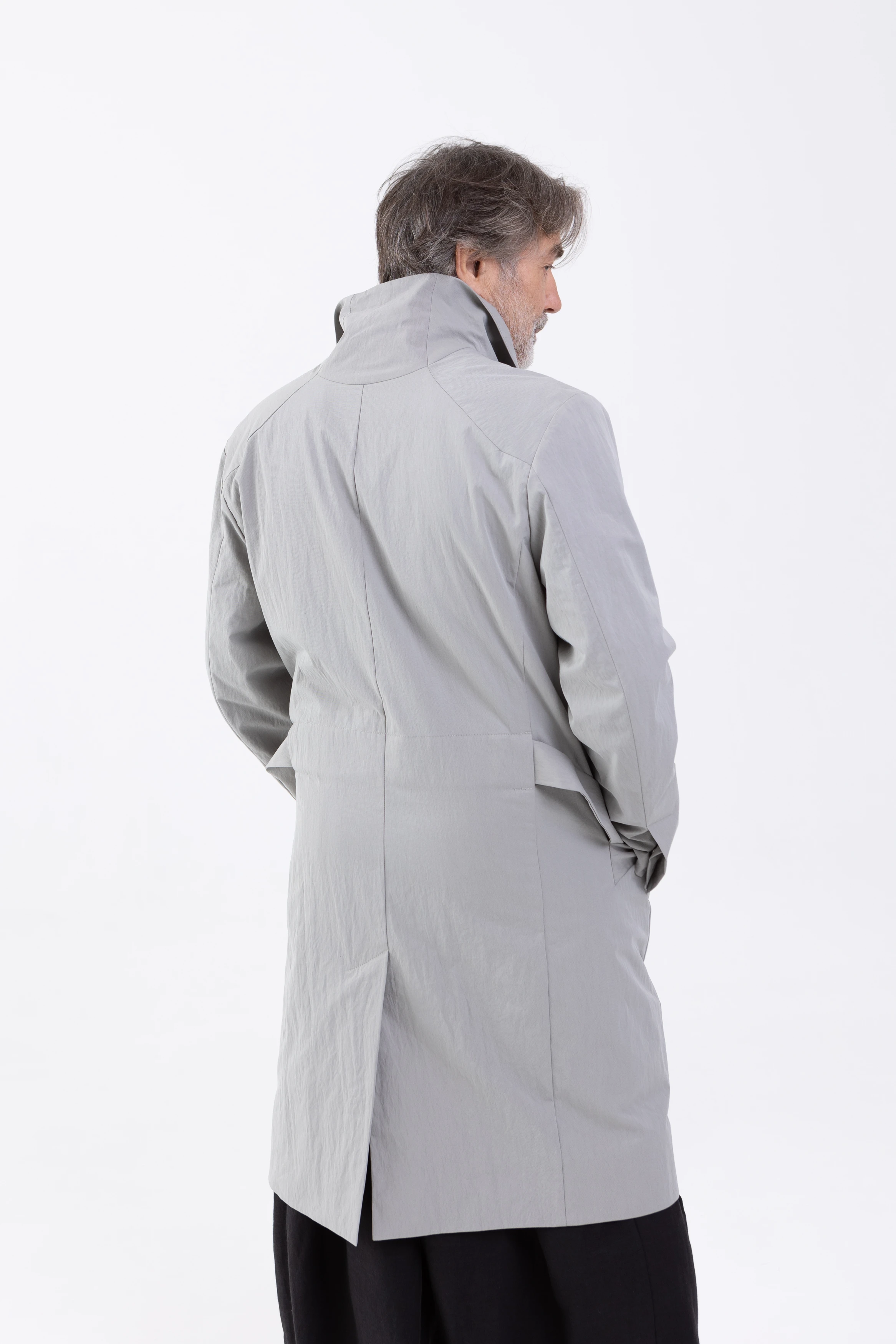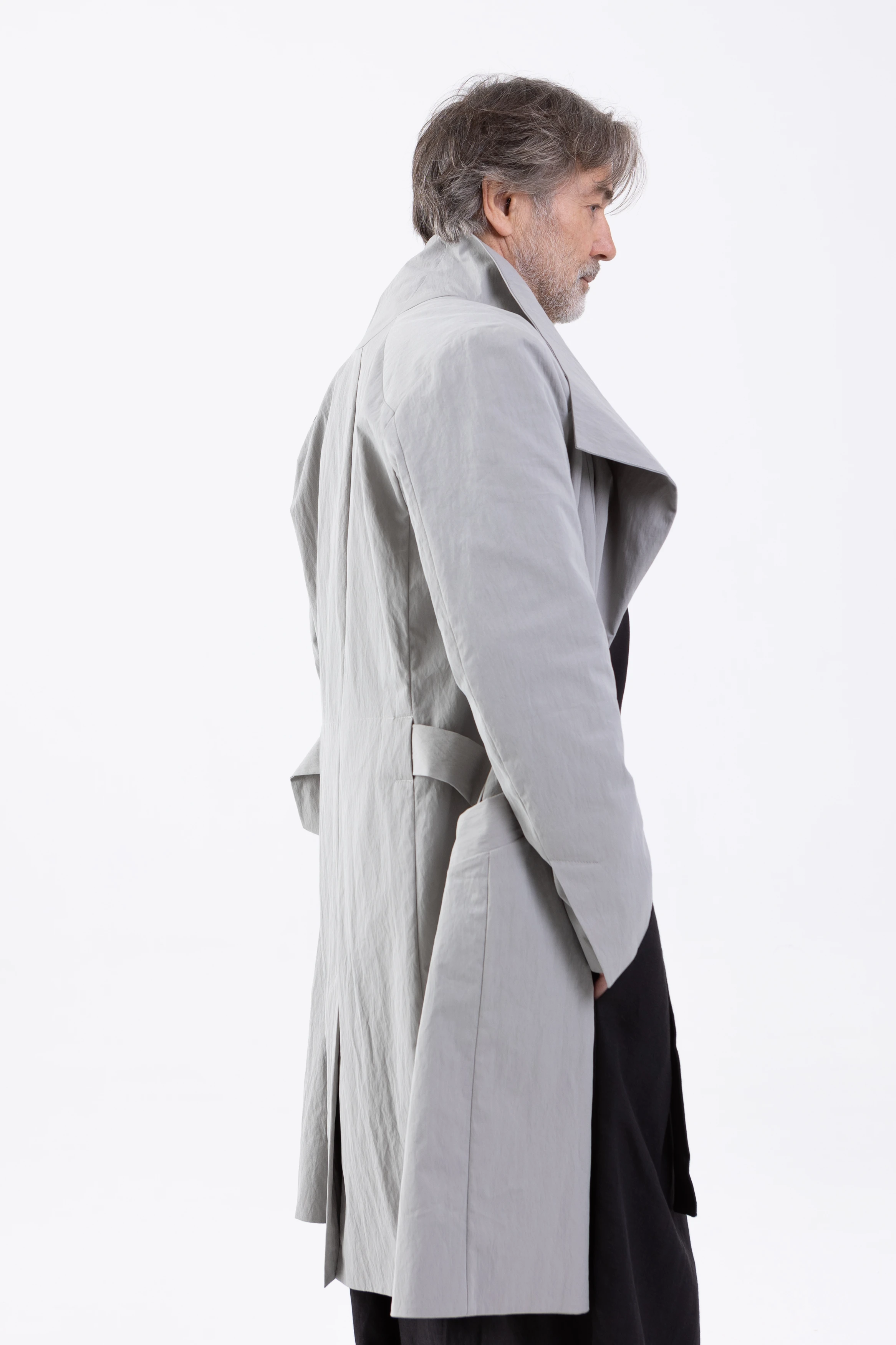 Лёгкий плащ свободного, полуприлегающего, слегка приталенного силуэта. Достаточно просторный, чтобы носить его поверх толстовки, свитера или пиджака.