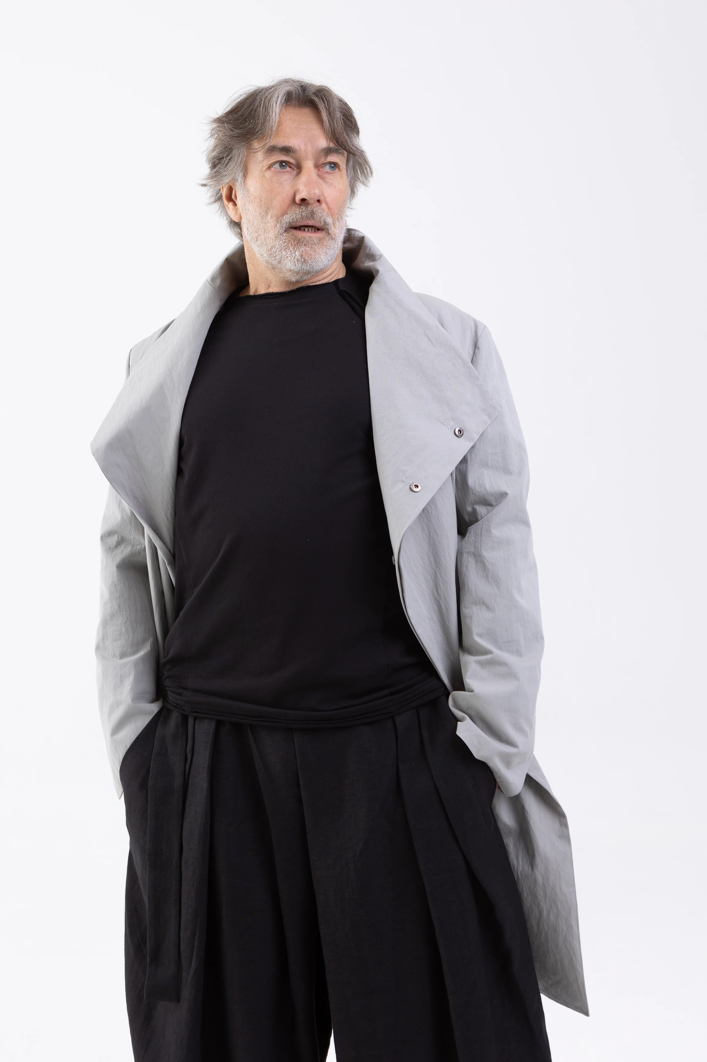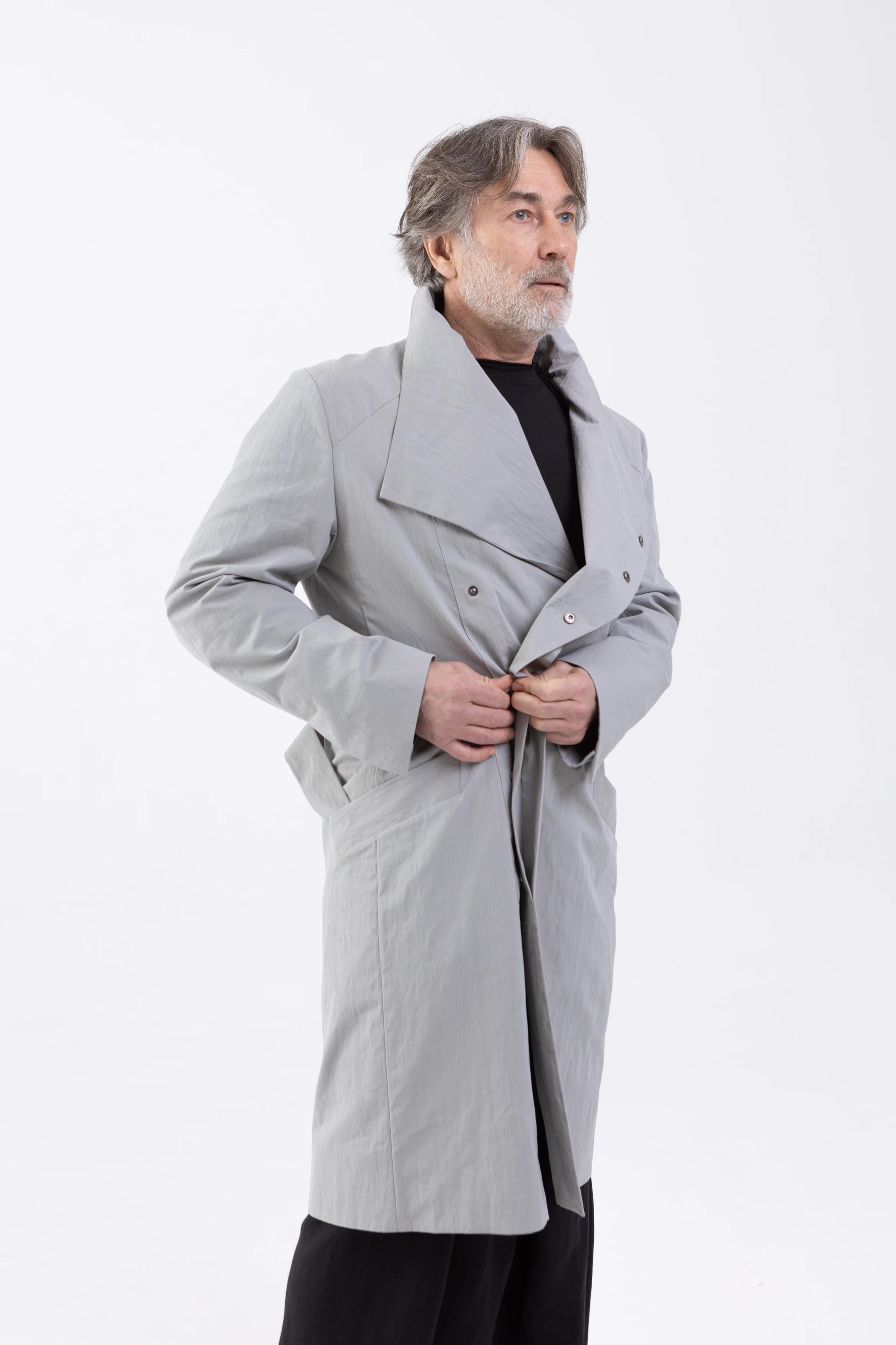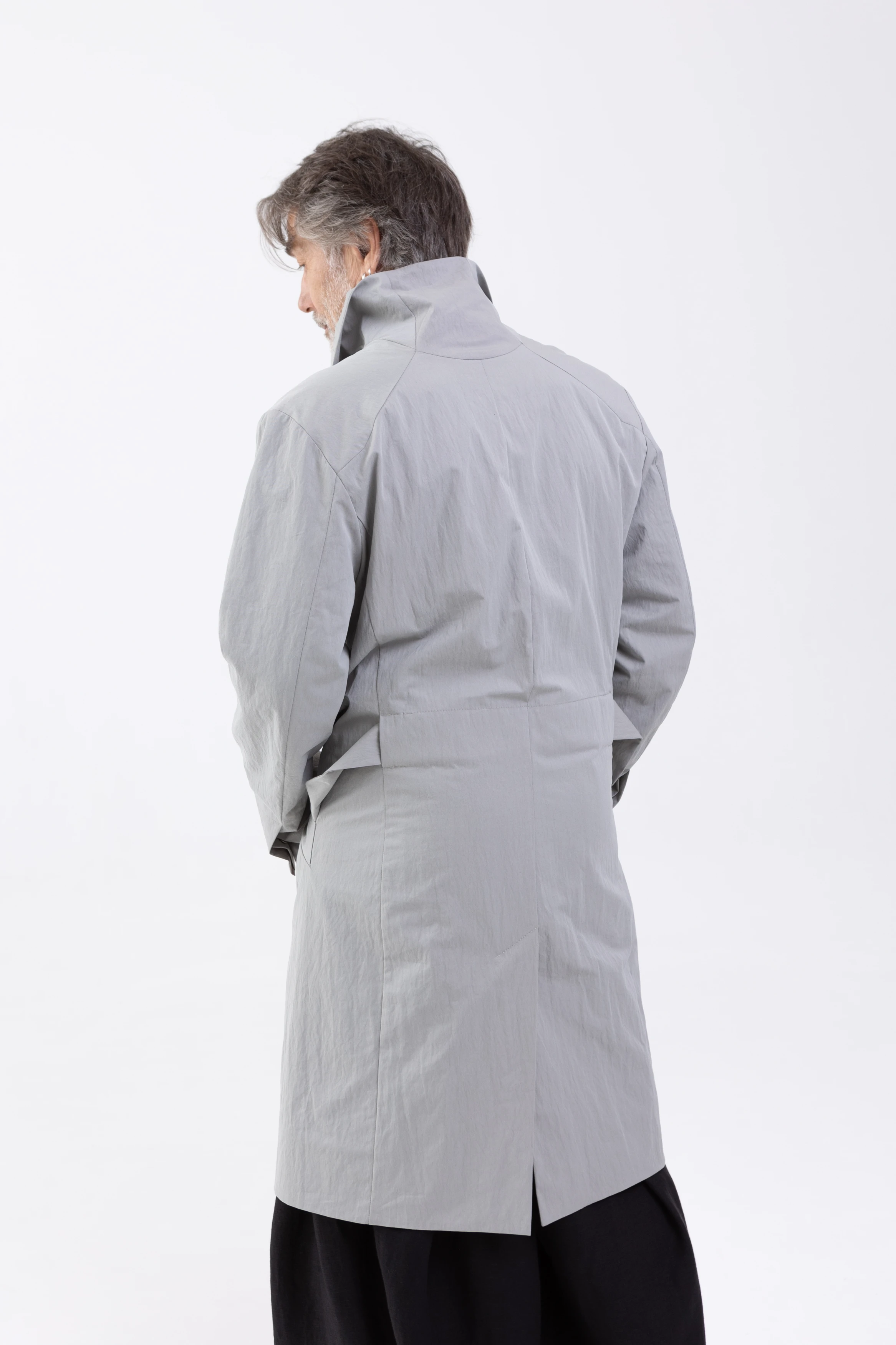 Лёгкий плащ свободного, полуприлегающего, слегка приталенного силуэта. Достаточно просторный, чтобы носить его поверх толстовки, свитера или пиджака.