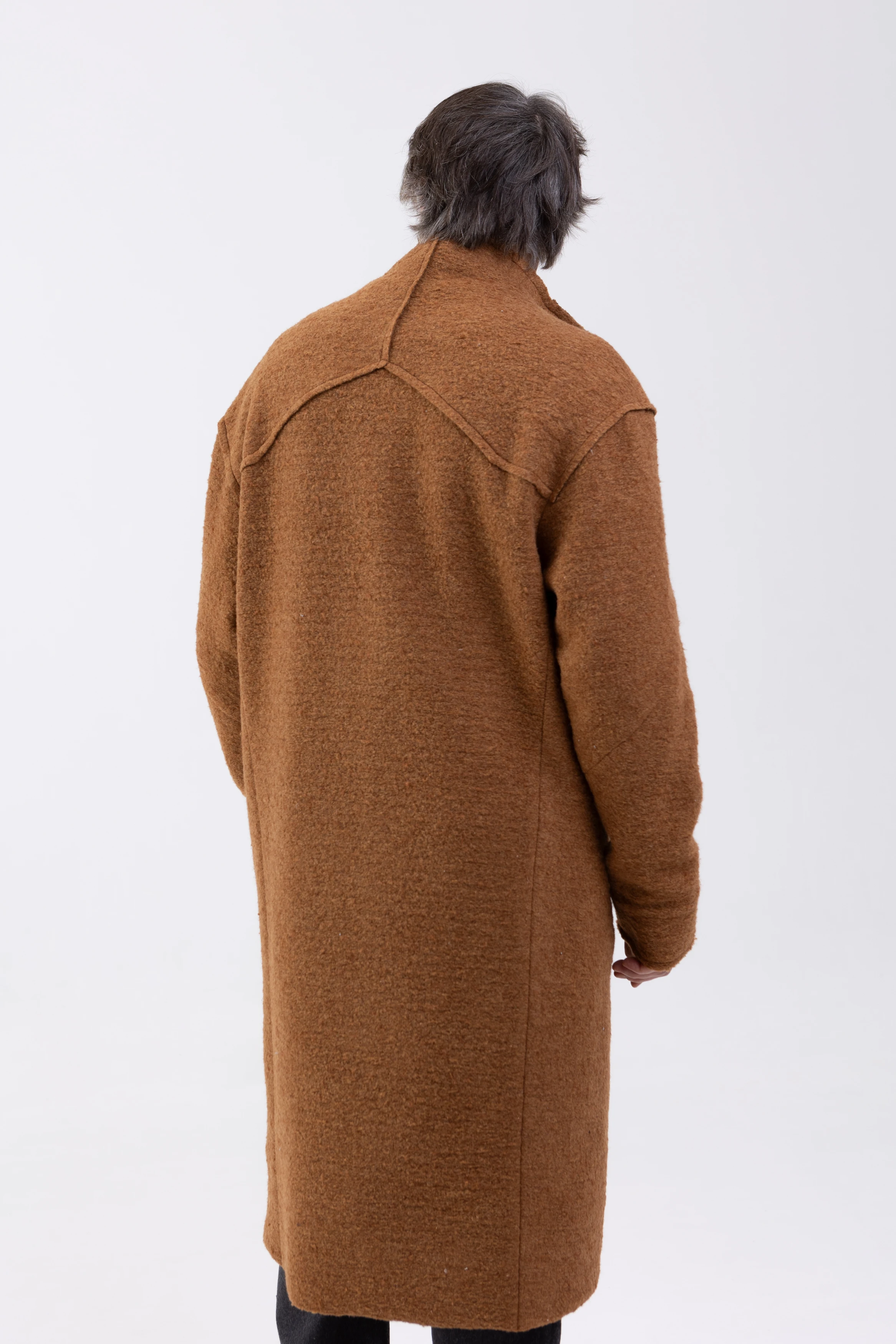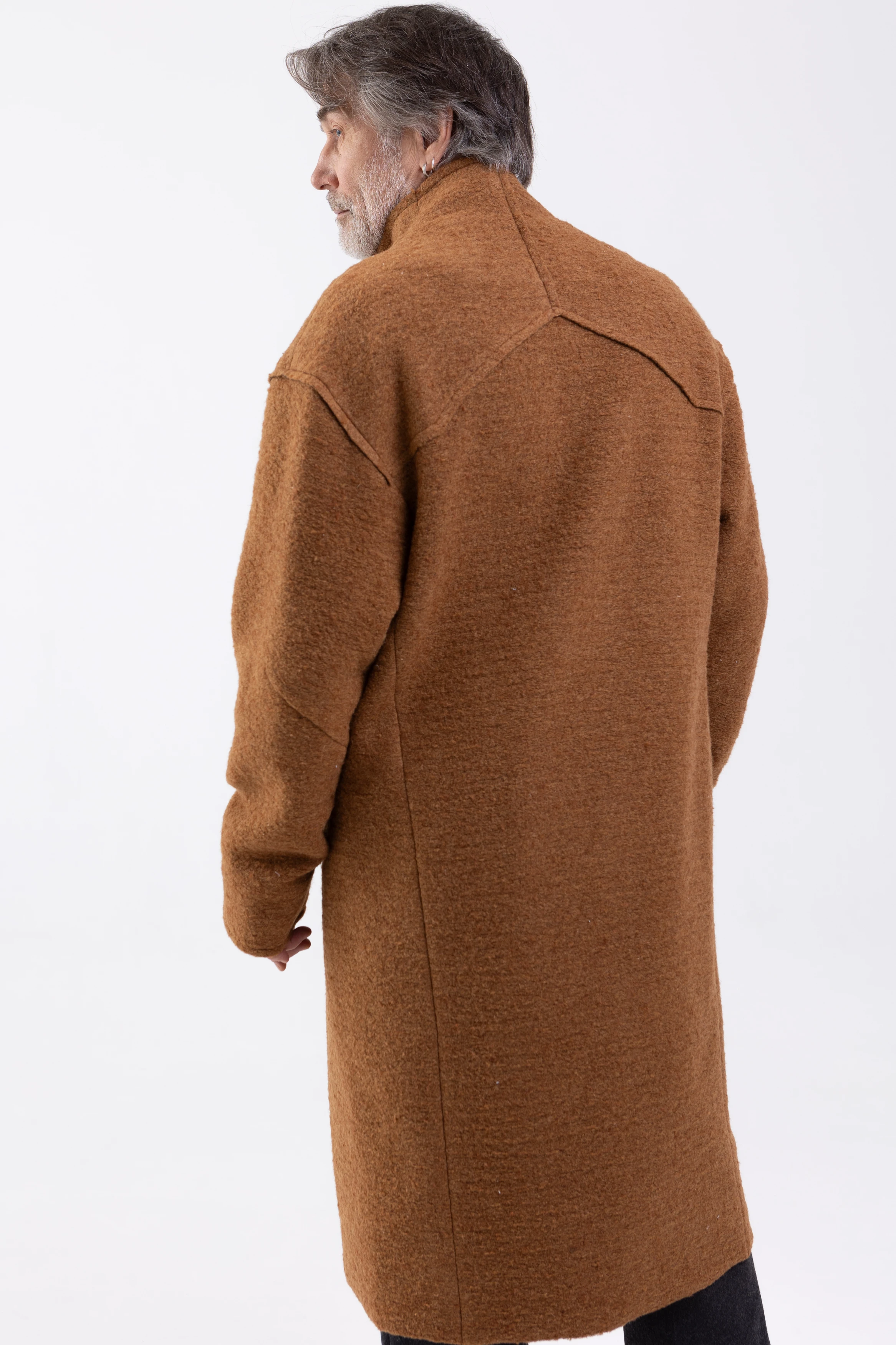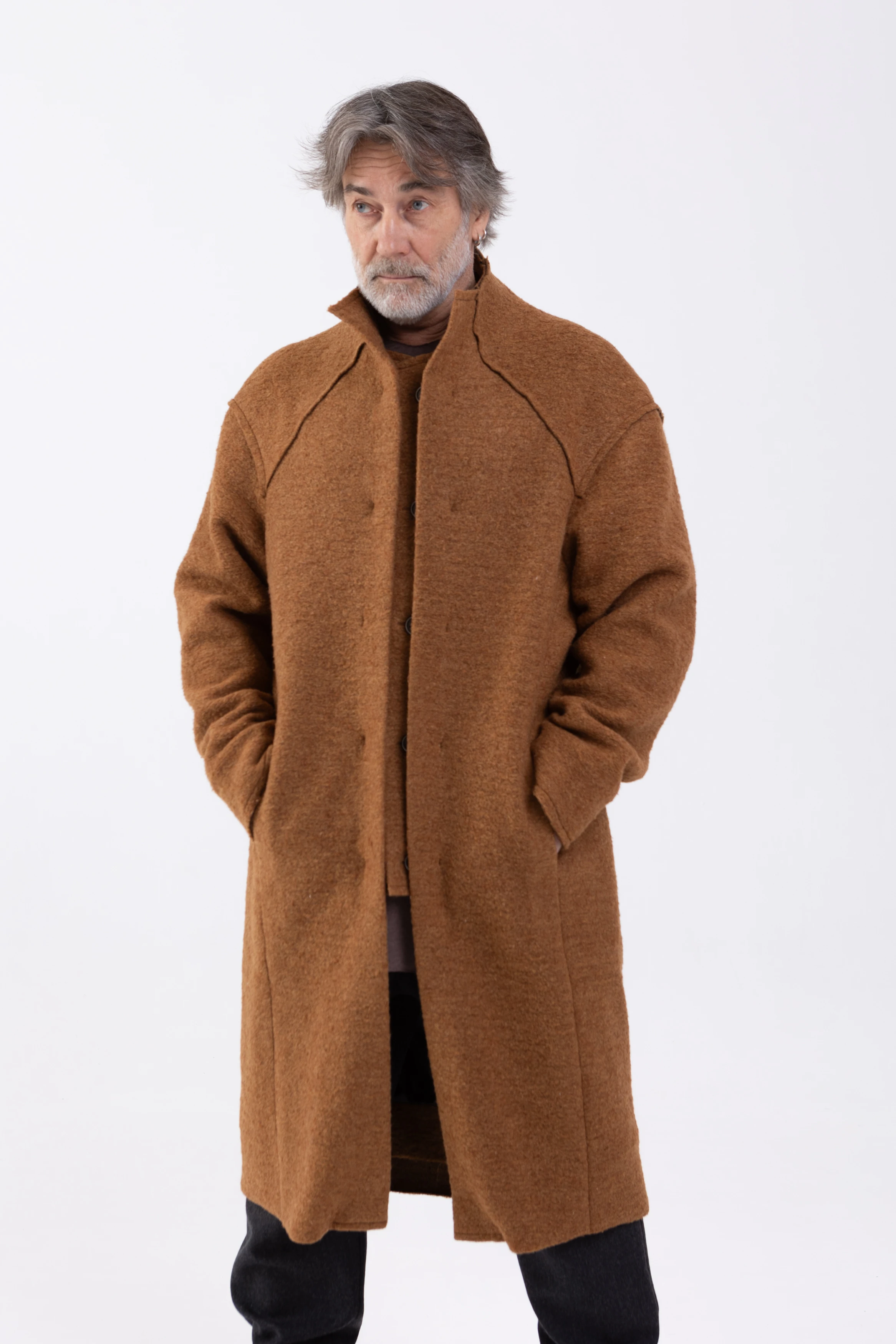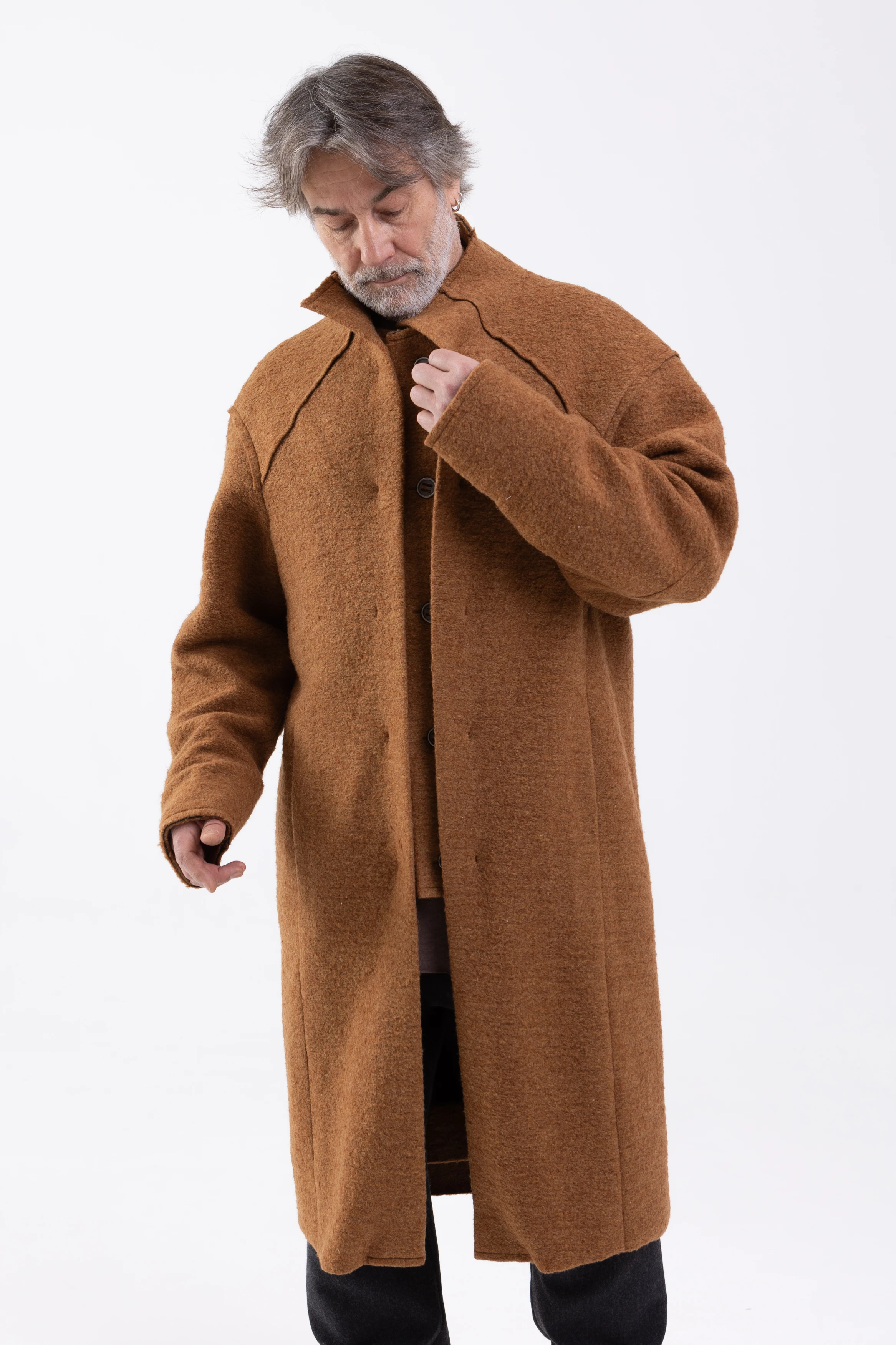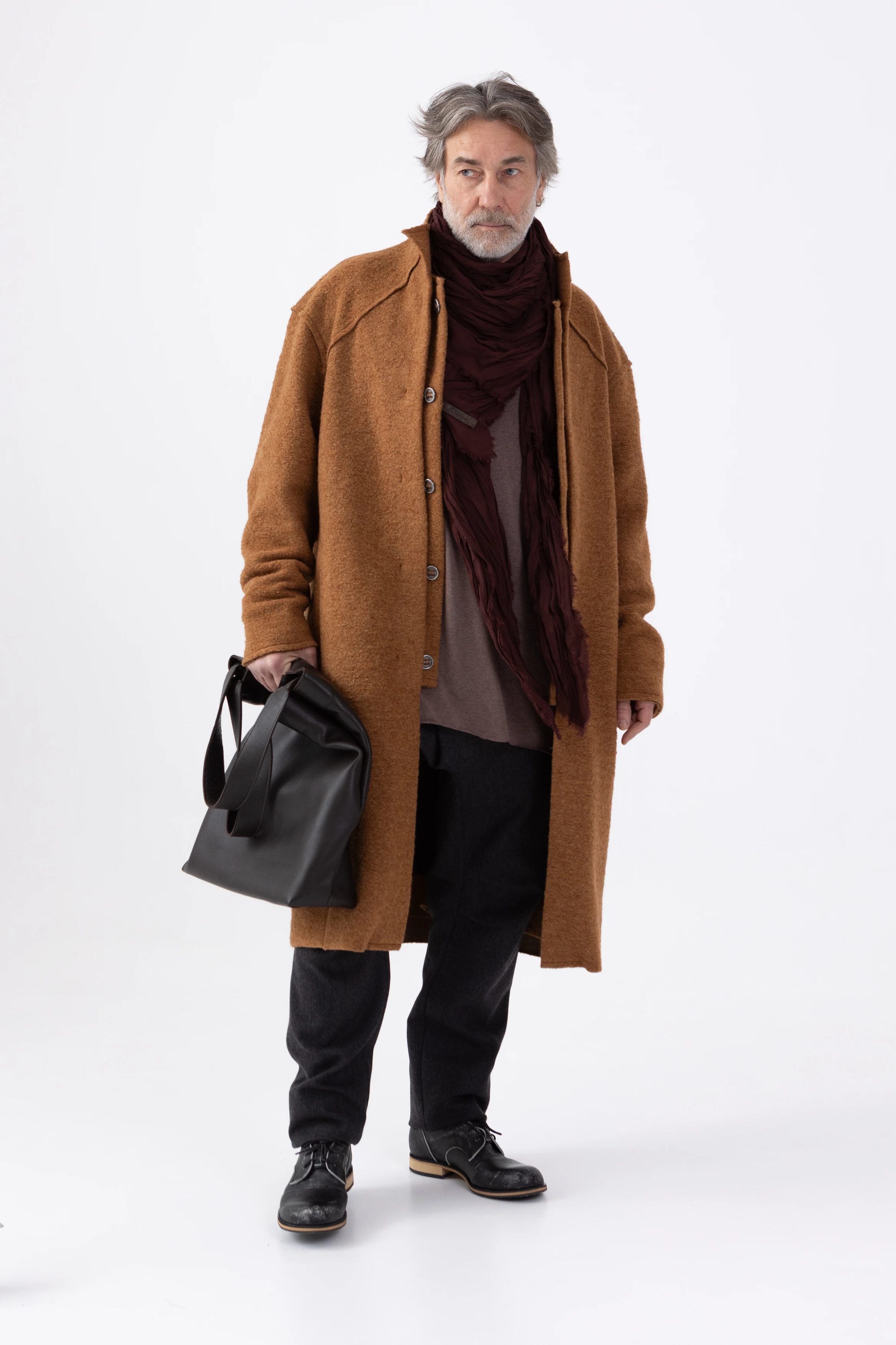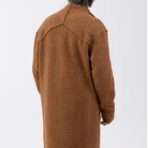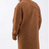 Пальто длиной чуть ниже колена. Пальто частично выполнено с обработкой "с открытыми срезами".
