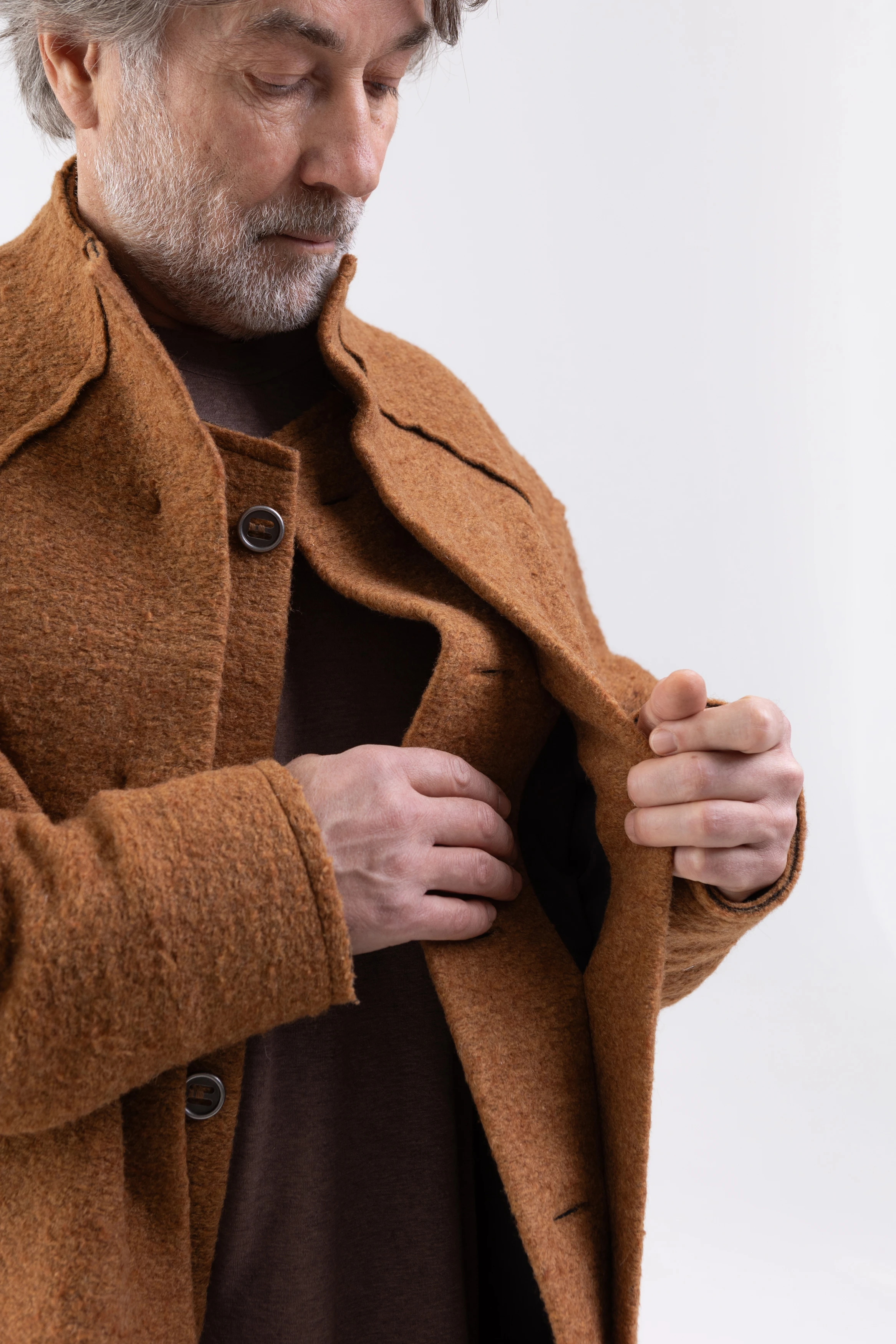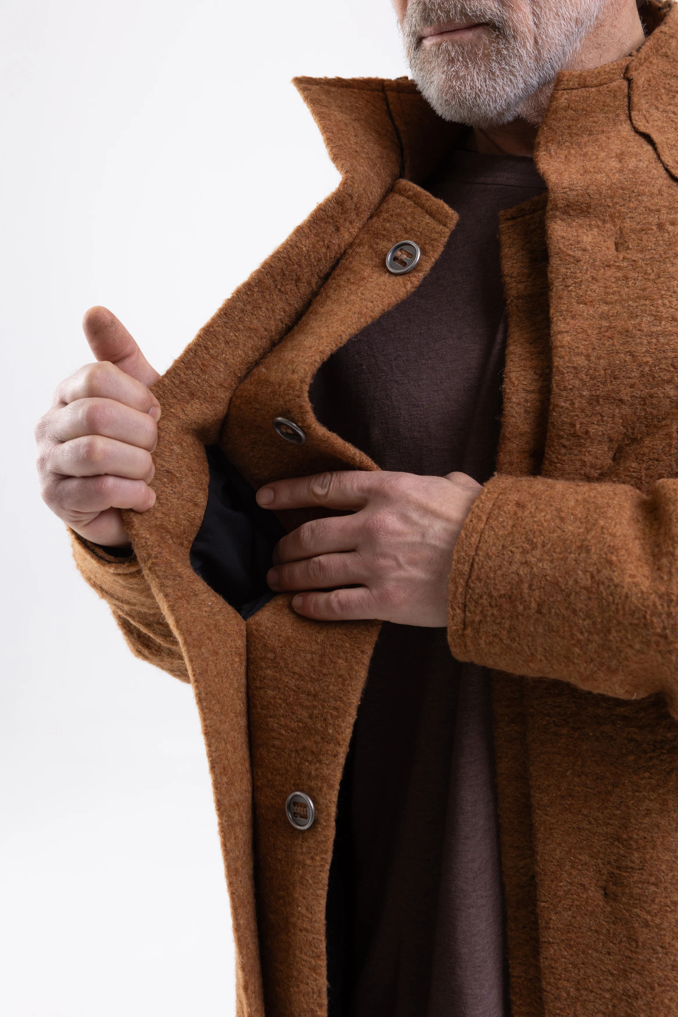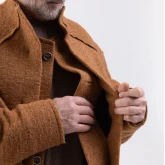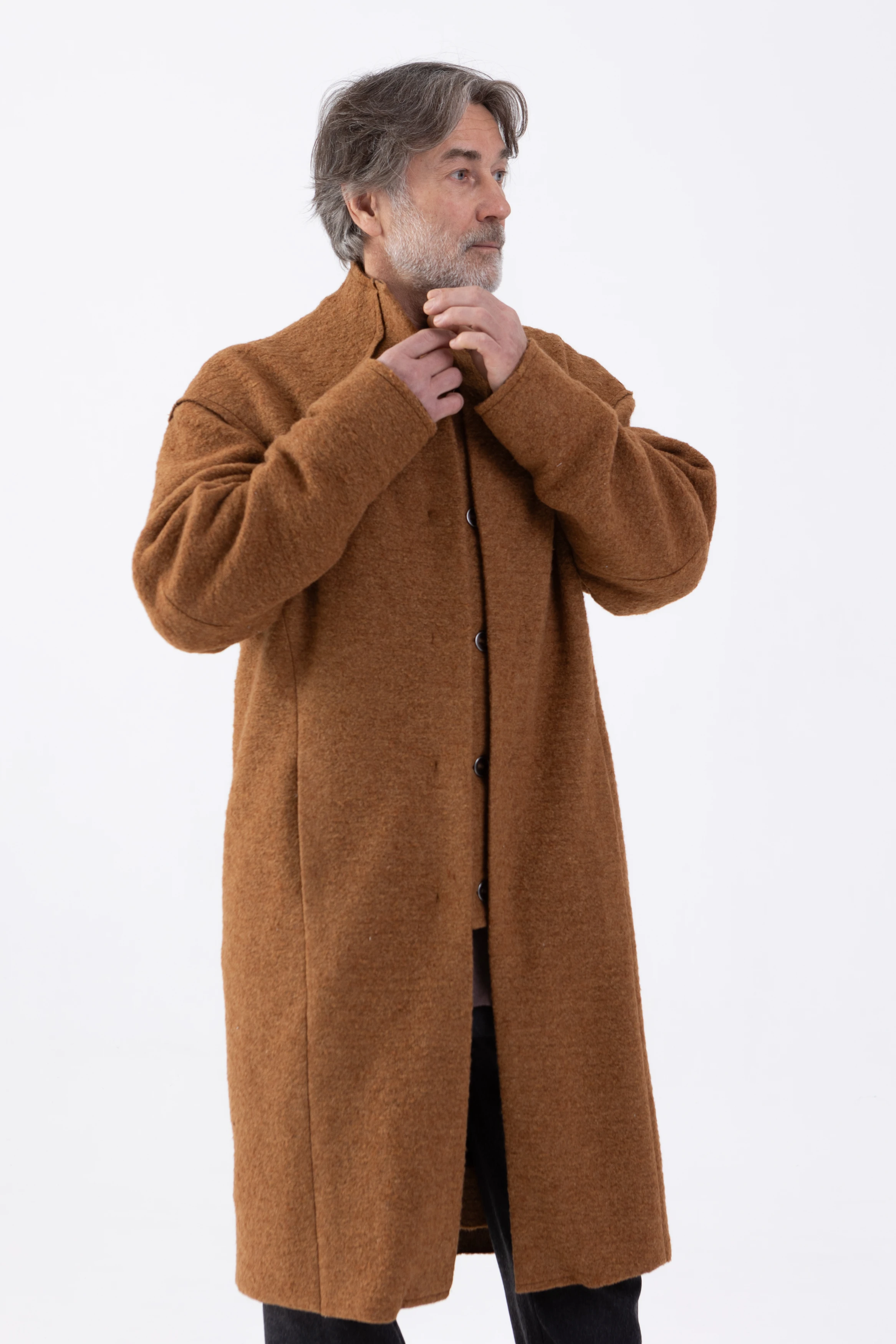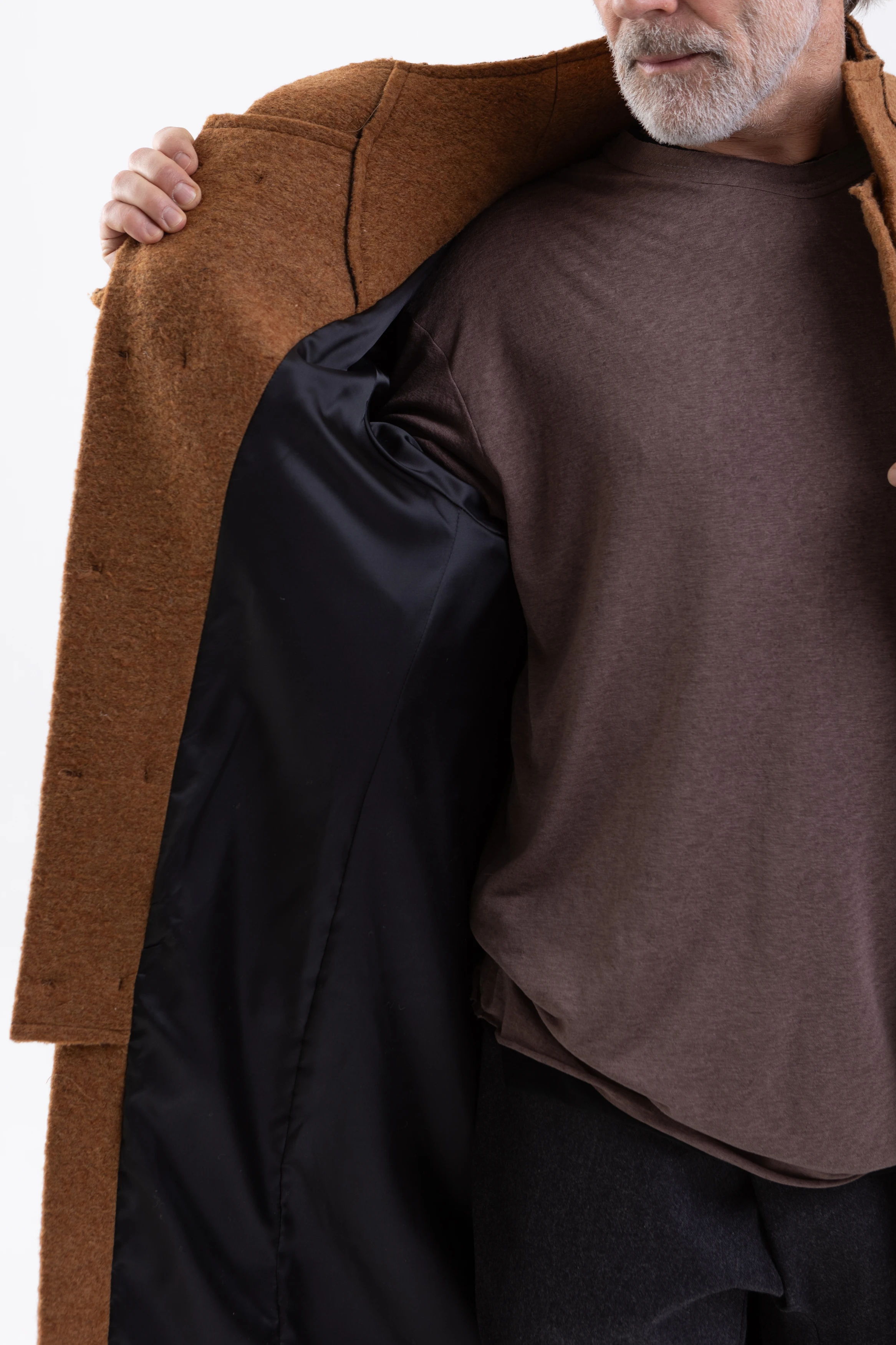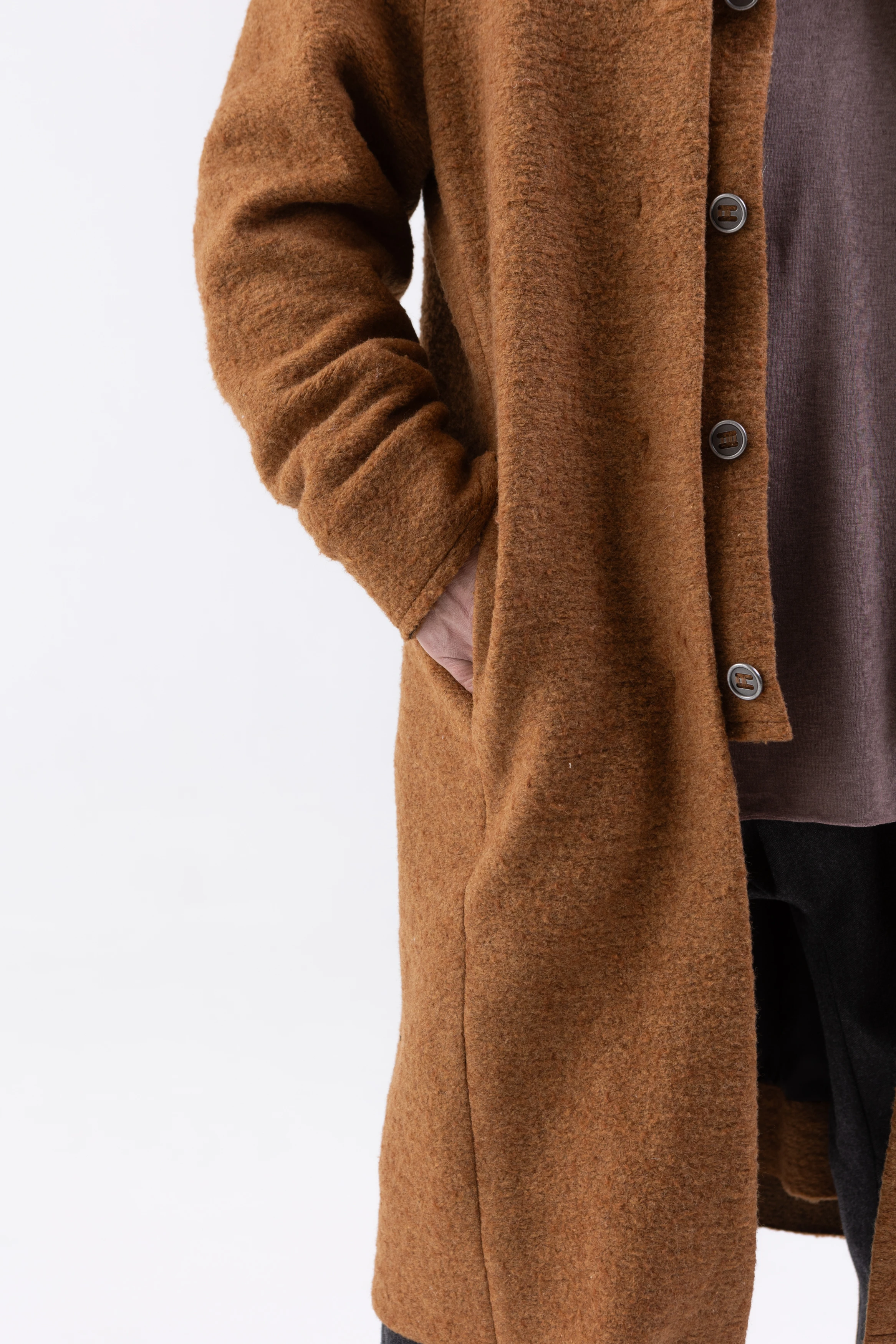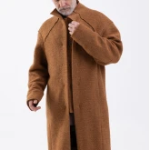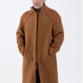 Пальто длиной чуть ниже колена. Пальто частично выполнено с обработкой "с открытыми срезами".