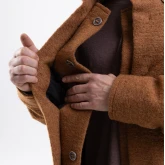 Между застежкой и передней частью пальто спрятаны два внутренних кармана. Боковые карманы смещены вперед и находятся в рельефных швах.
