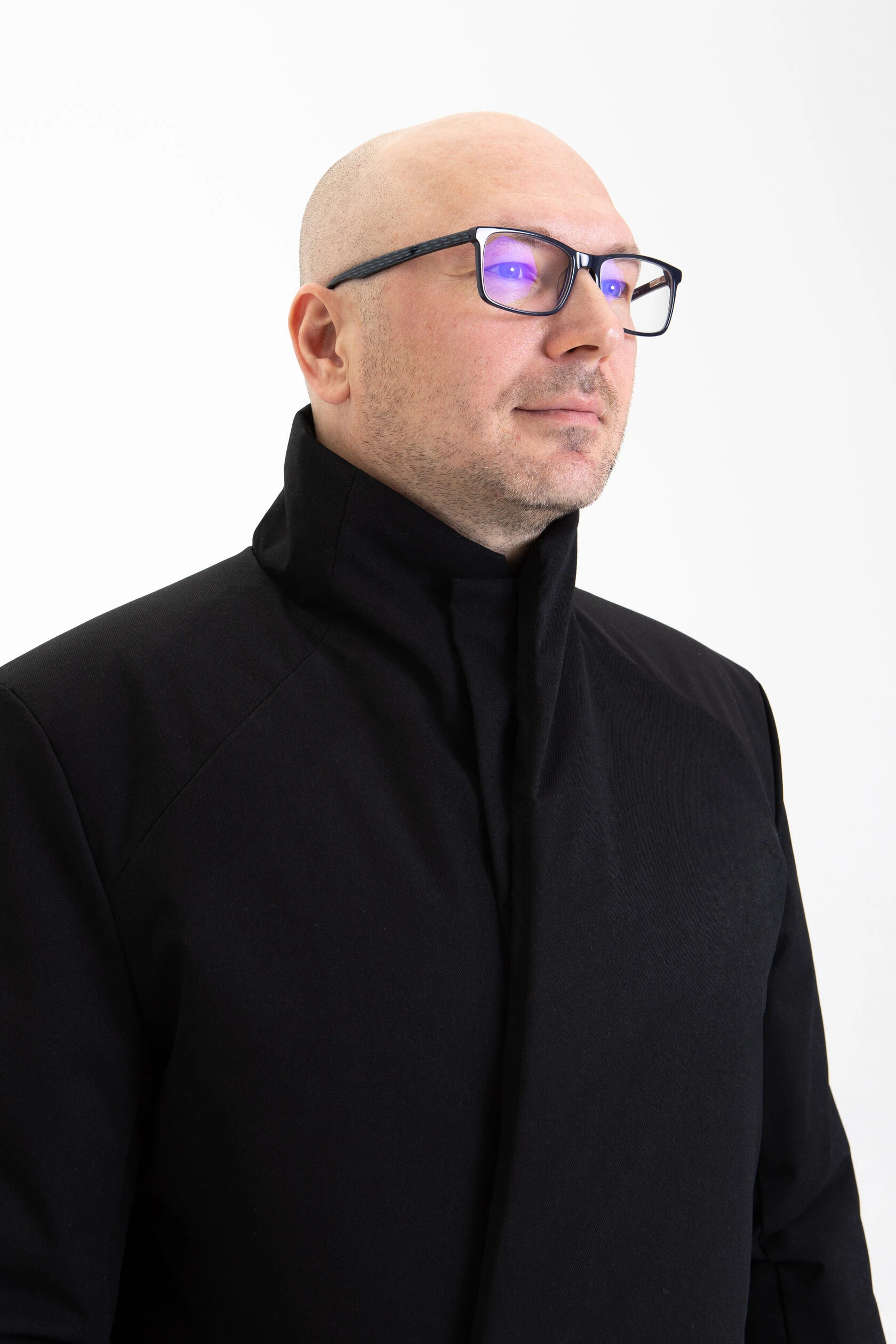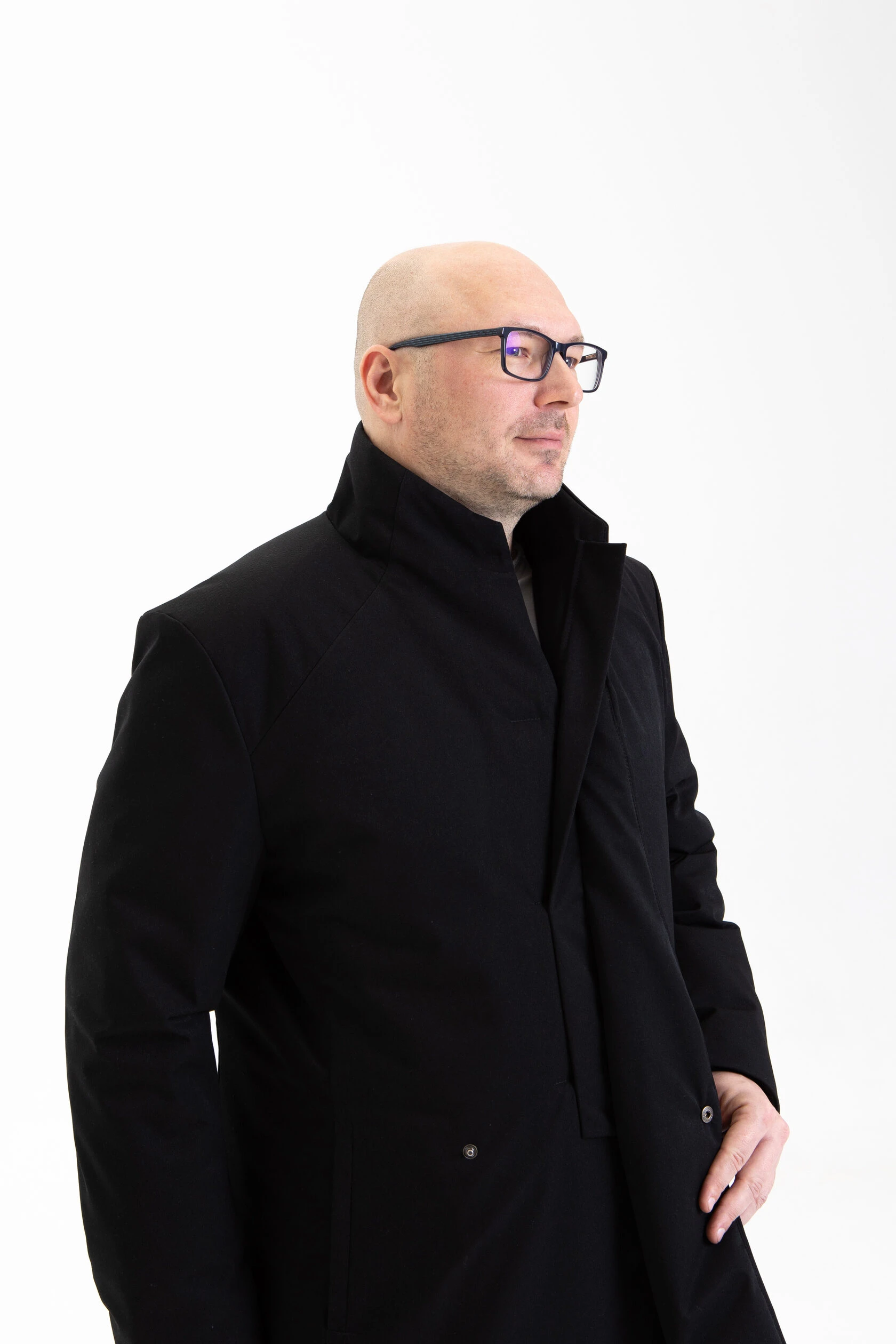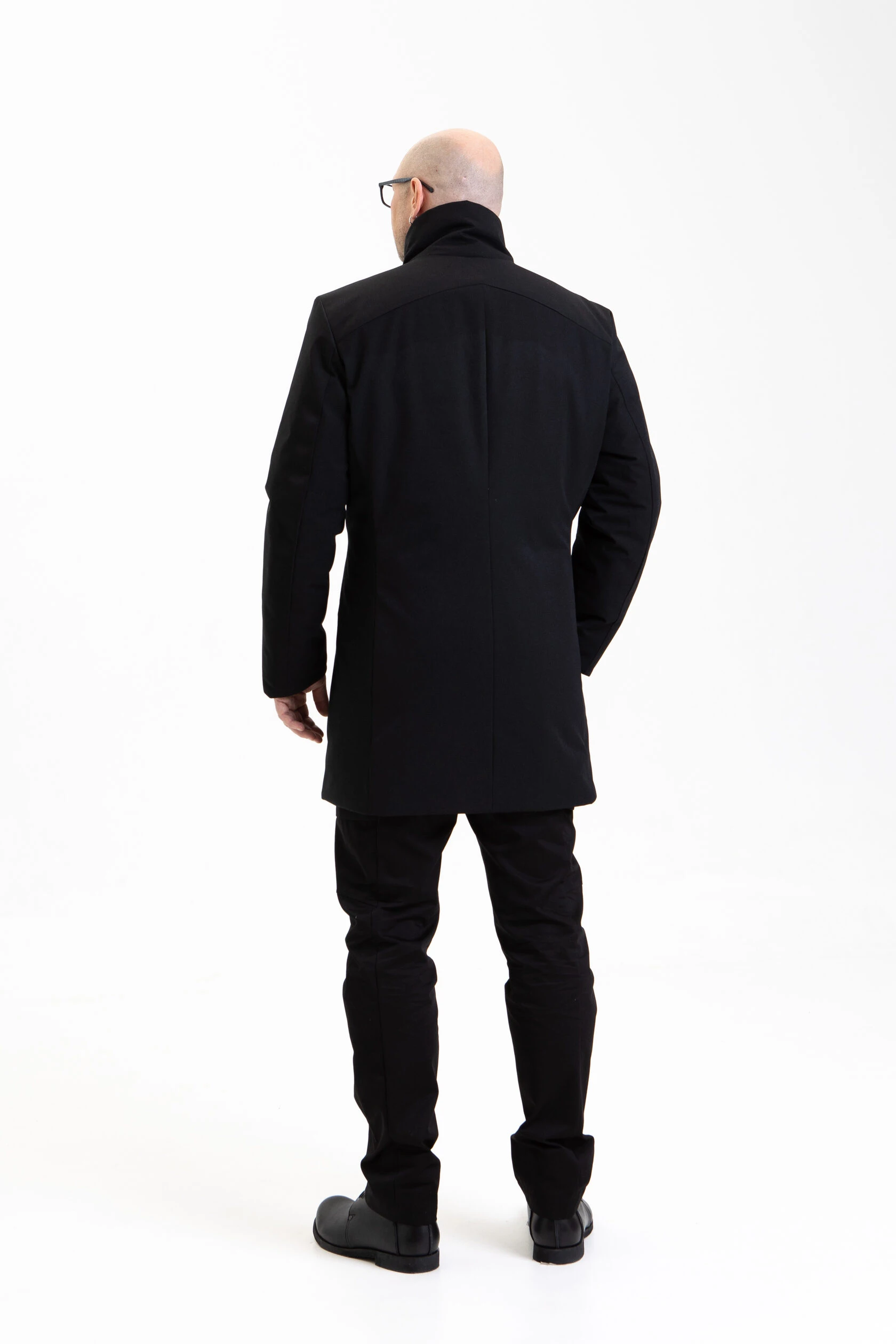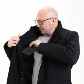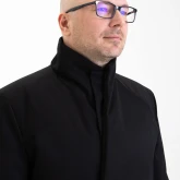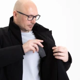 Воротник-стойка аккуратный и близкий к шее. Объёмный шарф лучше намотать поверх воротника. Спереди воротник ниже, чем сзади, чтобы он не упирался в кадык и не спорил с бородой. Поверх него комфортно укладывается даже самая окладистая борода.