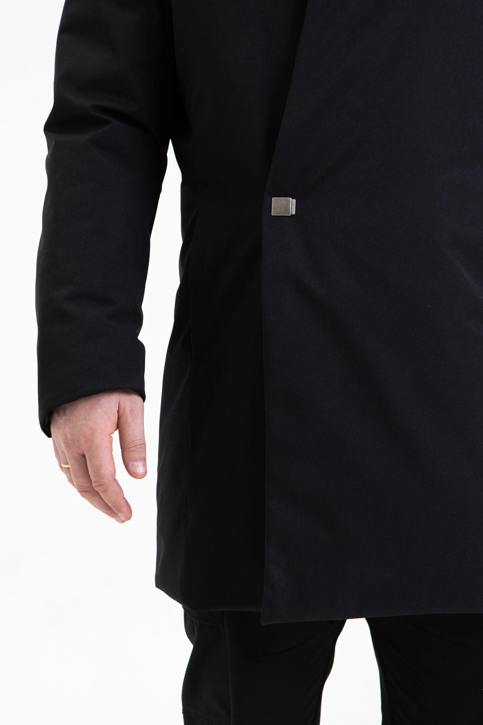 Пальто застёгивается на магниты. Магнитная планка слегка выглядывает из-под воротника, а затем прячется под полы пальто. На талии предусмотрена дополнительная застёжка на кнопку.