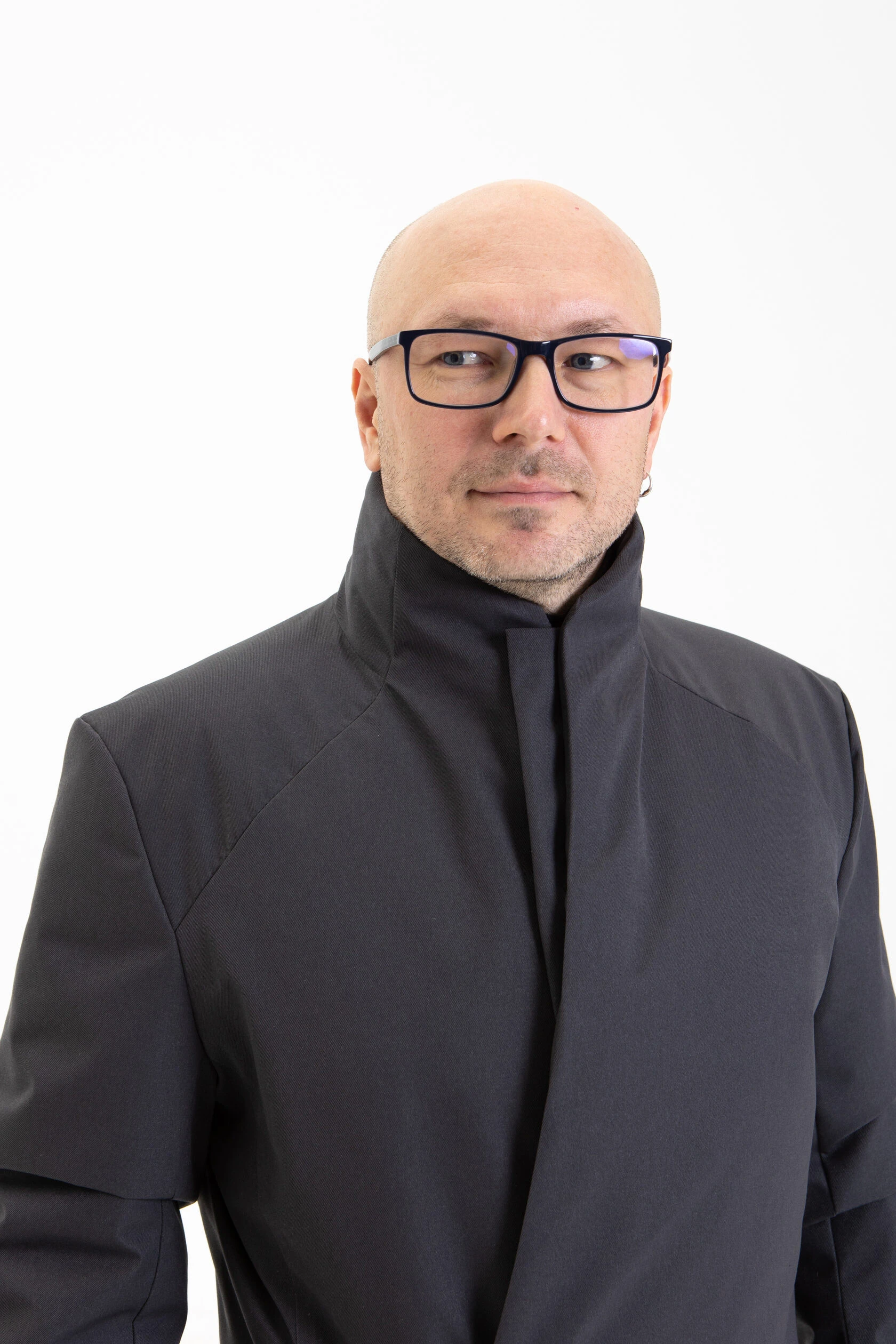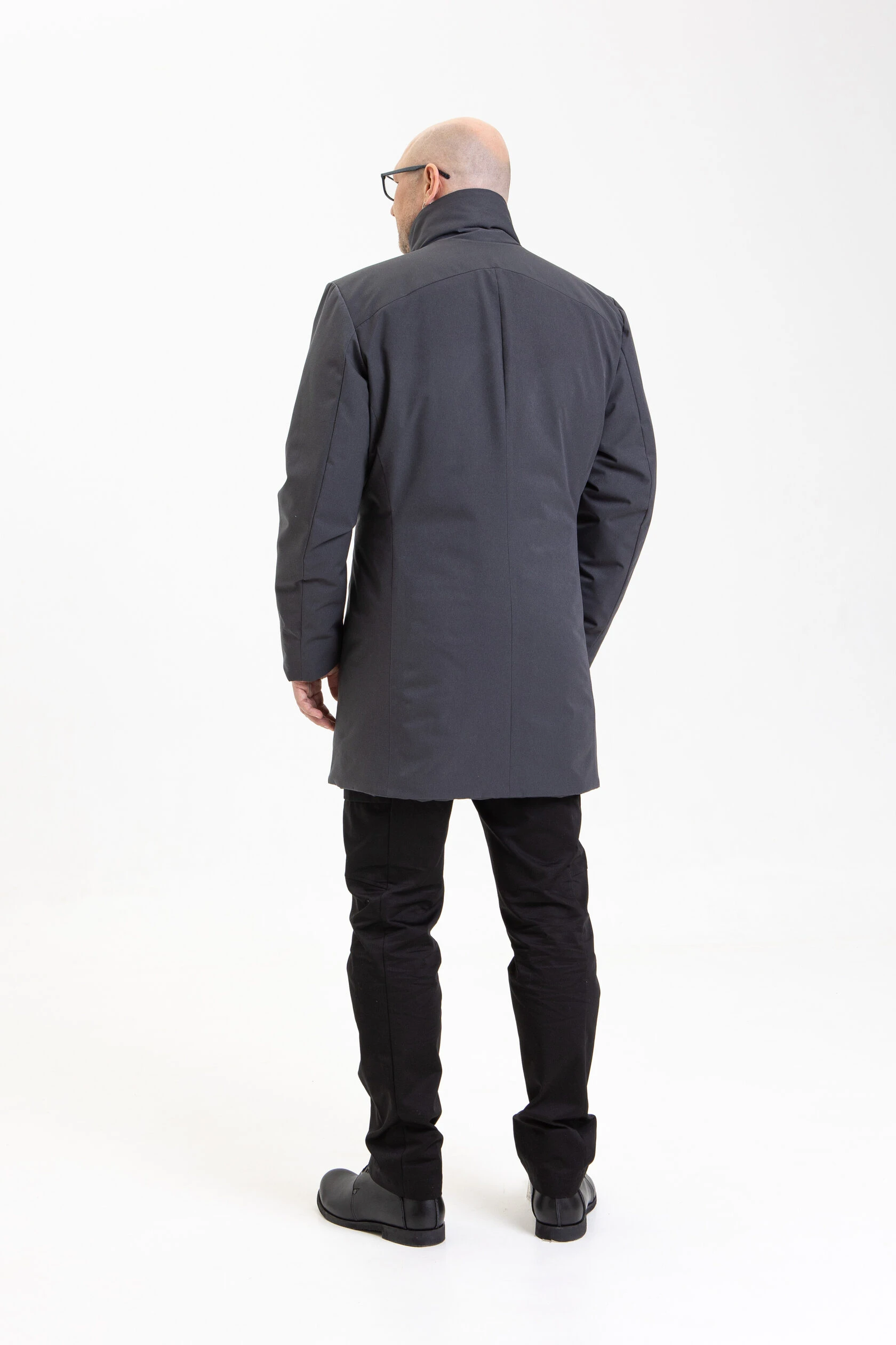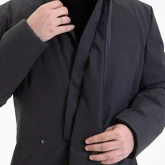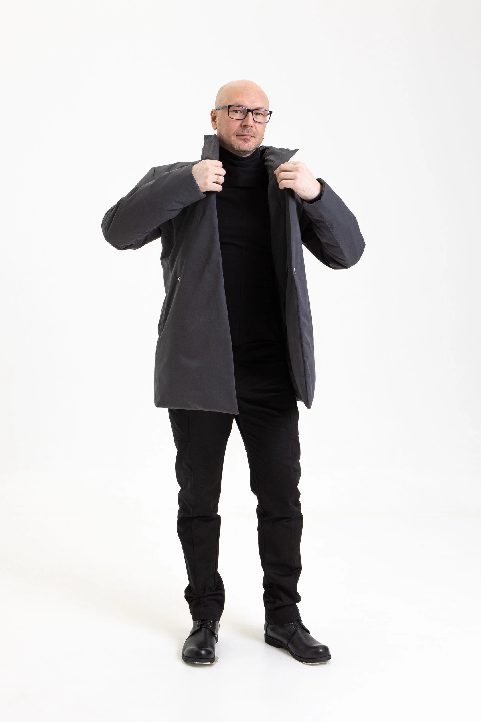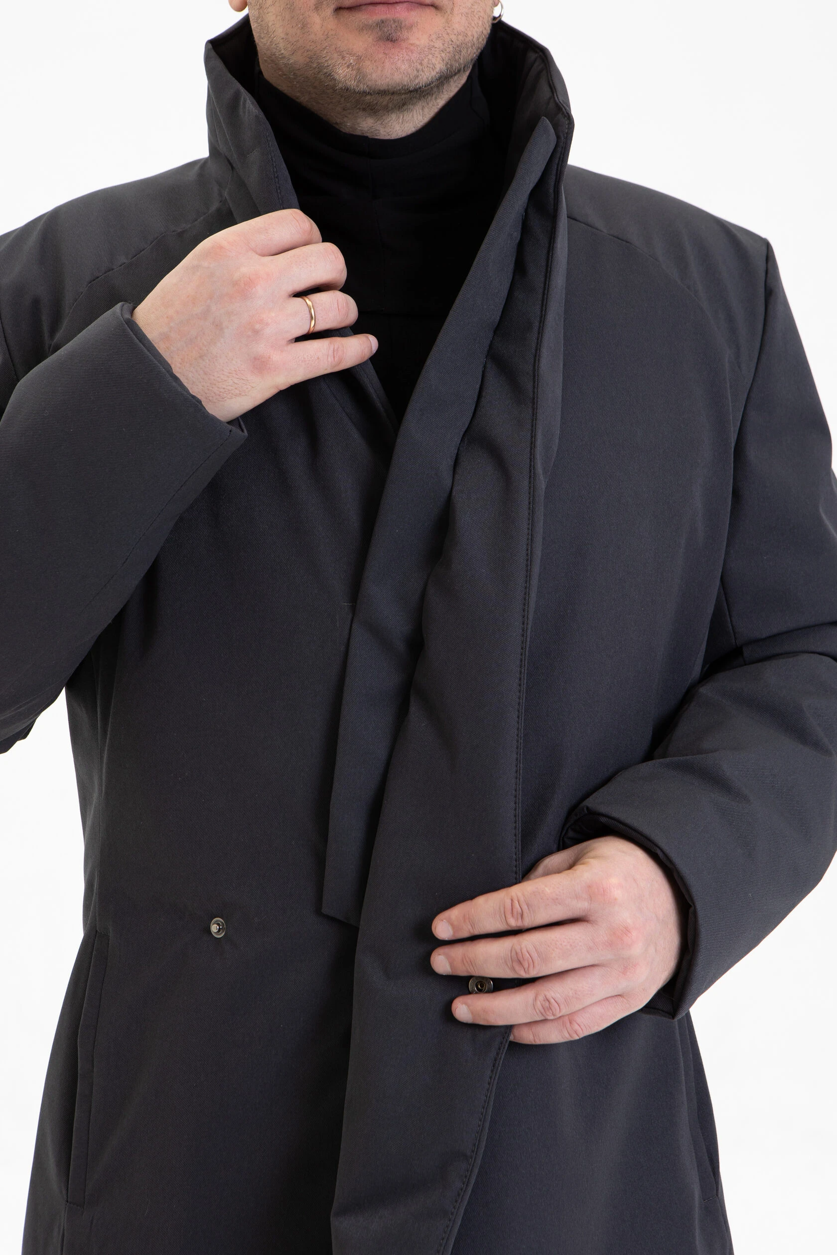 Воротник-стойка аккуратный и близкий к шее. Объёмный шарф лучше намотать поверх воротника. Спереди воротник ниже, чем сзади, чтобы он не упирался в кадык и не спорил с бородой. Поверх него комфортно укладывается даже самая окладистая борода.