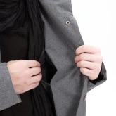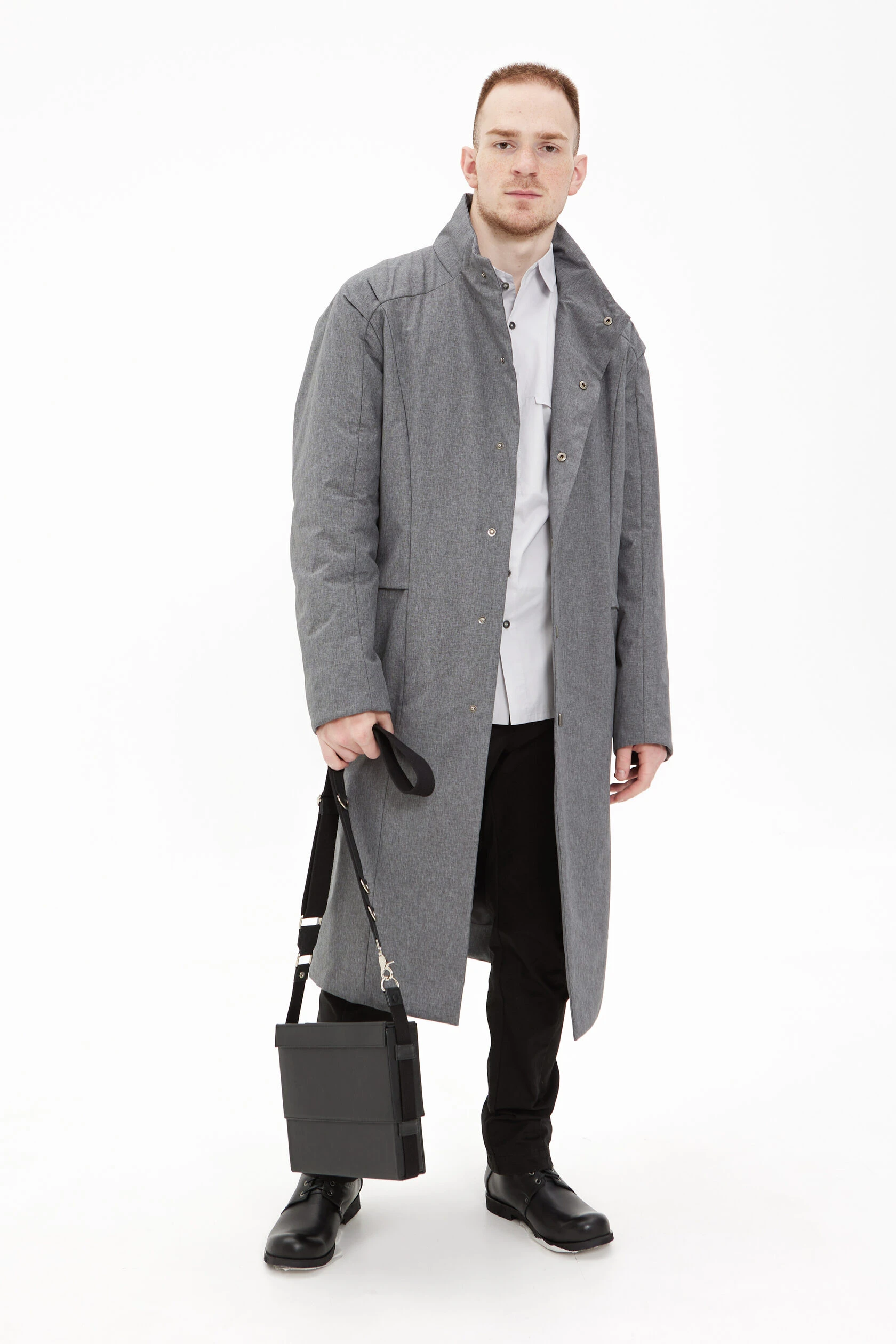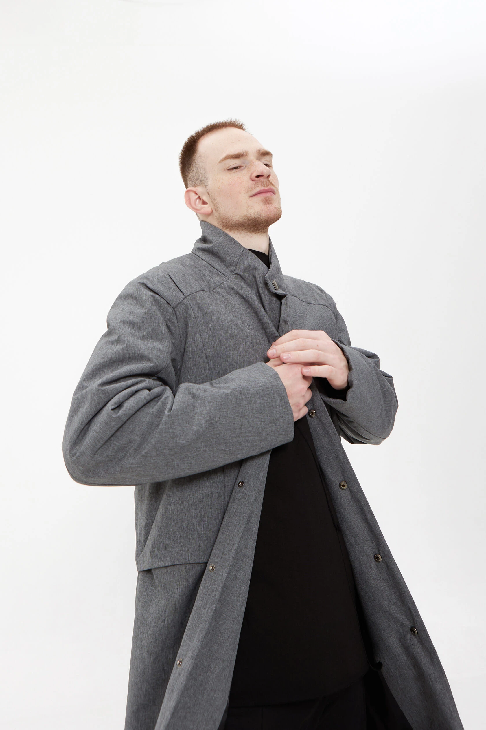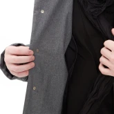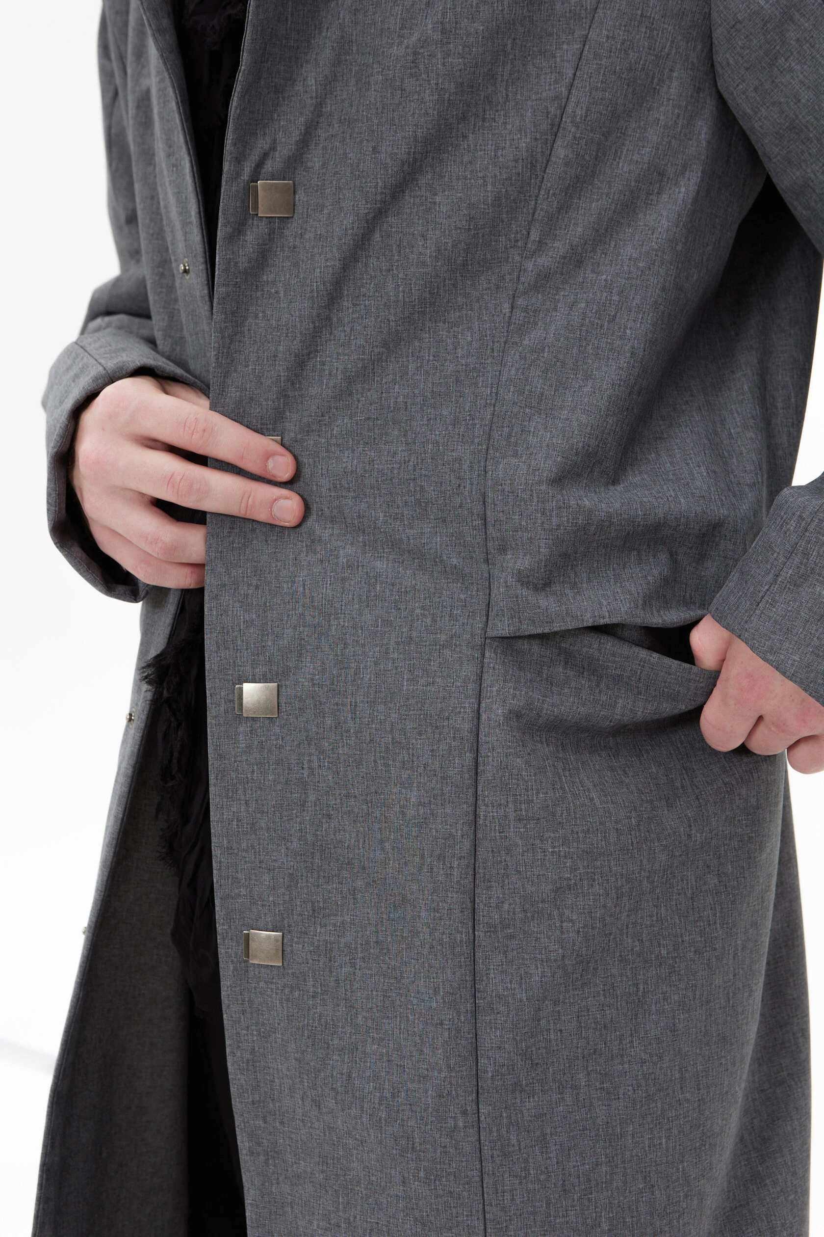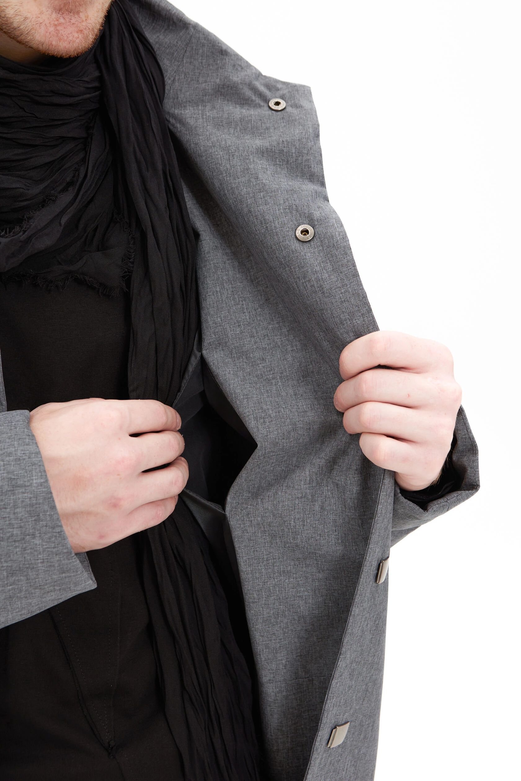 При всей своей минималистичности и даже аскетичности плащ остаётся живым и бодрым за счёт кнопок. Они квадратные, цвета чернёного серебра. У этих кнопок закрытые обратные части: если вы расстегнёте воротник, у вас не будет торчать «дырявая» задняя сторона кнопки — вместо этого видна аккуратная закрытая деталь.