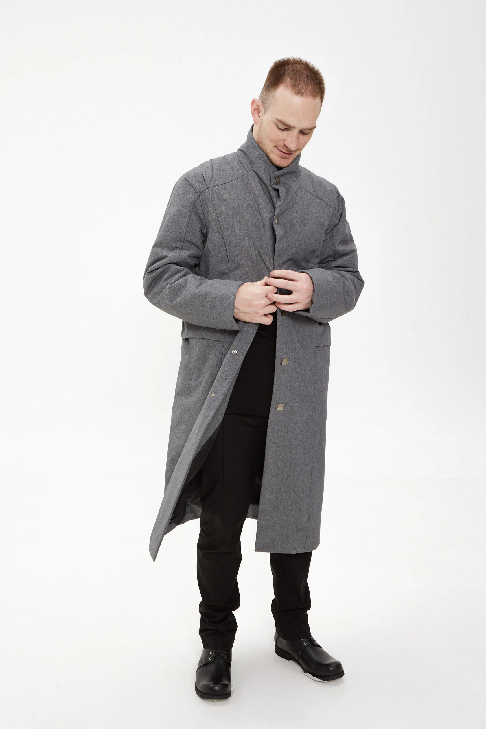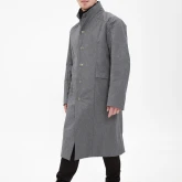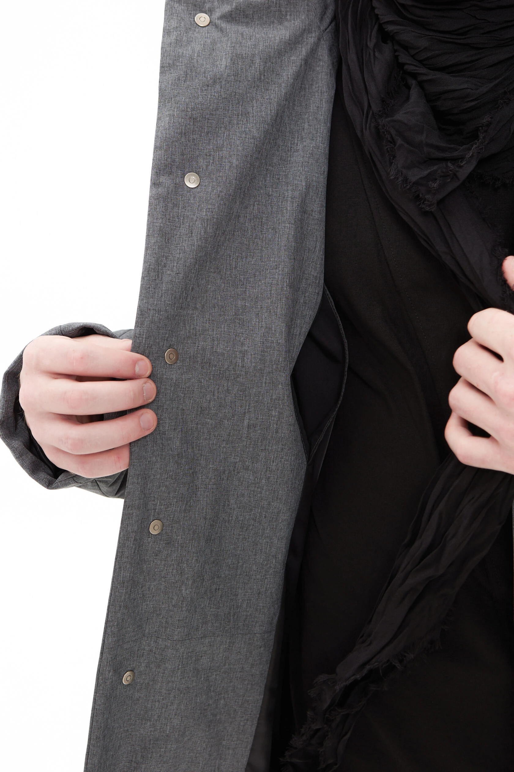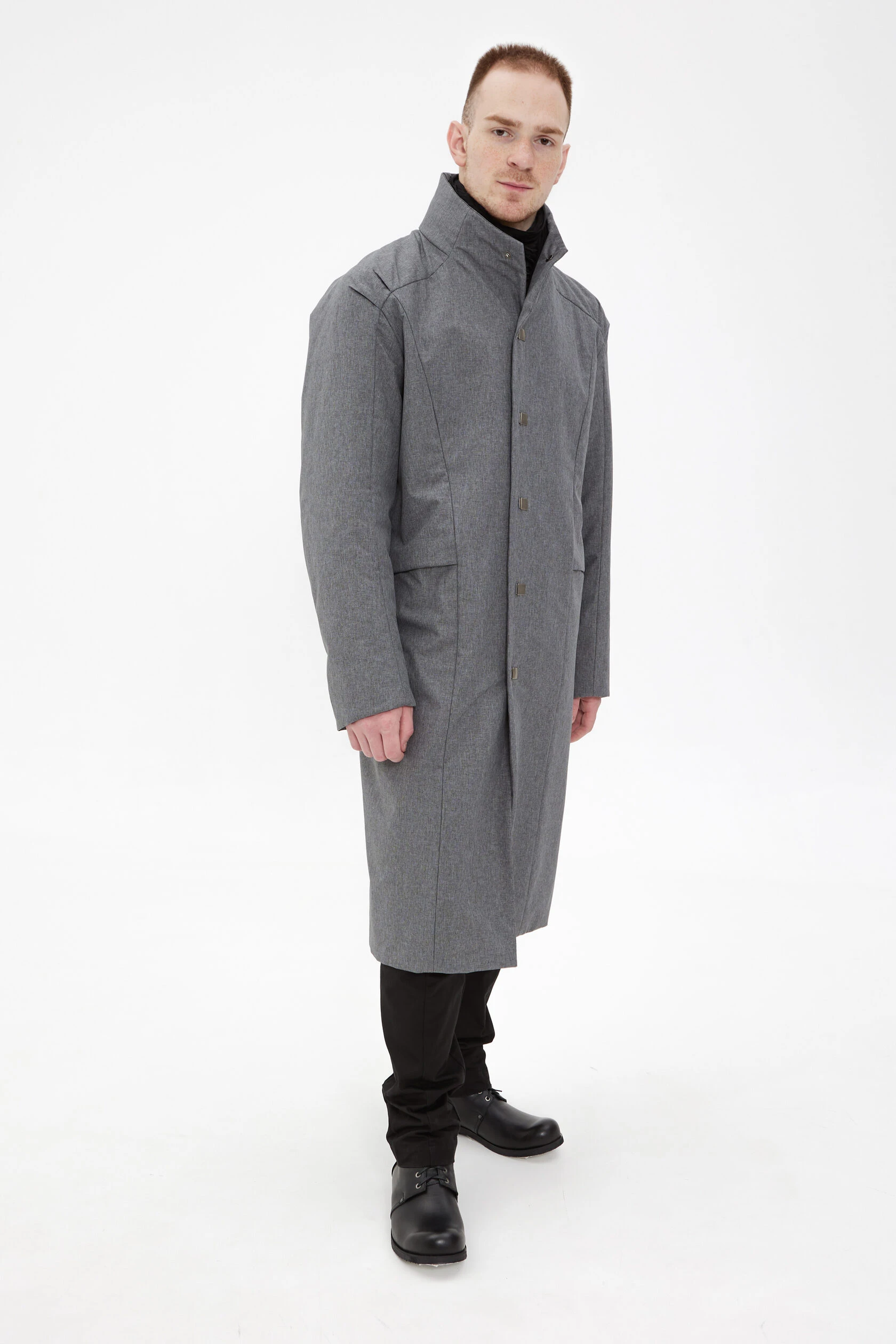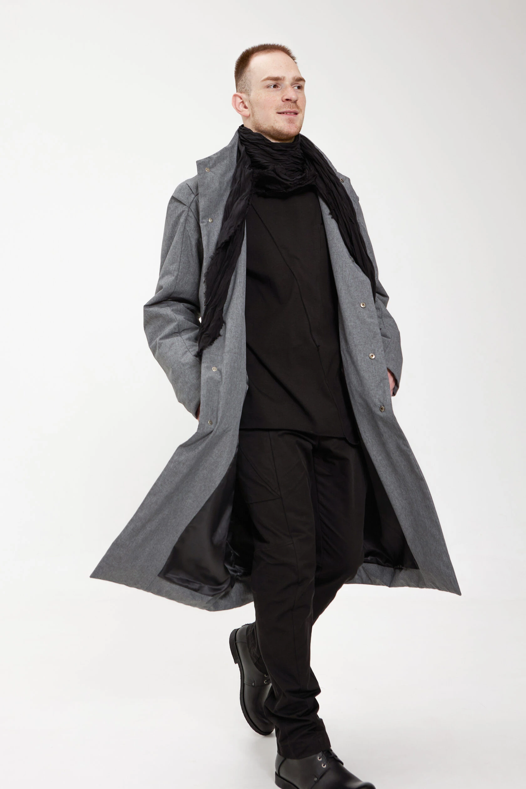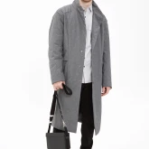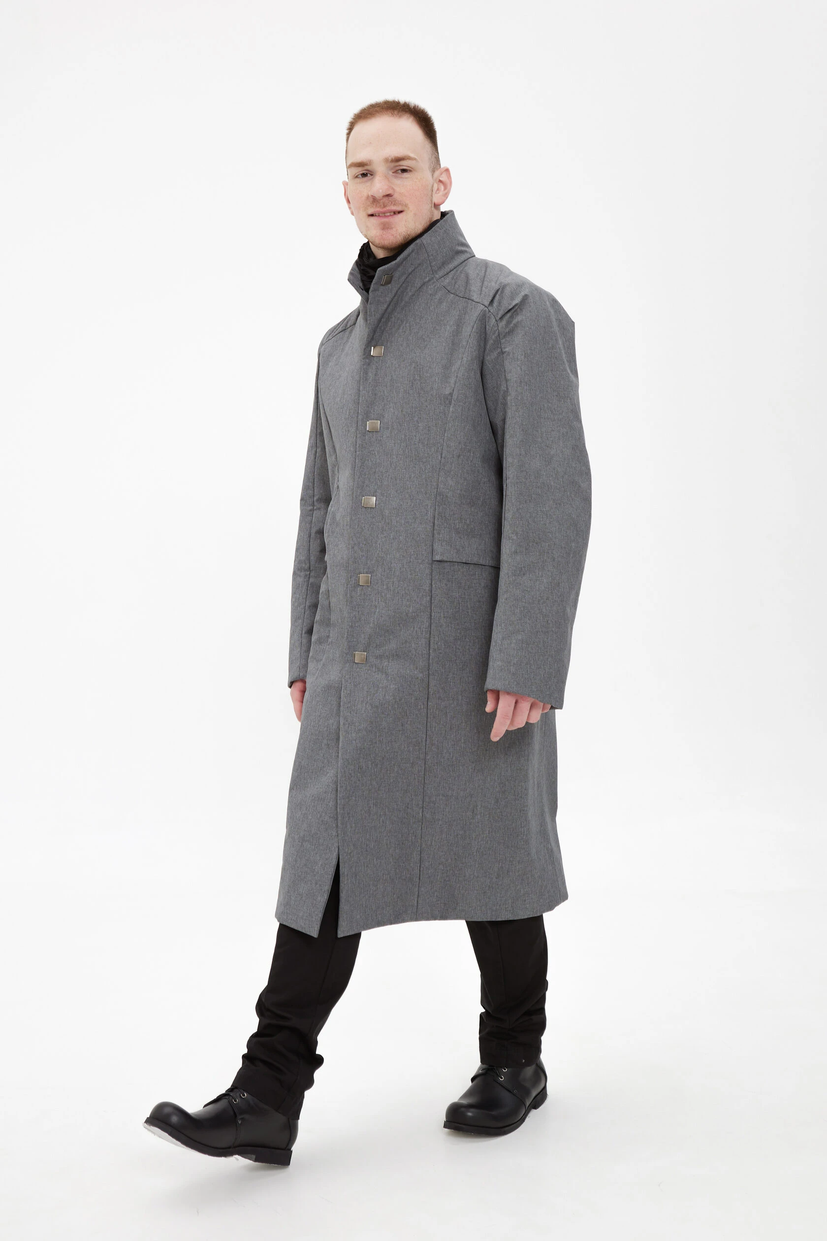 При всей своей минималистичности и даже аскетичности плащ остаётся живым и бодрым за счёт кнопок. Они квадратные, цвета чернёного серебра. У этих кнопок закрытые обратные части: если вы расстегнёте воротник, у вас не будет торчать «дырявая» задняя сторона кнопки — вместо этого видна аккуратная закрытая деталь.