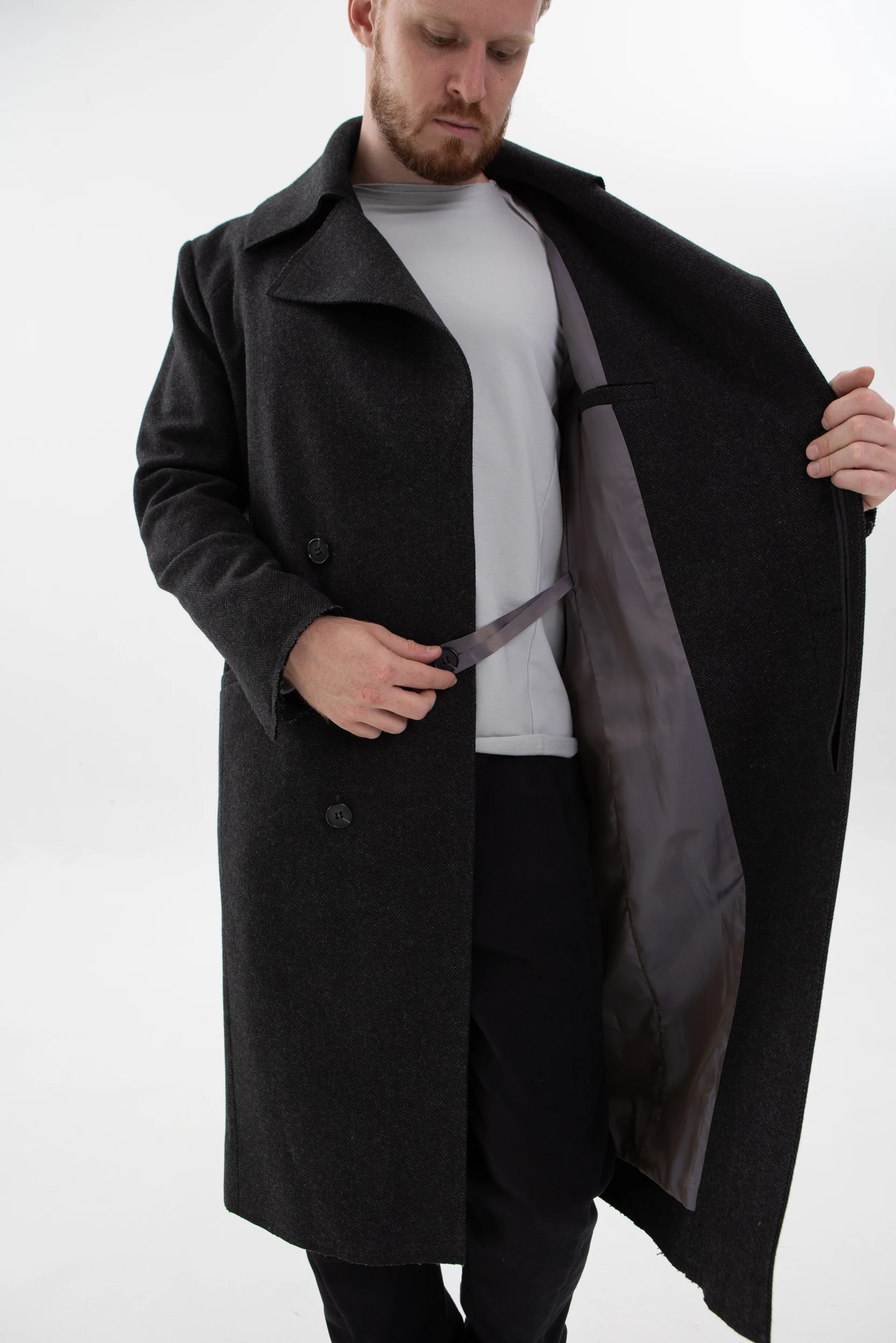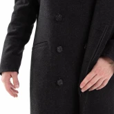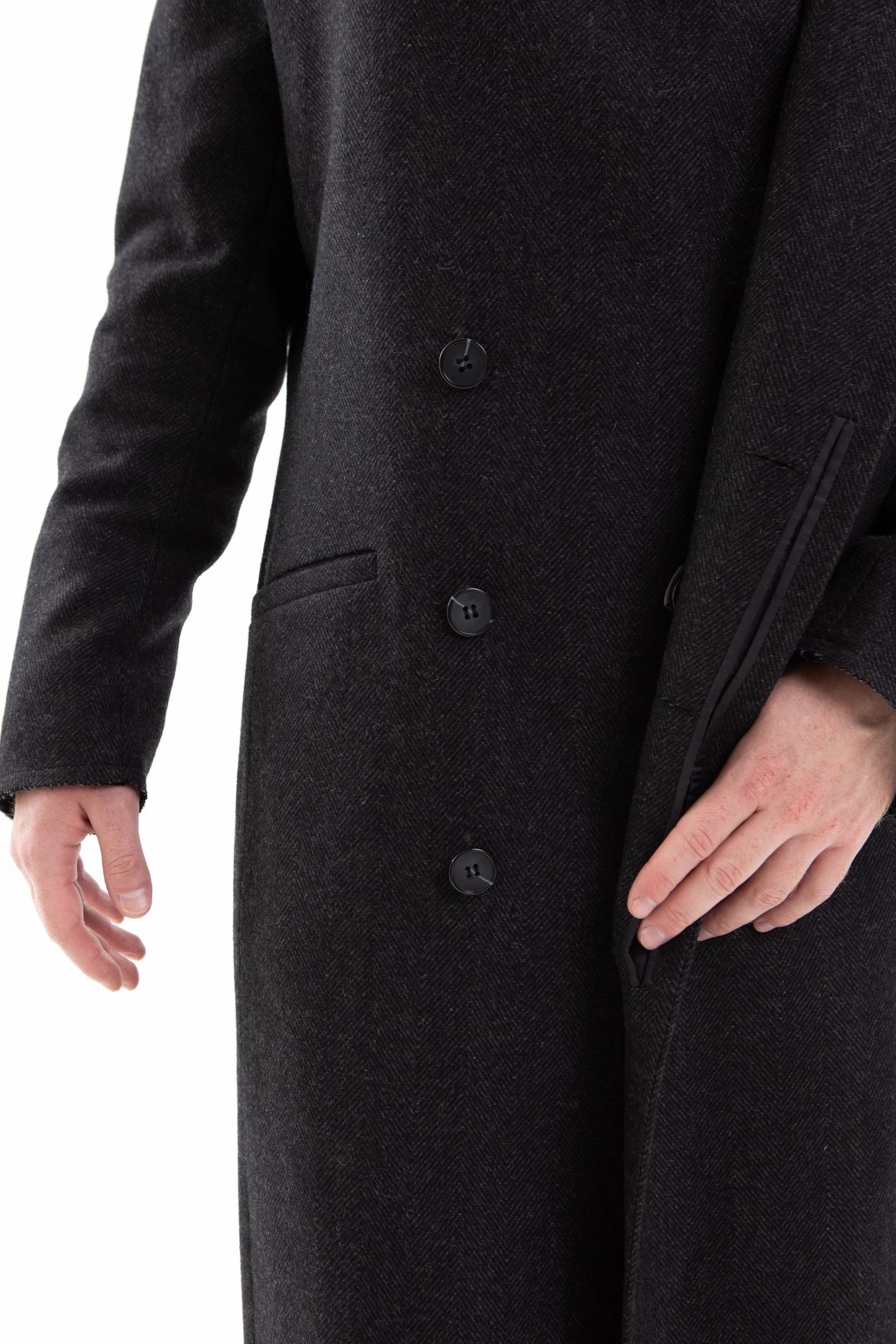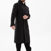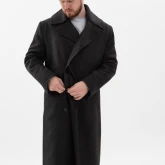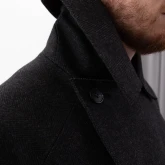 Пальто двубортное, внутренняя пола застёгивается на полодержатель, чтобы не провисала. Застёжка — супатная классическая на пуговицах. На левом лацкане выполнена петля в рамку, с помощью которой можно застегнуть пальто под самое горло.