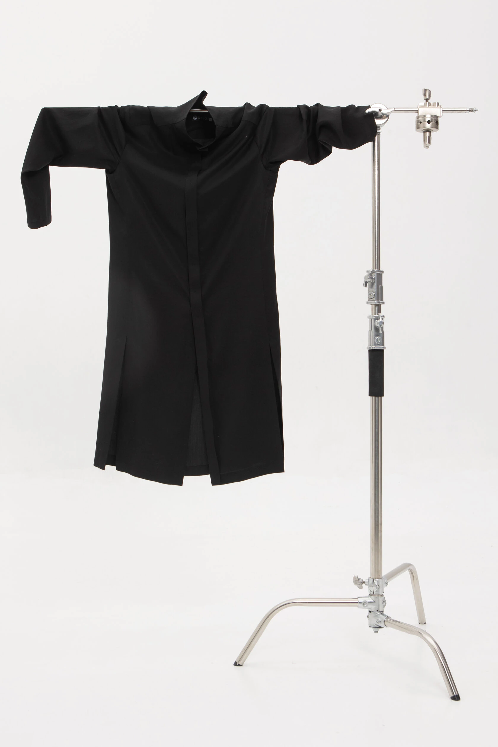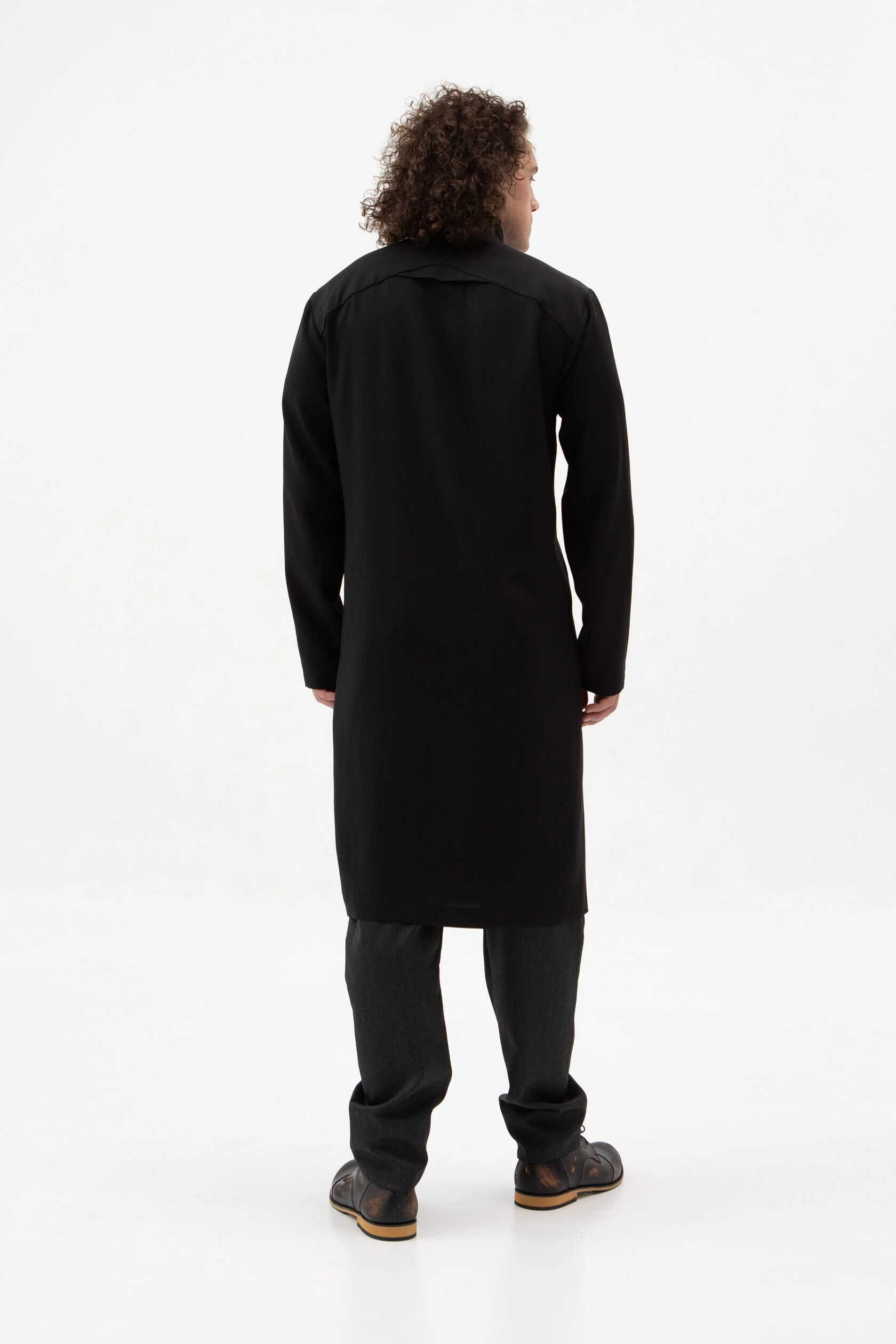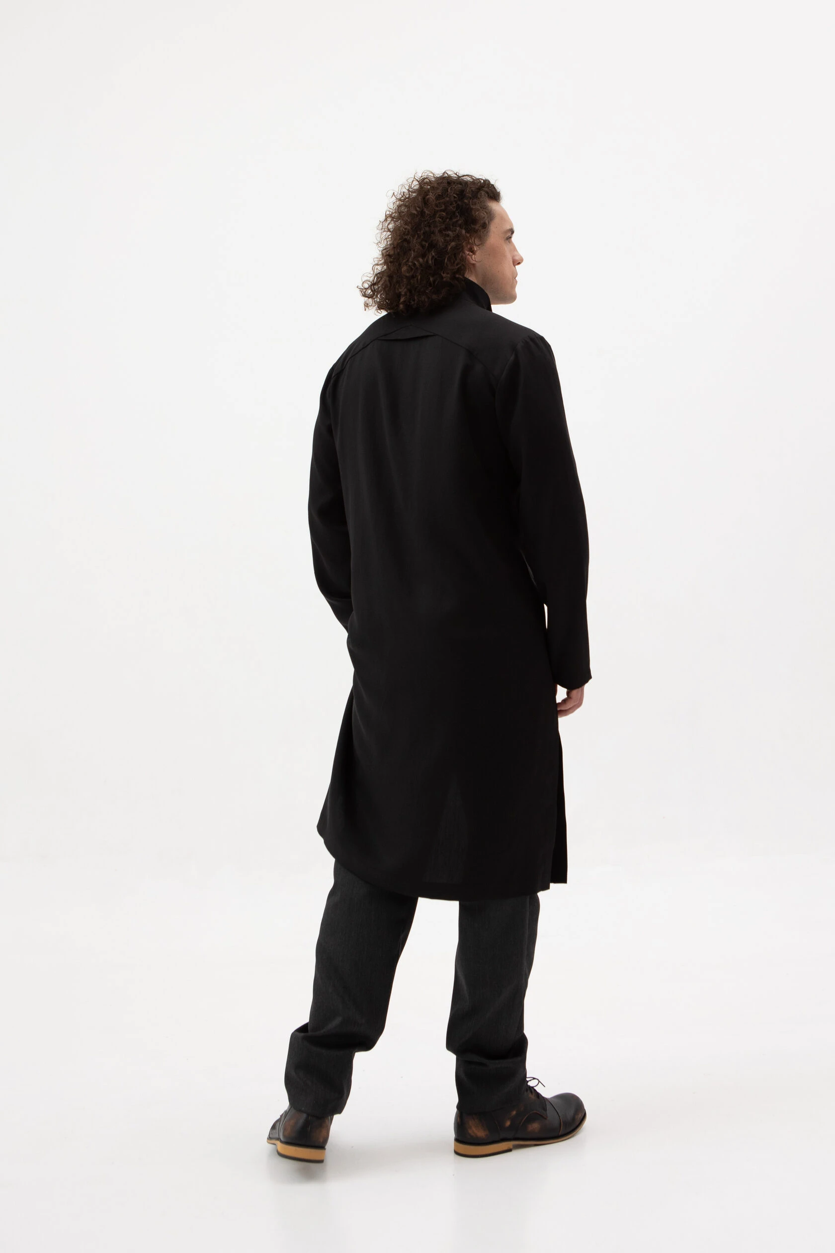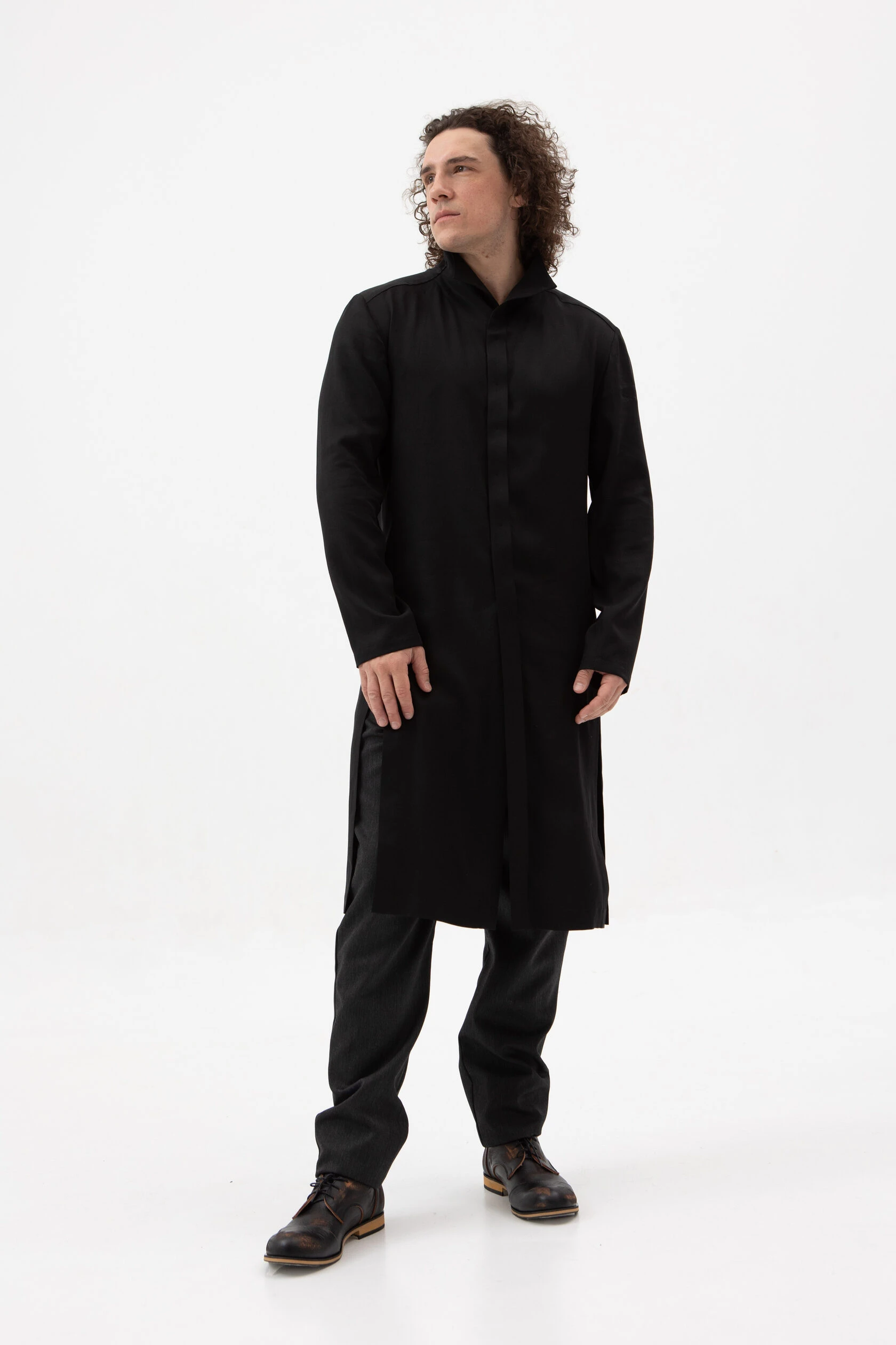 Длинная рубашка прямого, но слегка приталенного силуэта. Воротник — стойка высокий, цельнокройный. Рукав без манжета. Застёжка скрытая на металлических пуговицах.