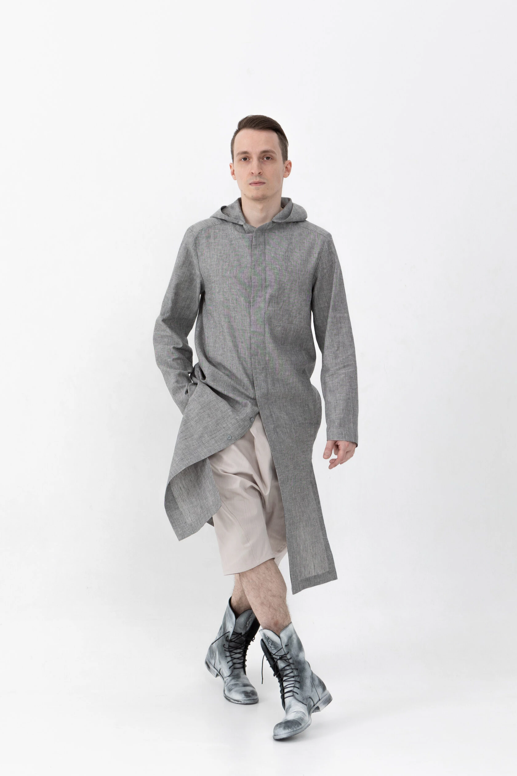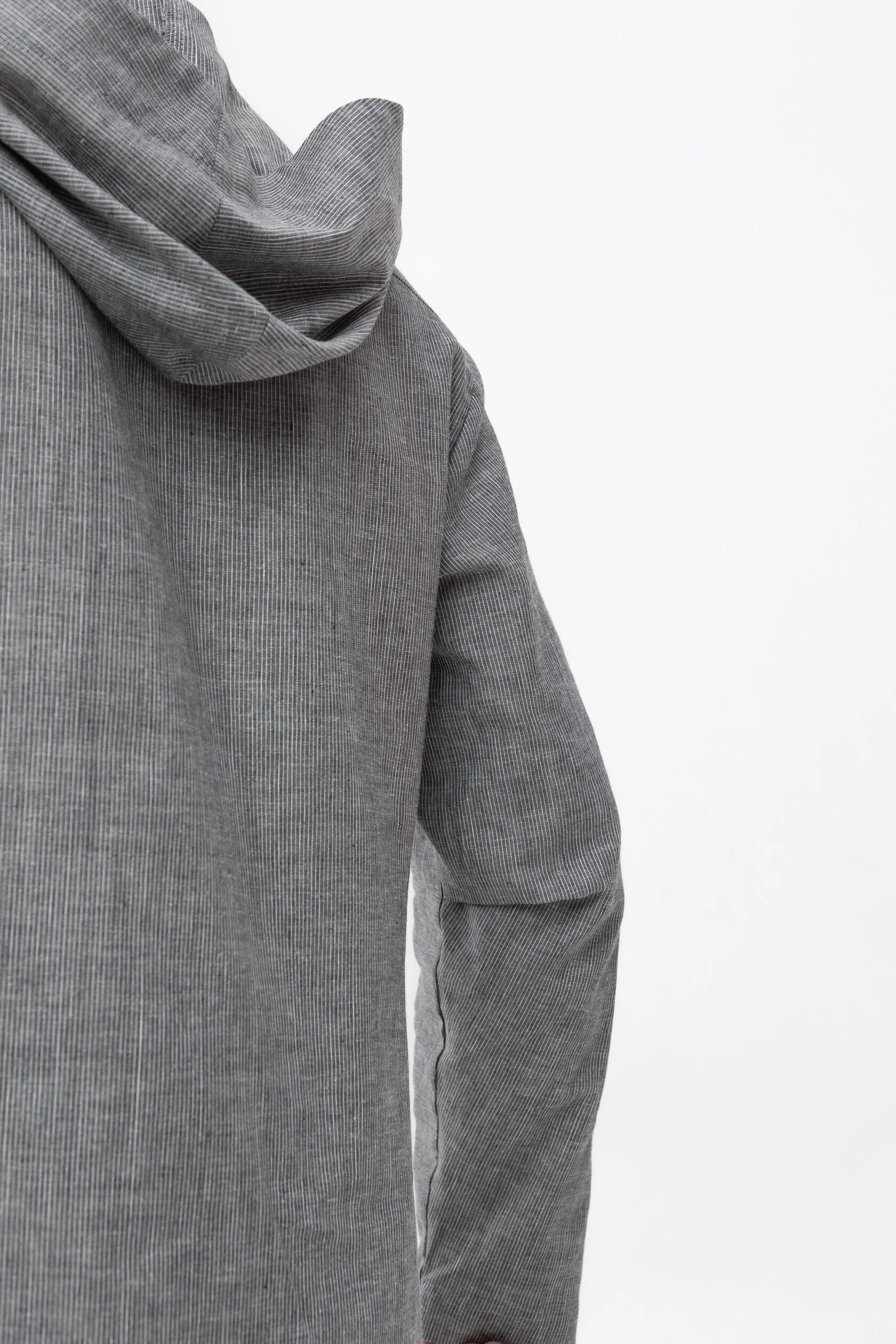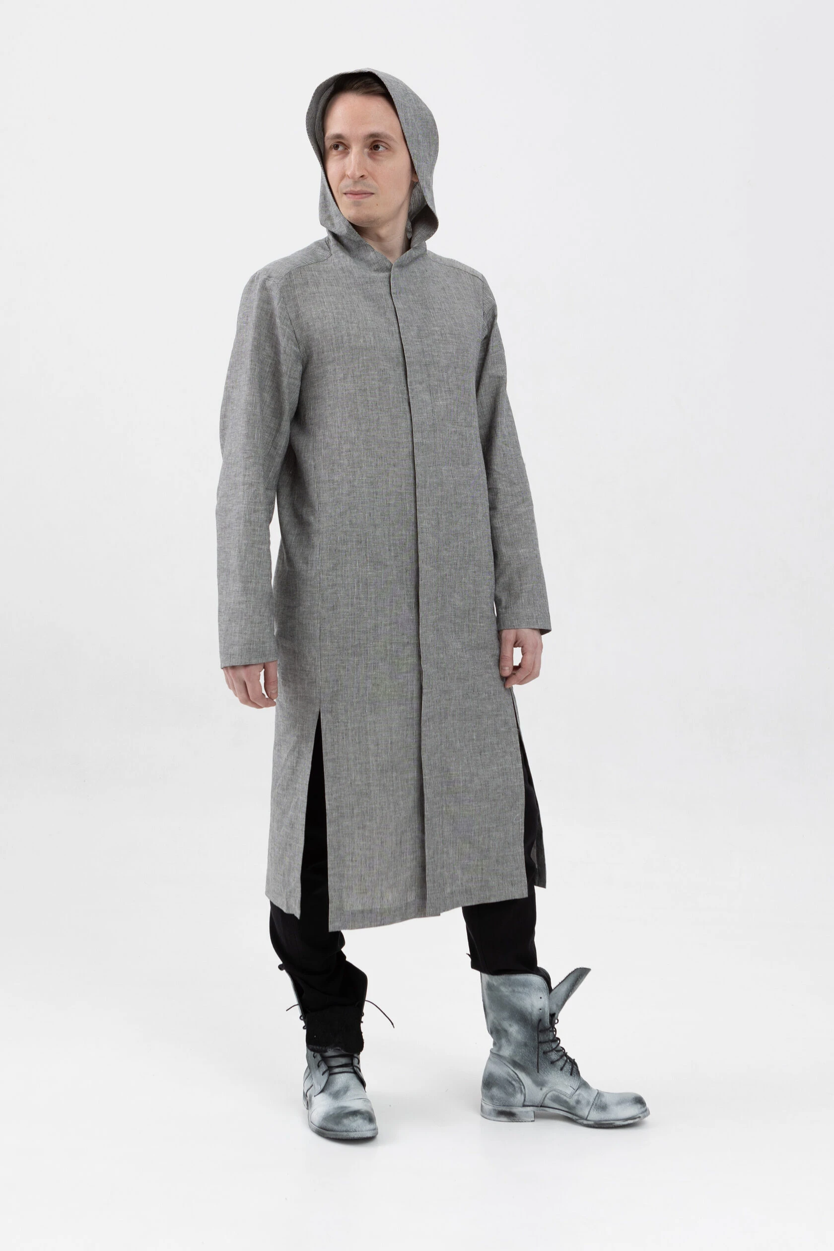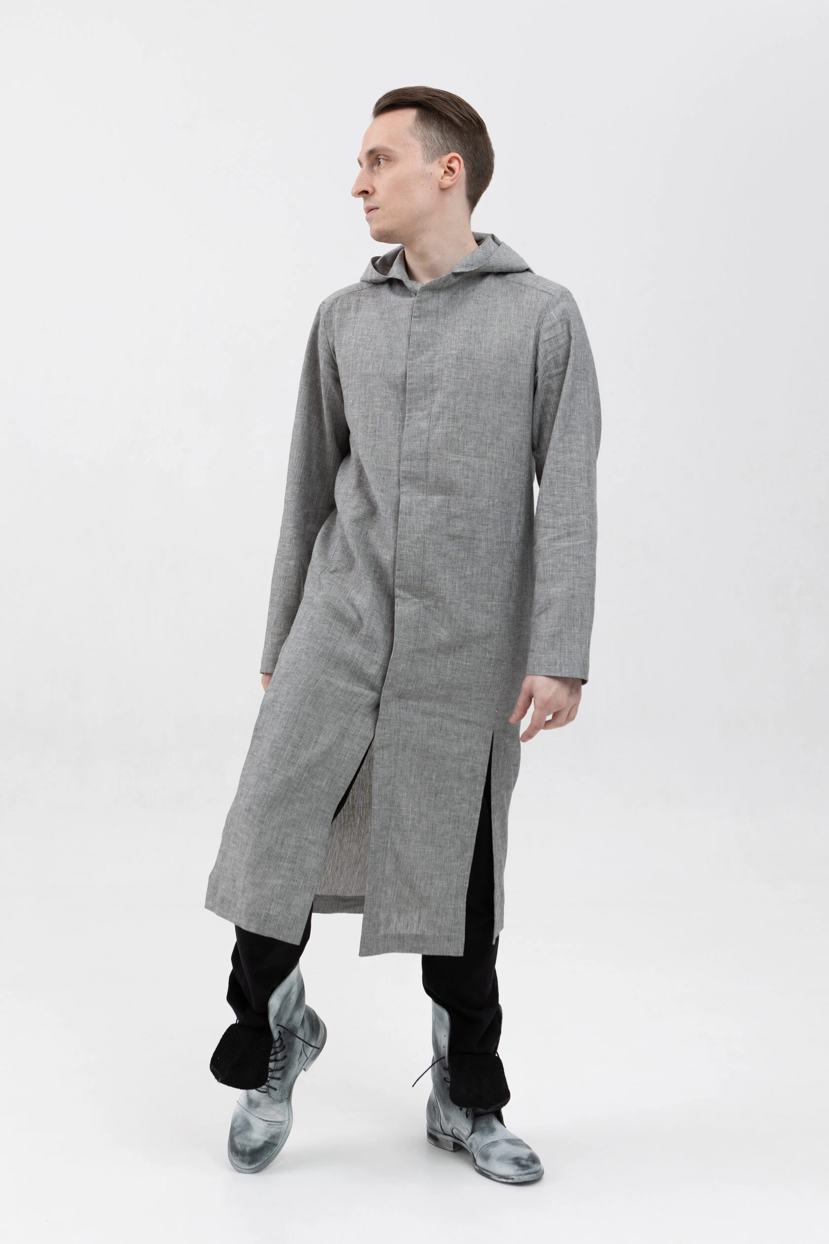 Длинная льняная рубашка прямого свободного силуэта с капюшоном.