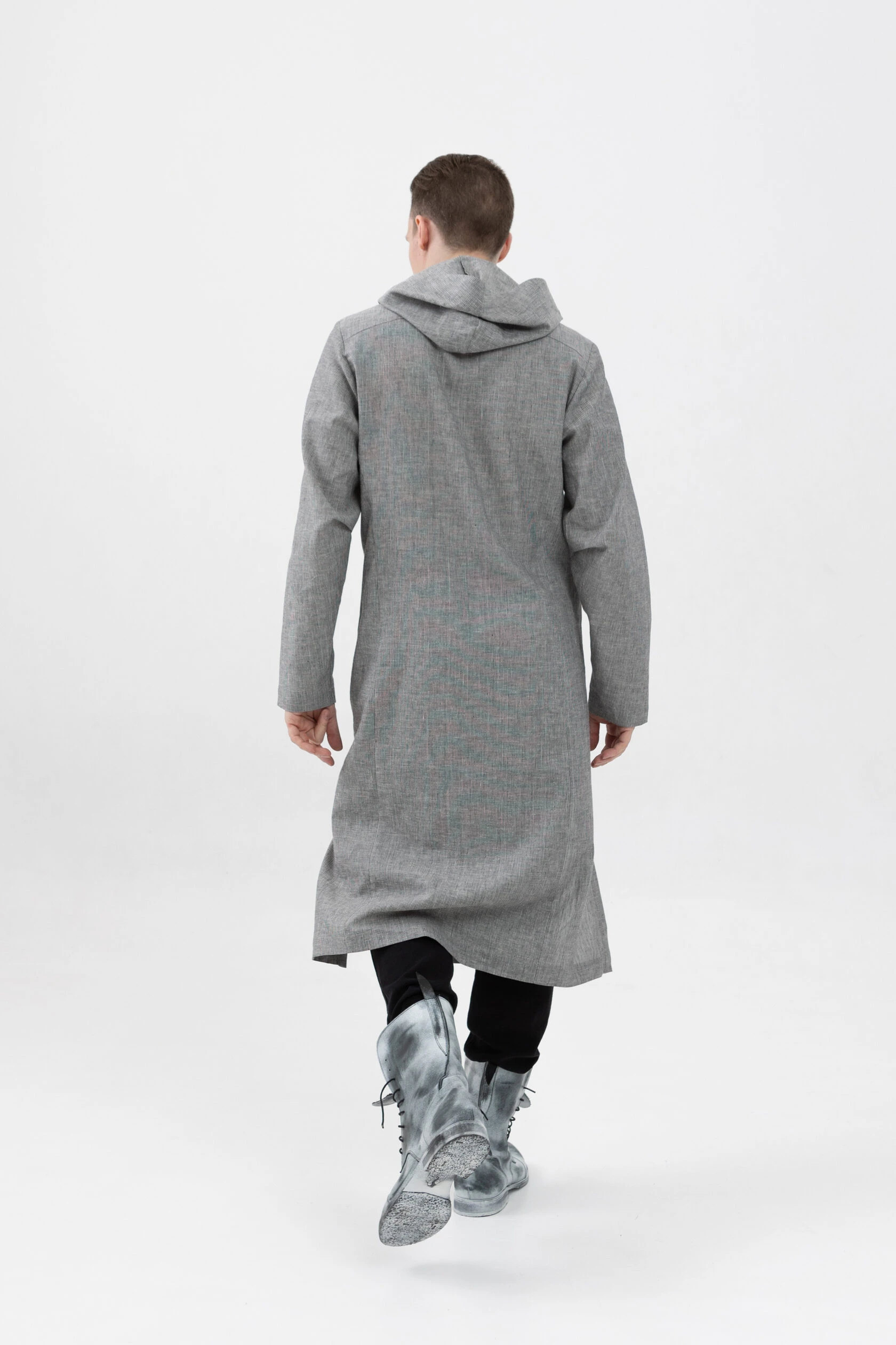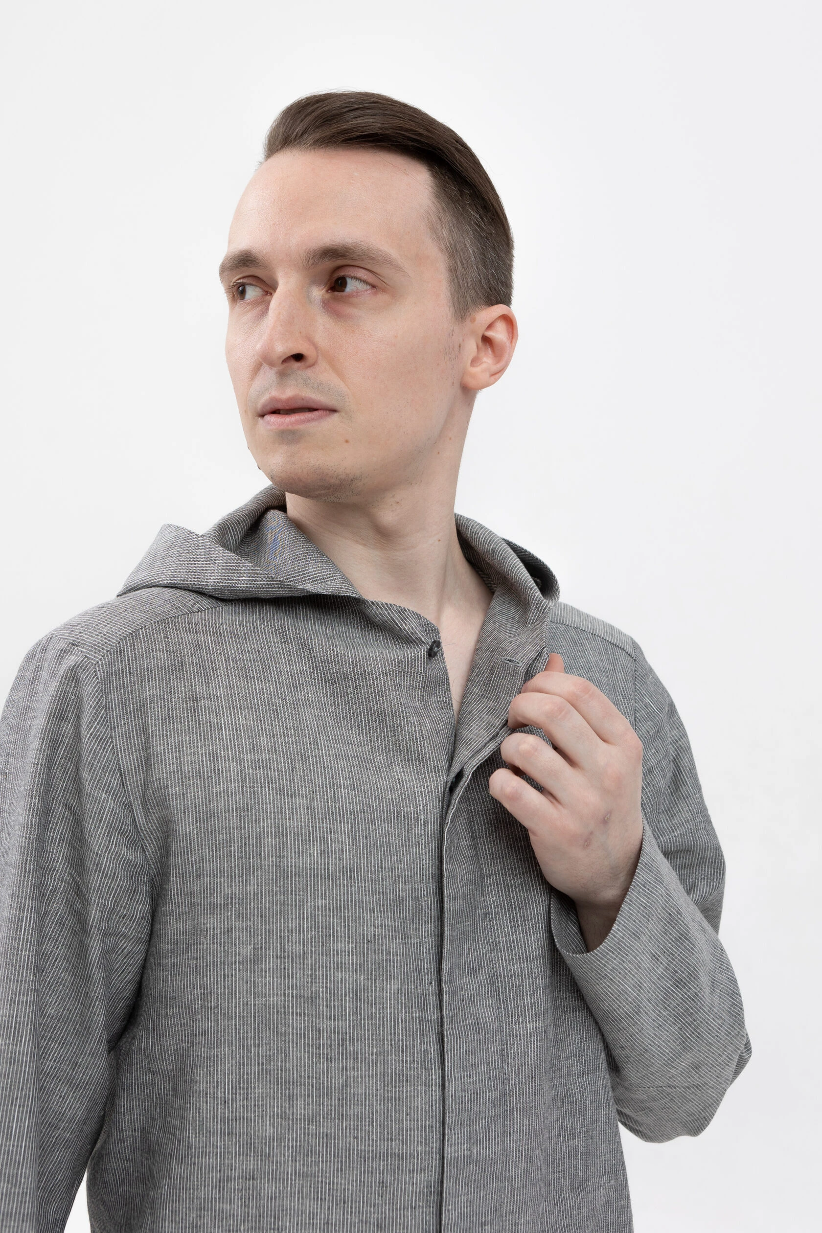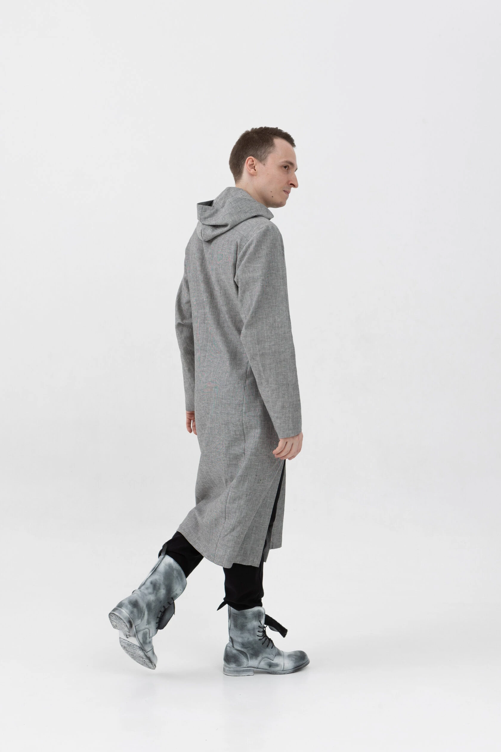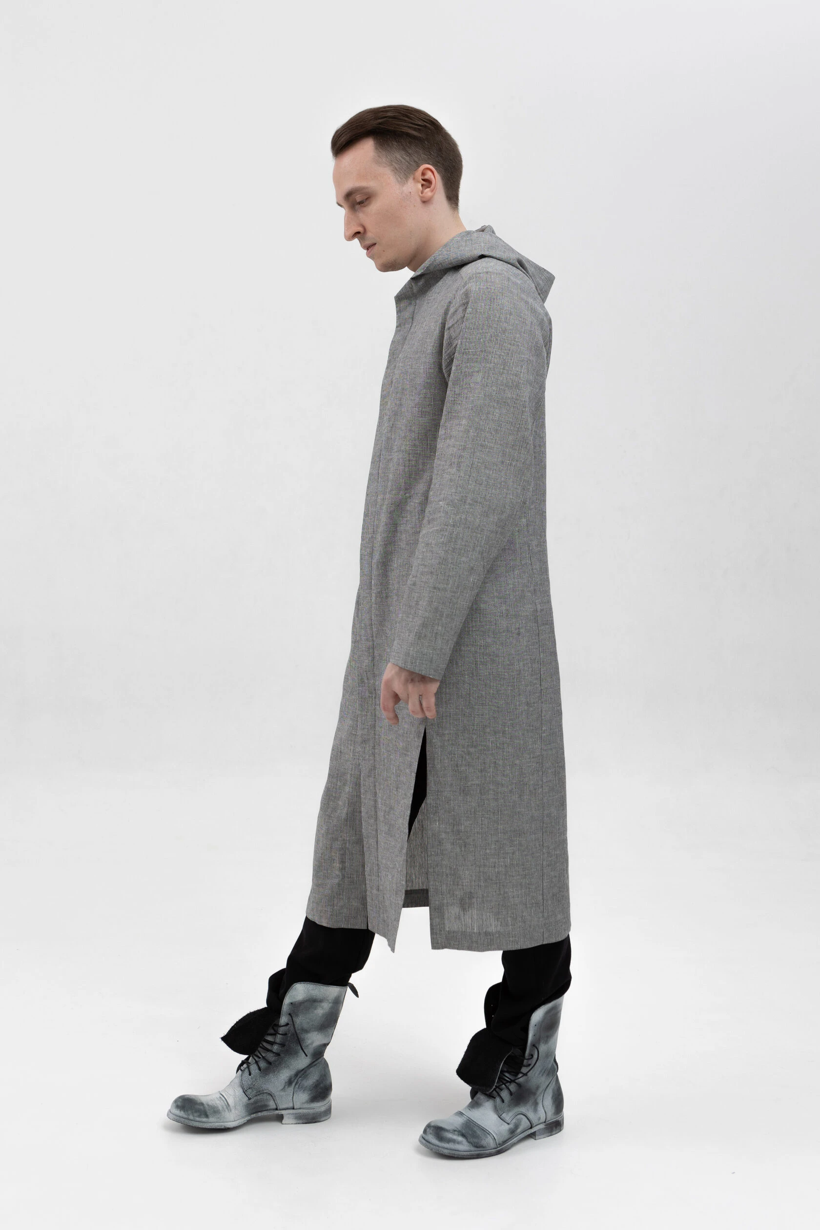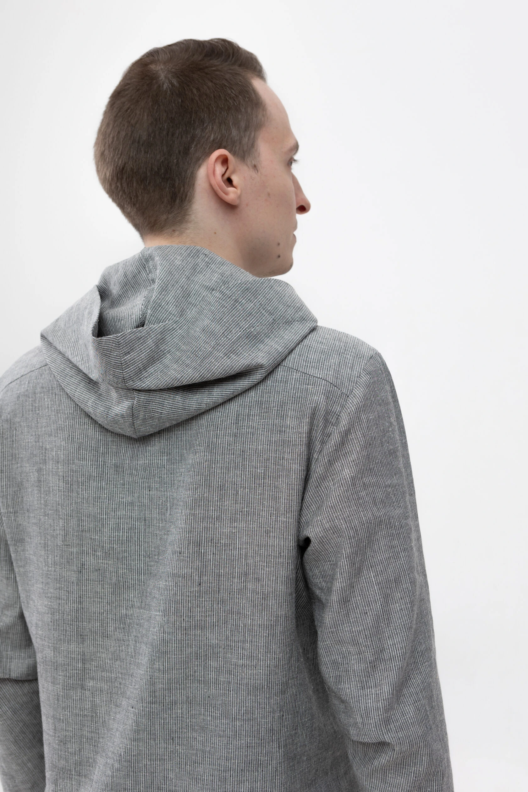 Длинная льняная рубашка прямого свободного силуэта с капюшоном.