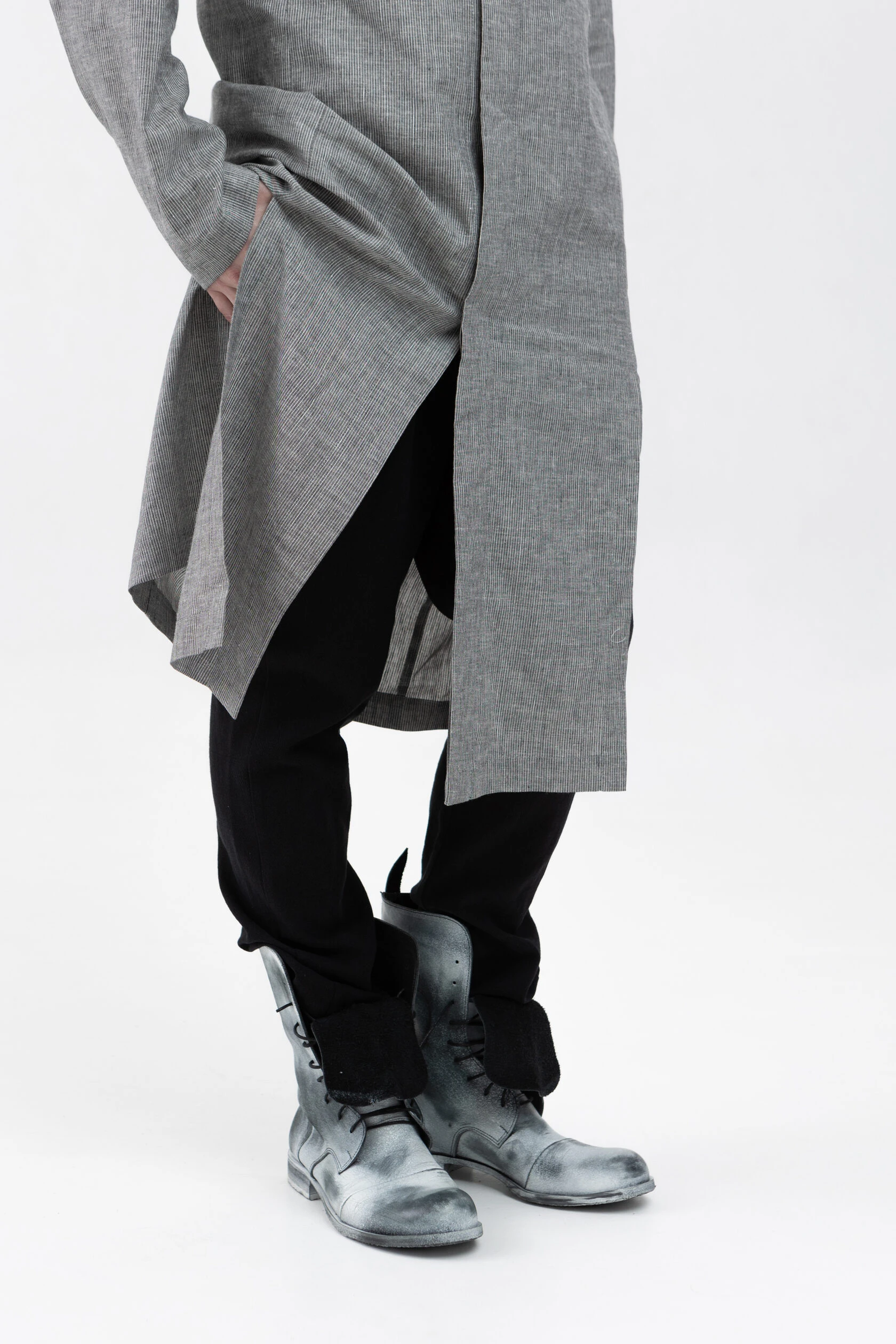 Боковые швы смещены вперёд, ближе к центру, и в них сделаны невысокие разрезы, чтобы легко залезать в карманы брюк.