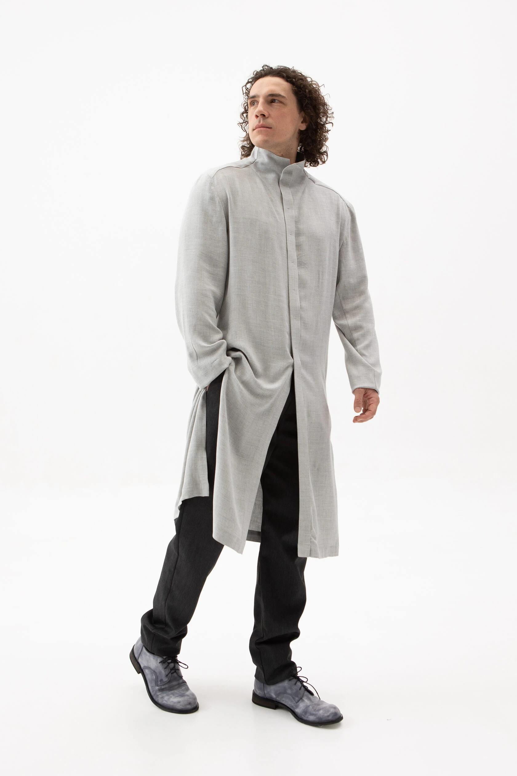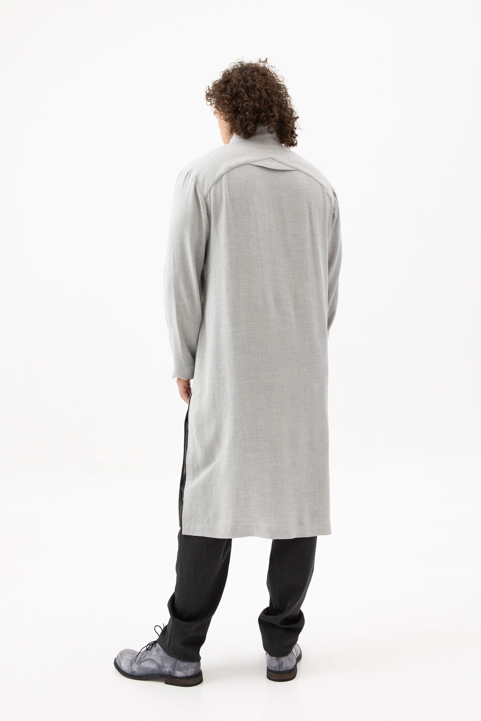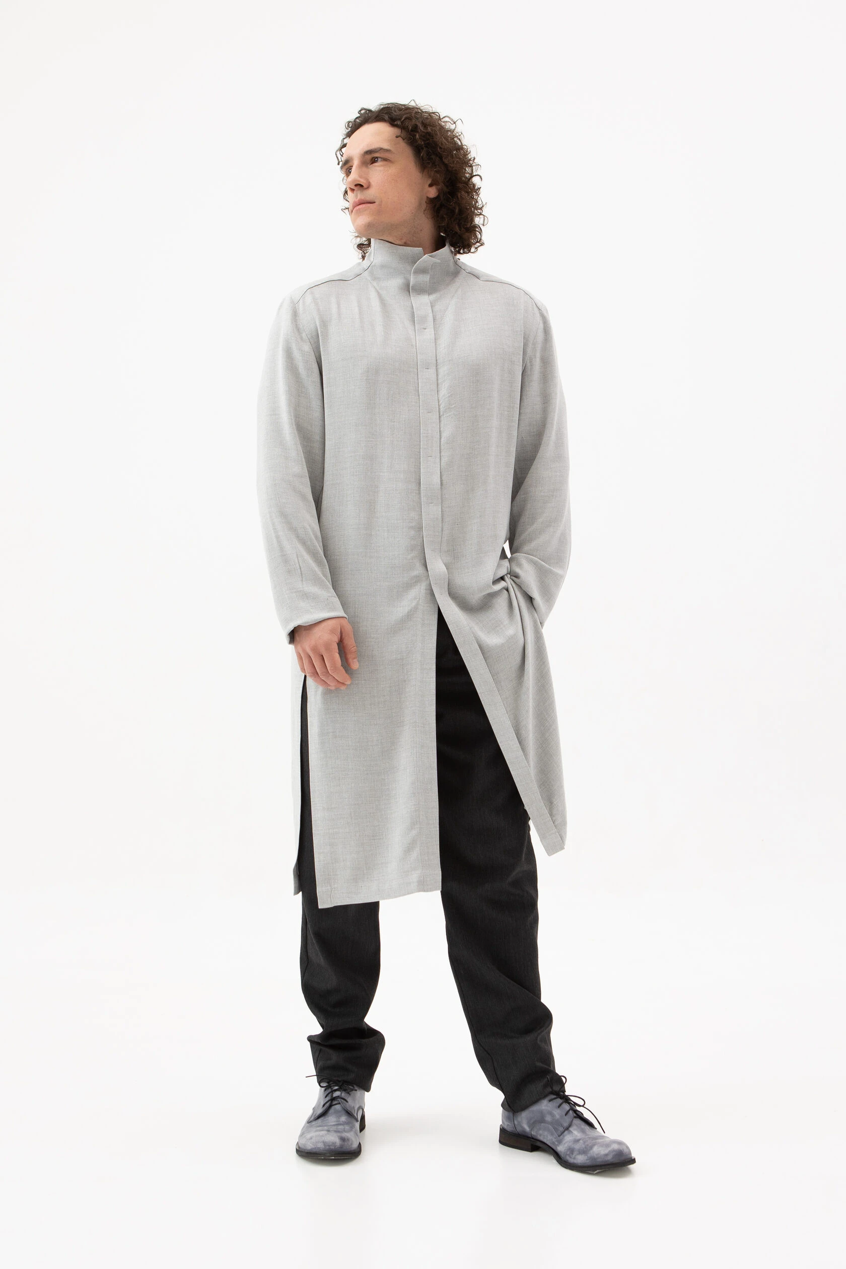 Длинная рубашка прямого, но слегка приталенного силуэта. Воротник — стойка высокий, цельнокройный. Рукав без манжета. Застёжка скрытая на металлических пуговицах.