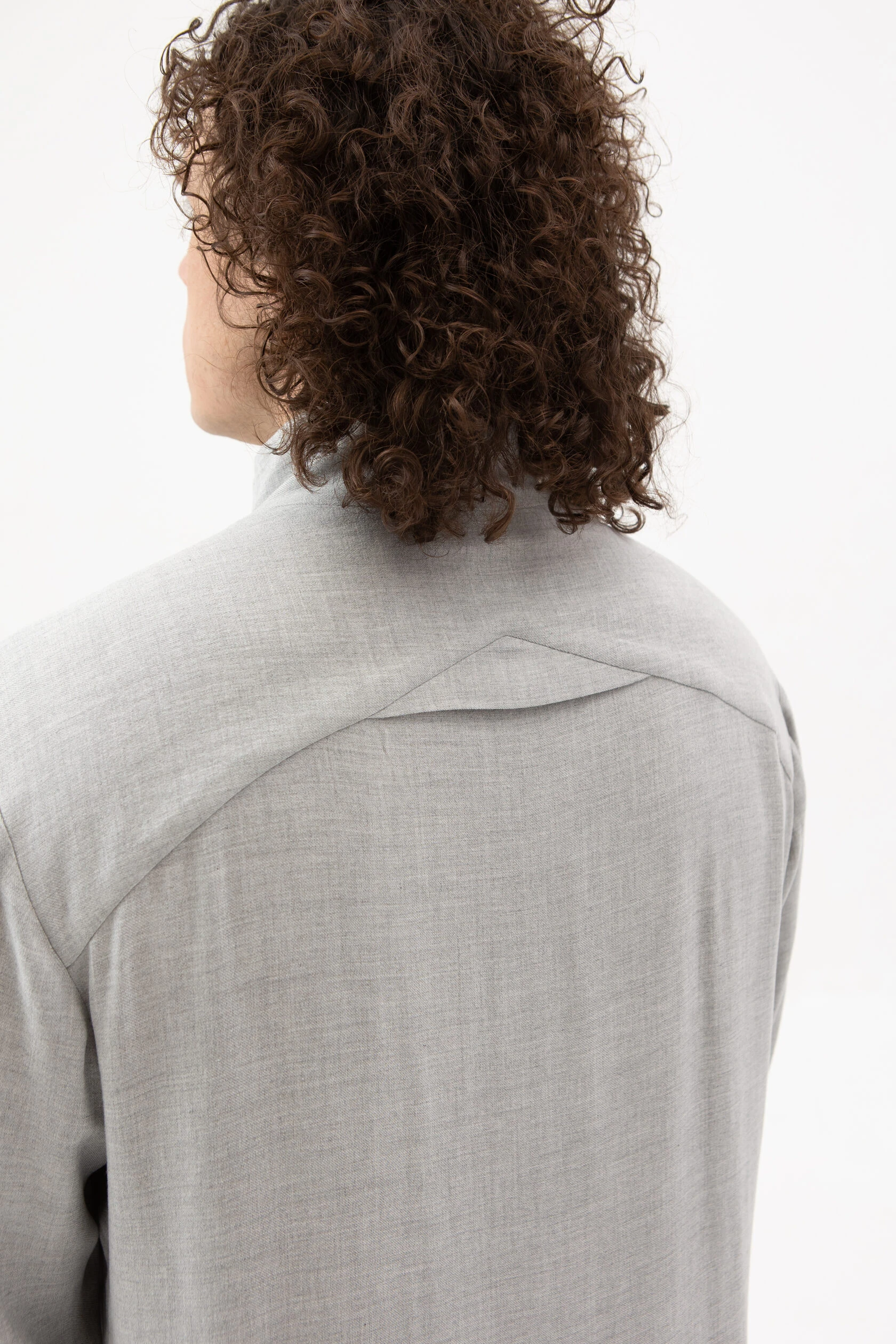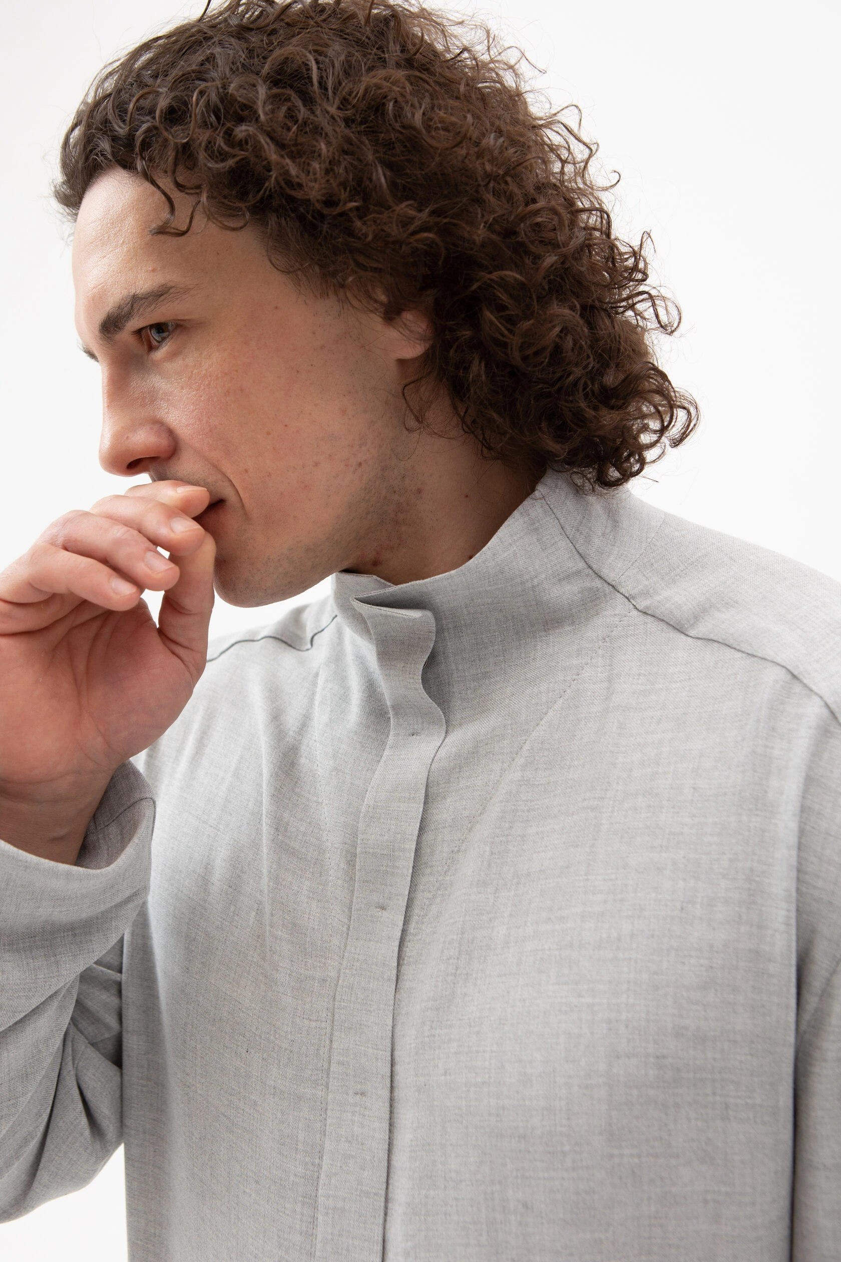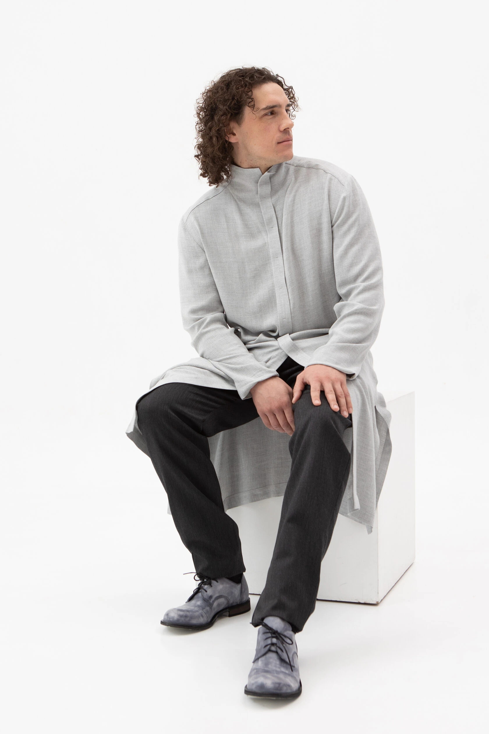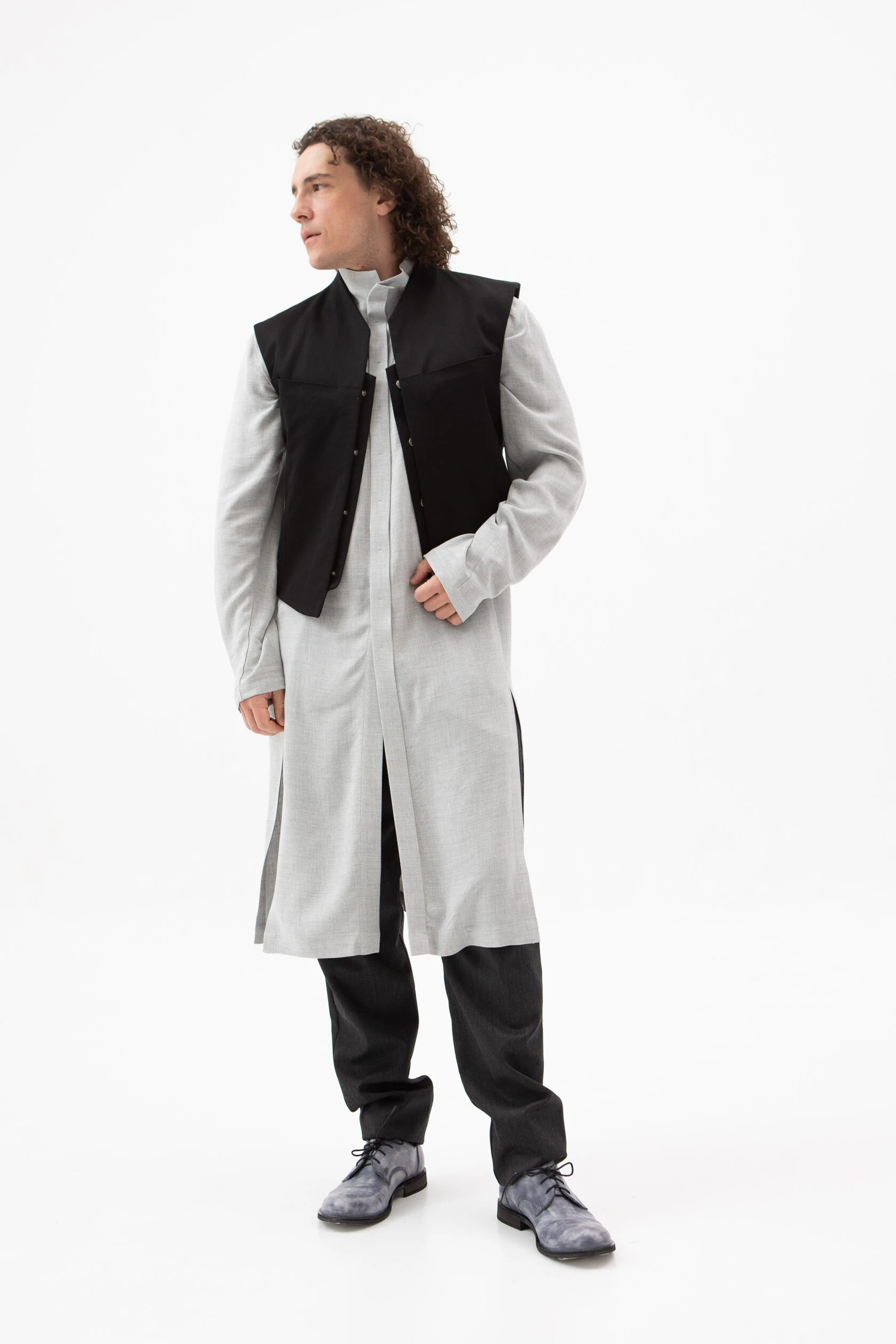 Длинная рубашка прямого, но слегка приталенного силуэта. Воротник — стойка высокий, цельнокройный. Рукав без манжета. Застёжка скрытая на металлических пуговицах.