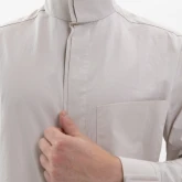 Полуприлегающий приталенный силуэт. Воротник-стойка довольно высокий: выглядит строго, но не сковывает движения.